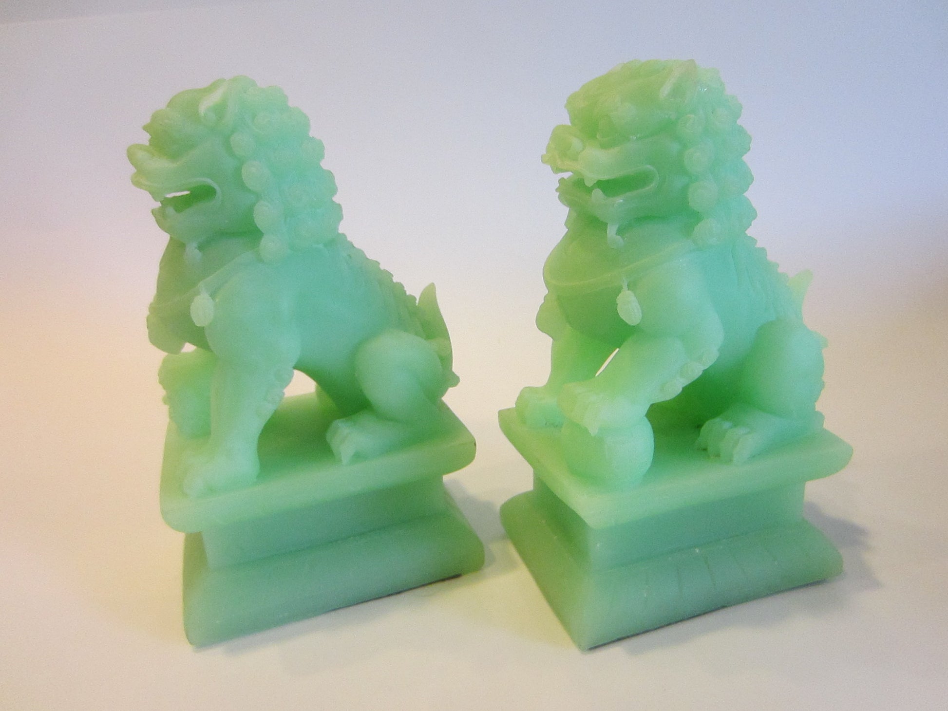 To decorate your library, book case, or tables, with these attractive protective foo dogs. The softness of greens on this composed stone like lions, are breath taking. there are a pair, identical, with black covered velvet like bases. Decorative, wearing necklace, and as they say, they are protective lions. Excellent condition, with 7" Heights, about 4" x 2.75" rectangle bases.