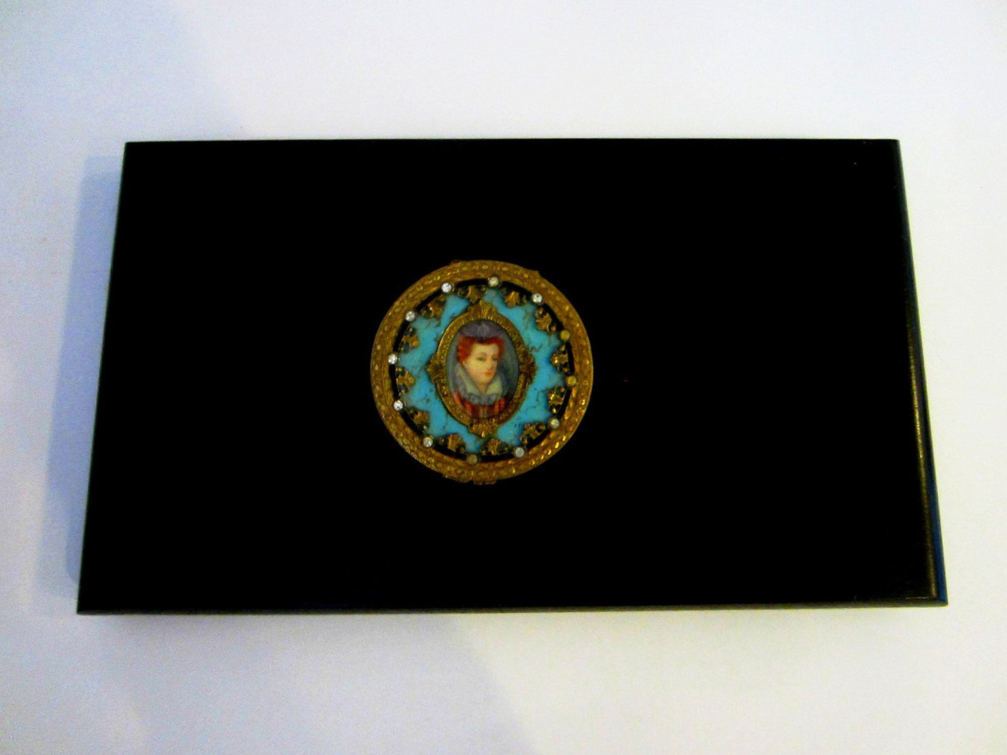 a beautiful little jeweled mirrored compact, in bronze & champleve. from Victorian Era, and is made in Italy, noted in engraving base. Decorated blue, in soft, dark enamel. white mini stones. Impressive floral chasing, engraving and execution. an oval hand decorated, painted in gorgeous colors, portrait medallion on the center. the interior has silk removable puff. in fabulous aged condition. 2" d.