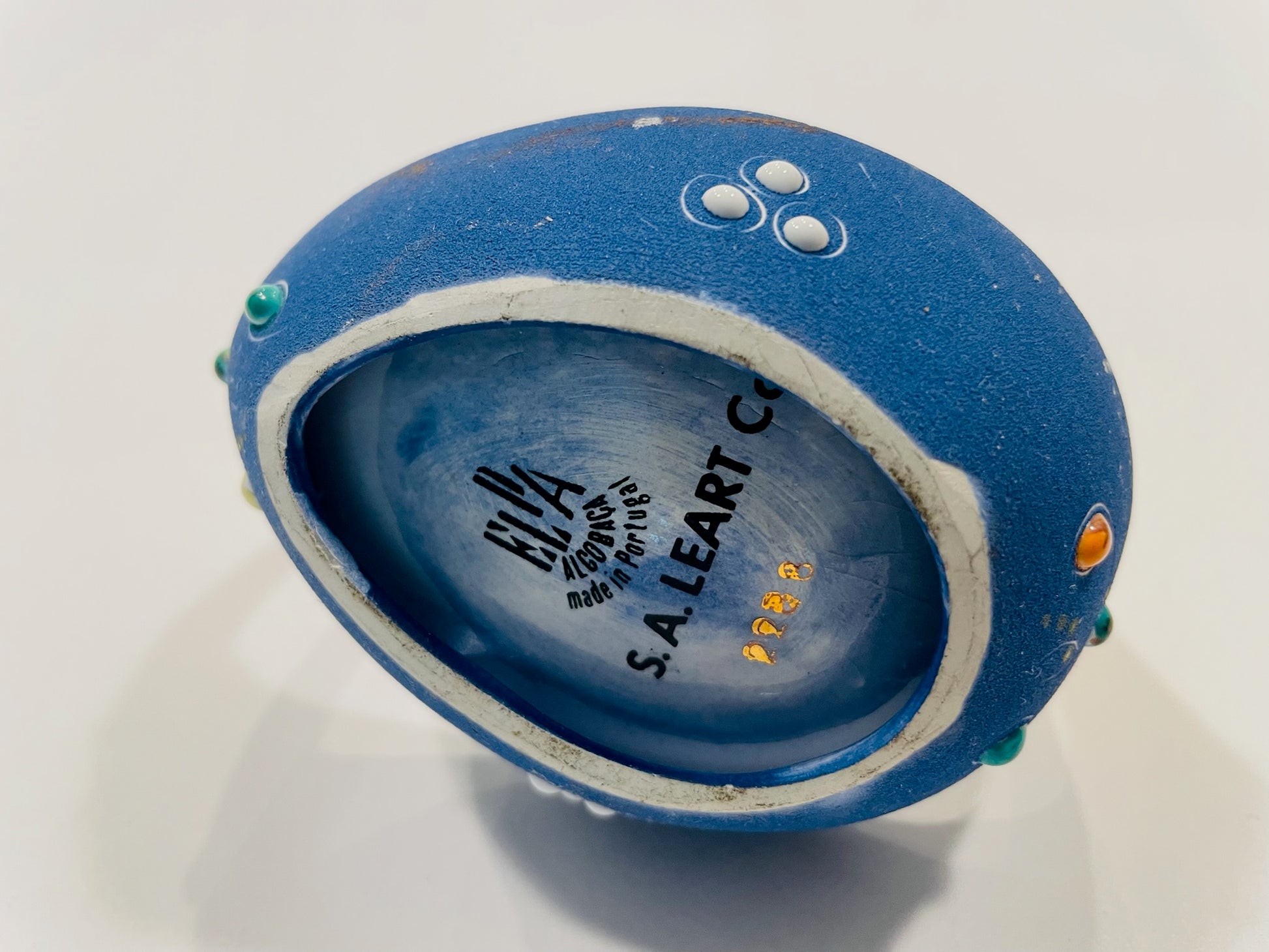 The blue oval shape vintage basket with gold handle is stunning. Decorated with colored flowers enameling in relief. Made by SA Leart Co. The Elpa Alcobaca in Portugal. Flowers are orange, green with blue and white hand painted branches. Textured, unglazed. Oval shape. A carrying handle slightly raised base. Excellent condition, with signs of aging. Marked in stamp and gold. 3" h. x 3.5" w. base 2.5"