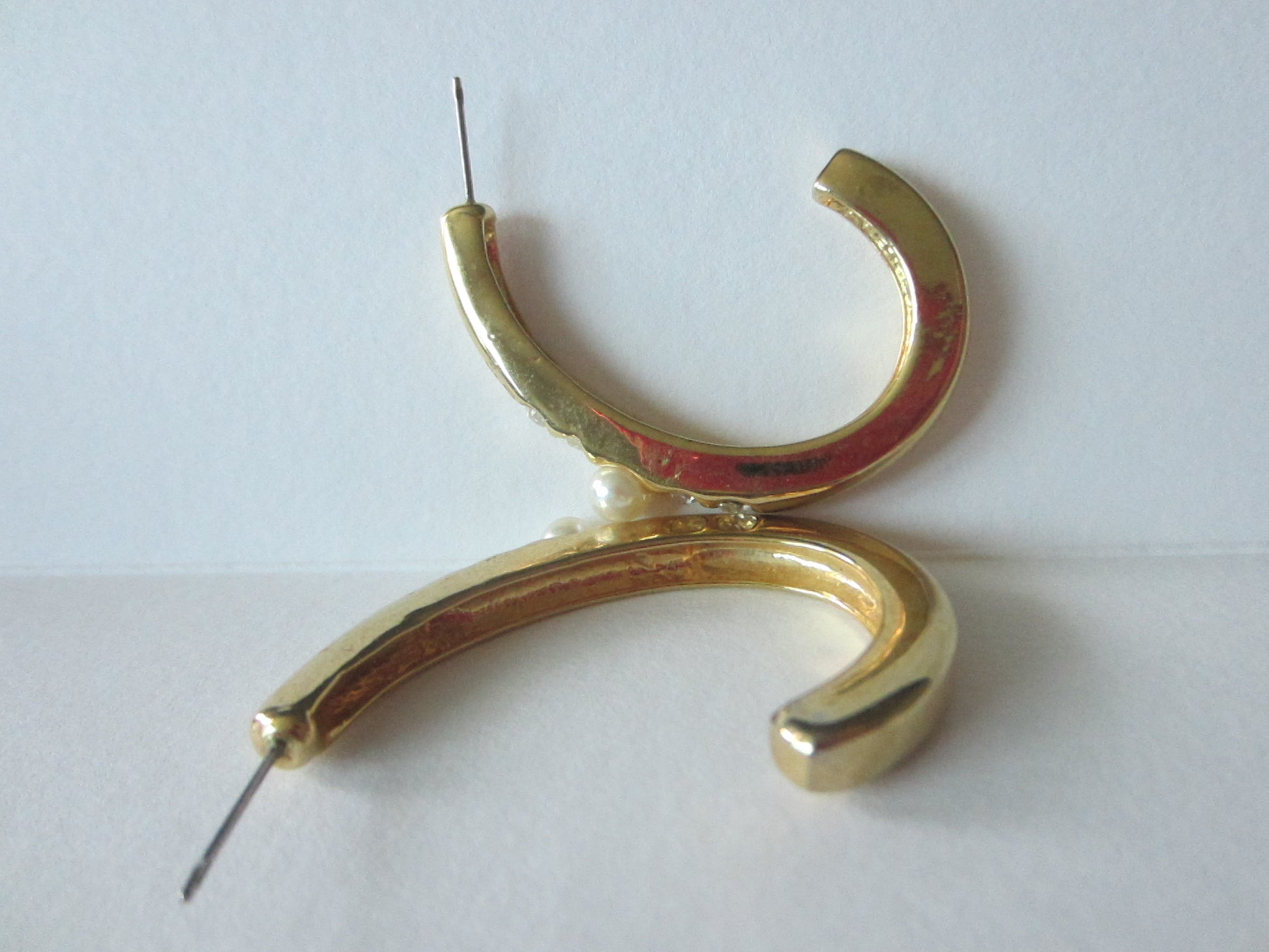 stunning, modern, trendy, croissant semi circle hoop earrings. For pierced ears, all in tact, about 1.5" decorated embellished with shiny crystals and pearl beads. Post we provide by request. excellent, golden. Mother's day surprise gift.
