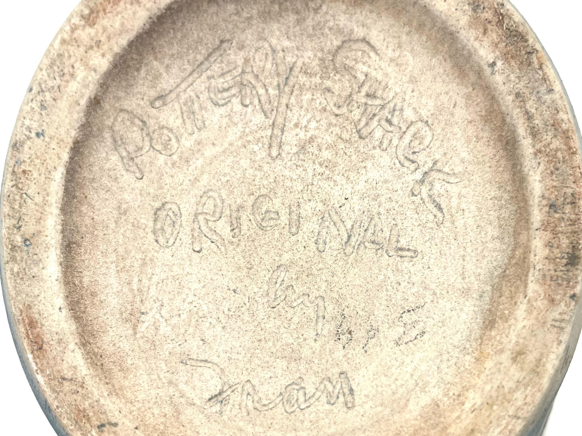 The blue & triple texturized gold rings, are a beauty. Ceramic vase of Pottery Shack Original, possibly by the artist similarity to Jack Taylor, in cursive black hand writing , in Laguna Beach, California. Signed, copyrighted, marked in etch on the base of this gorgeous pot. The condition is excellent, and the signature yet to be verified. Smooth interior, turquoise color of blue, and gold.