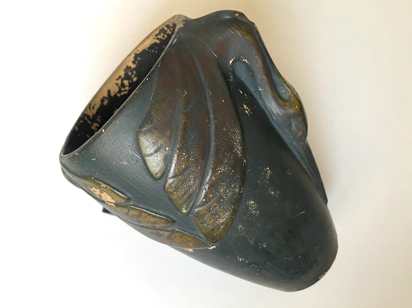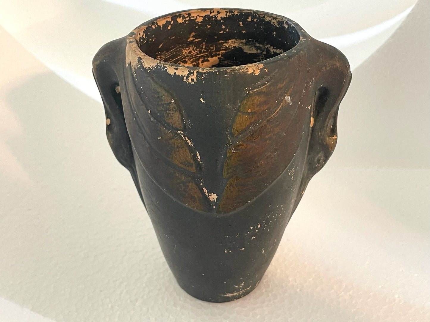 Super distressed, with attractiveness this charcoal black painted ceramic vase. Decorated Backward golden swans on sides, inspiring handles. Extreme distressed Paint ware , no appearance of cut or chip. It has flame marks, in relief with number. Highlighted images shows the unverified markings and production number 629. Believe to be Vintage Waco.