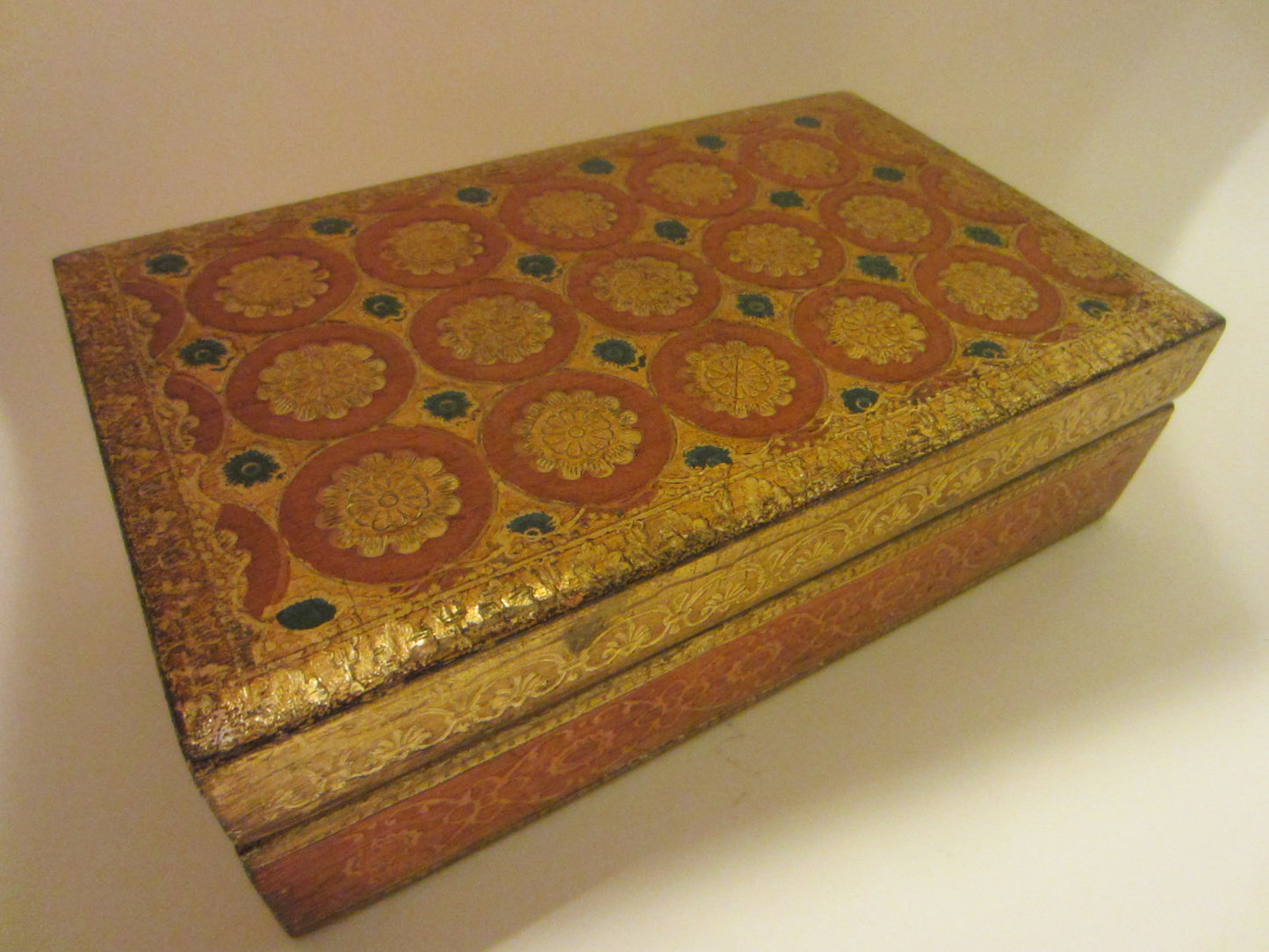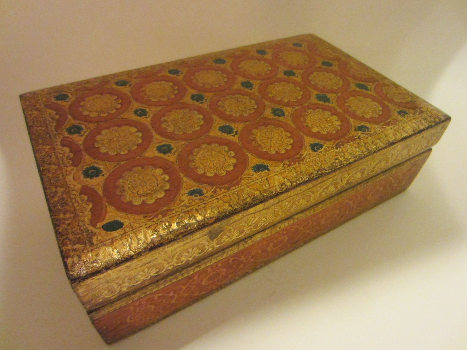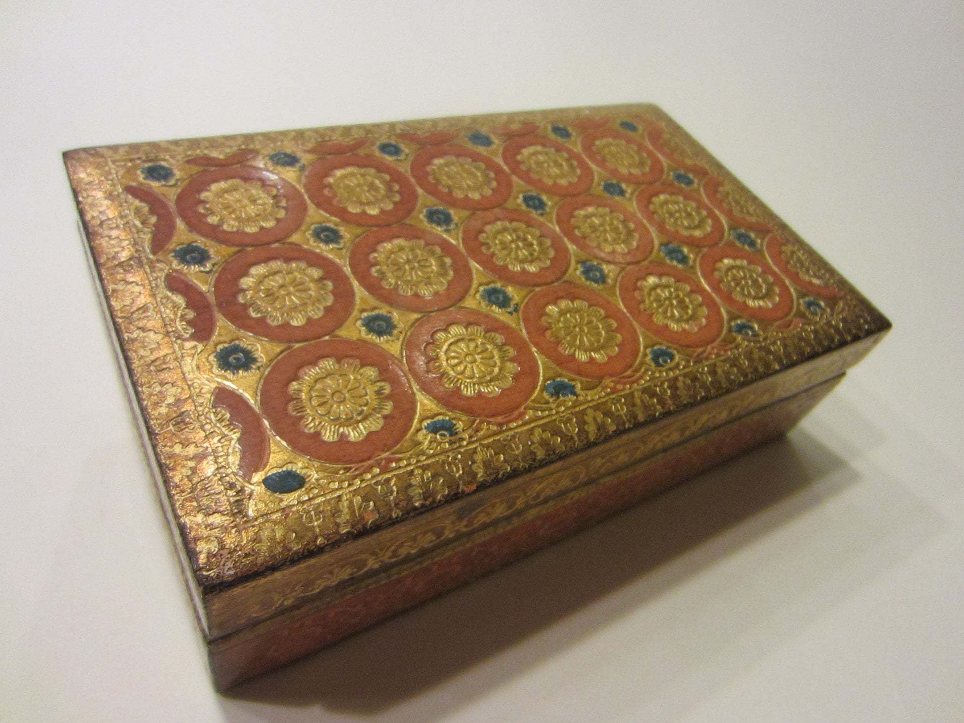 it's truly gorgeous. a gold box of wood made in Italy " A Decorative Craft Florentia Hand Made" is carved and created, to decorate and enjoy on any surface, tables, sides, cocktails. a beautiful round terracotta circle with pop of rosette medallions, and touch of blue bloom flowers are remarkable. marked, numbered, initialed in engraving, and label. aged, and excellent, with patterned base.