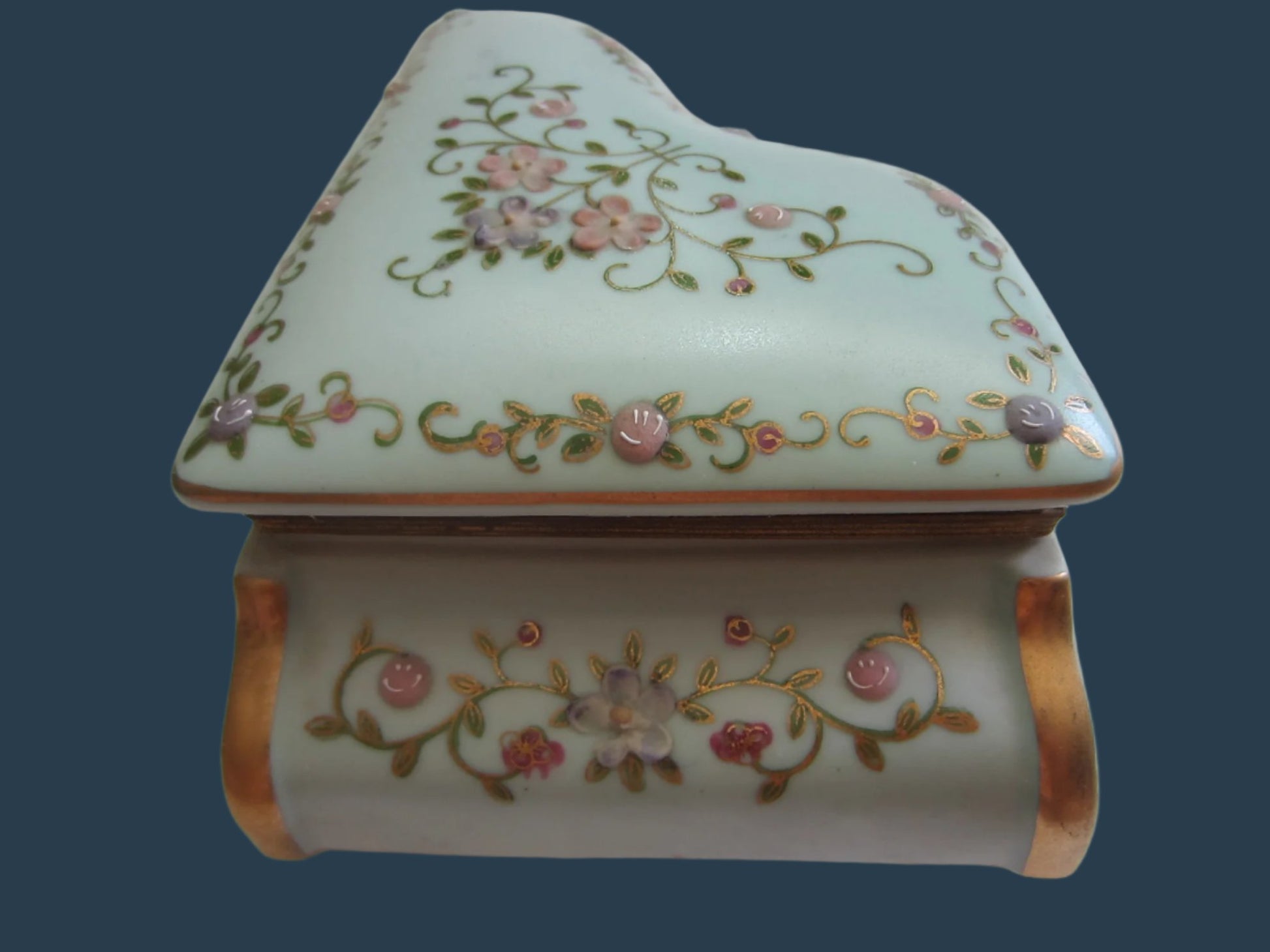This porcelain very likely French piano box, is so beautiful that takes your breath away. The color of French, Italian light blue. Hand painted, gilt decorated, colored micro flowers. The colors of light pink with gold scrolled, on the edges, and the foot. Covered Jewelry Box with bronze hardware. The sticker labels on the base are vanished, and could not be identified. . Footed, raised and designed. The sentiment , large enough to keep heirloom jewelries on the vanity or table top. Chocolates to entertain your guests. Excellent condition, white interior, free of any chip, craze or cut. French or Italian but acquired in US in recent days.