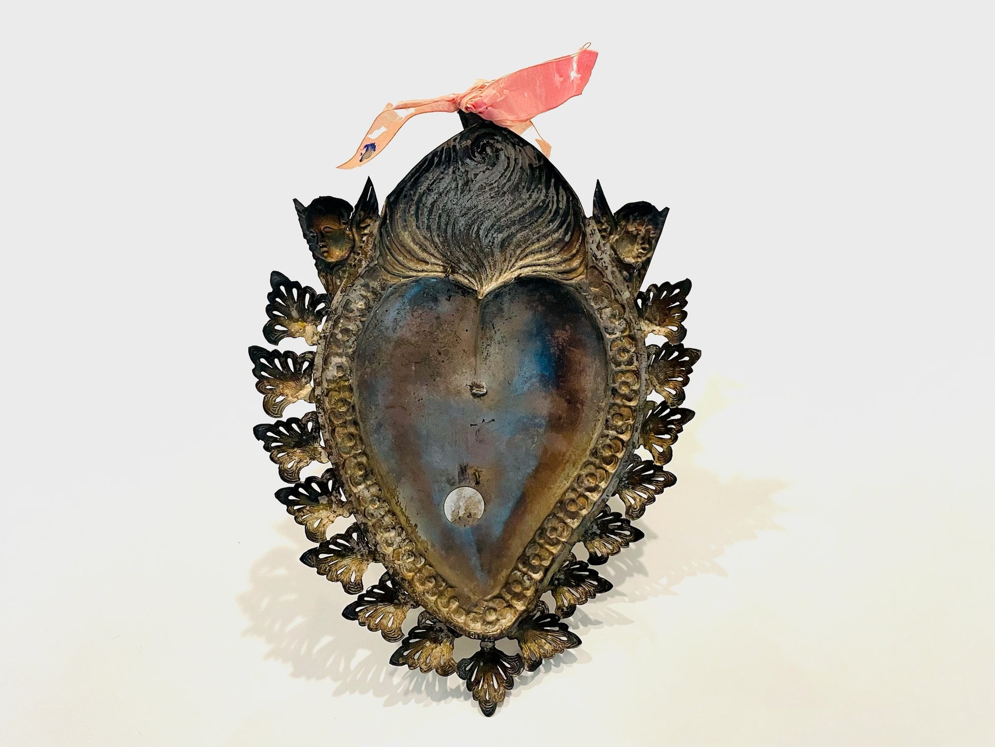 Super warm, beautiful sacred heart, Ex-Voto came from antique shop in Florence, Italy, acquired decades ago. A silver plated heart with incredible ornamentation , and natural patina. The condition is excellent, with sign of aging. GorgOverall eous wall decor, conversation object and desirable design element. Symbolizing Holy Spirit, inspiring upcoming holiday. Monogram relief. Symmetric Angels, cross on top.