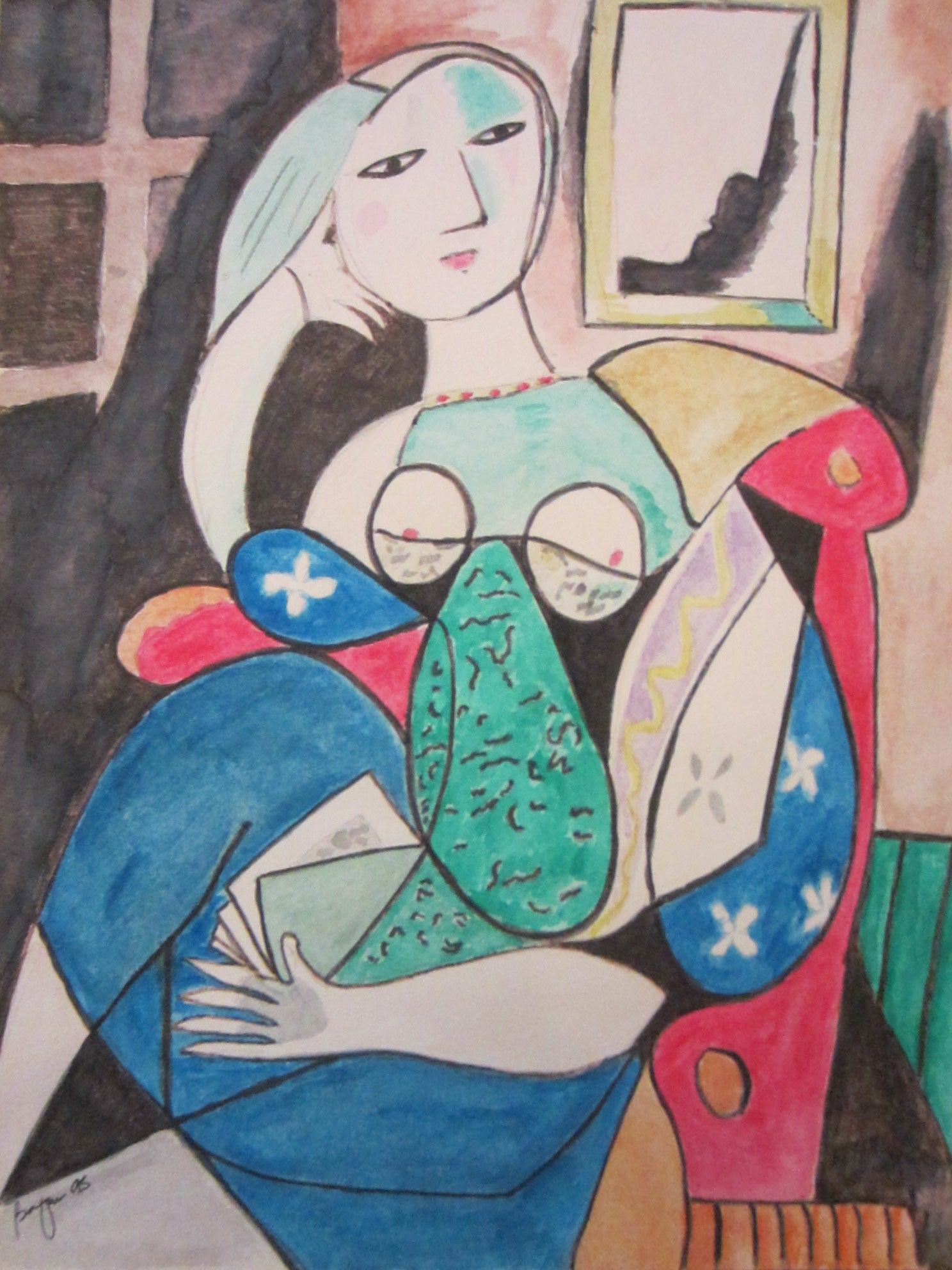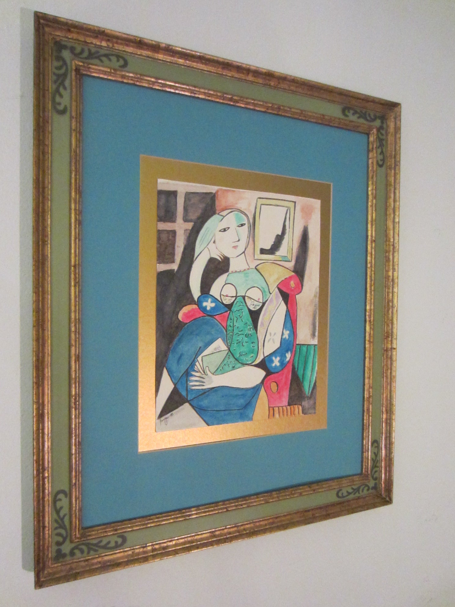 An exuberant, bright colors on abstract contemporary cubism watercolor gouache illustrated, with a subject matter seated woman. Signed Bryan 95. Happy, contrast, blue, pink, yellow, soft and bold blue green, black ink likely drawn. Geometric art, adorned in blue hue cardboard mat, gold accent, and the incredible decorative gilt and green wood frame. The art is in fabulous excellent condition. Art & Fashion for Decorating ! Glass cover will be included. The Frame and Mat has been updated.