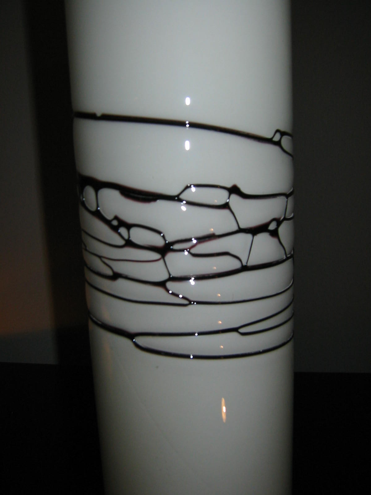 Fabulous, abstract tall milk glass vase, egg plant glass relief, artisan hand craft. excellent condition, 16.25" h. x 4" w., about 1.5" open top.. from post mid century era.