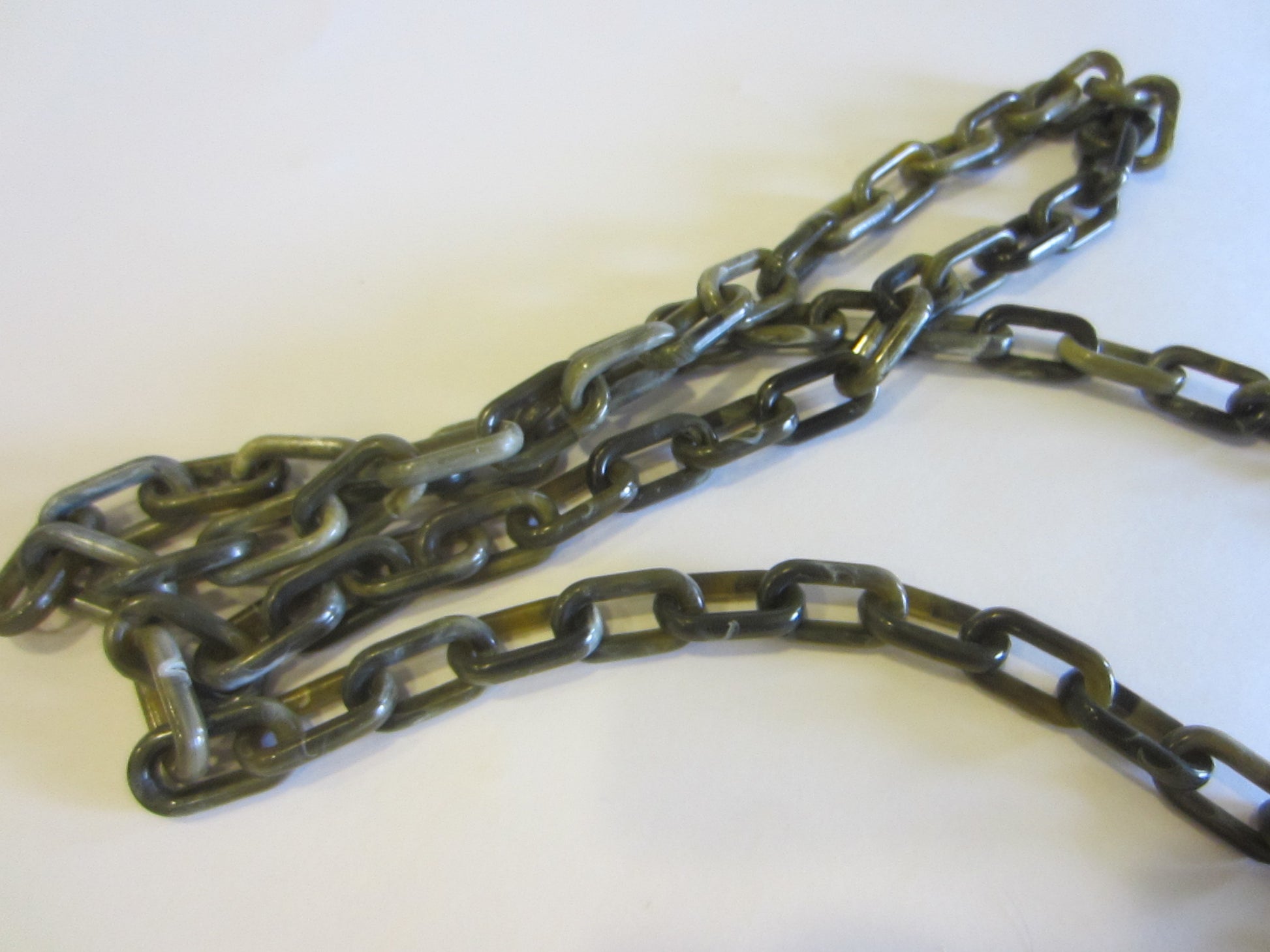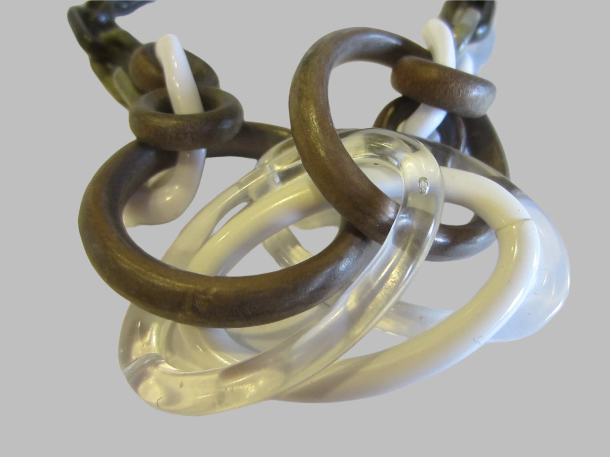 Designer, Alex & Ani Copyrighted, versatile necklace, long, with geometric oval, circular, rectangle knots. Excellent condition, with tiny tag mark, engraved, attached. Tortoise, brownish, cream, grayish, and white. circles, and ovals. Made of celluloid / plastic. Fashion Statement, lightweight. Reminder Style of Retro Courage of France.