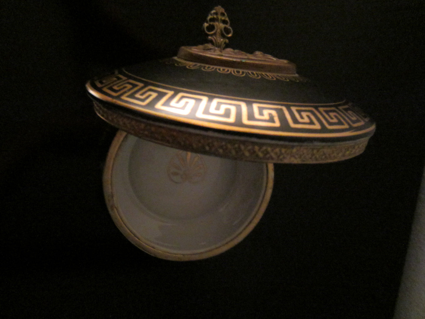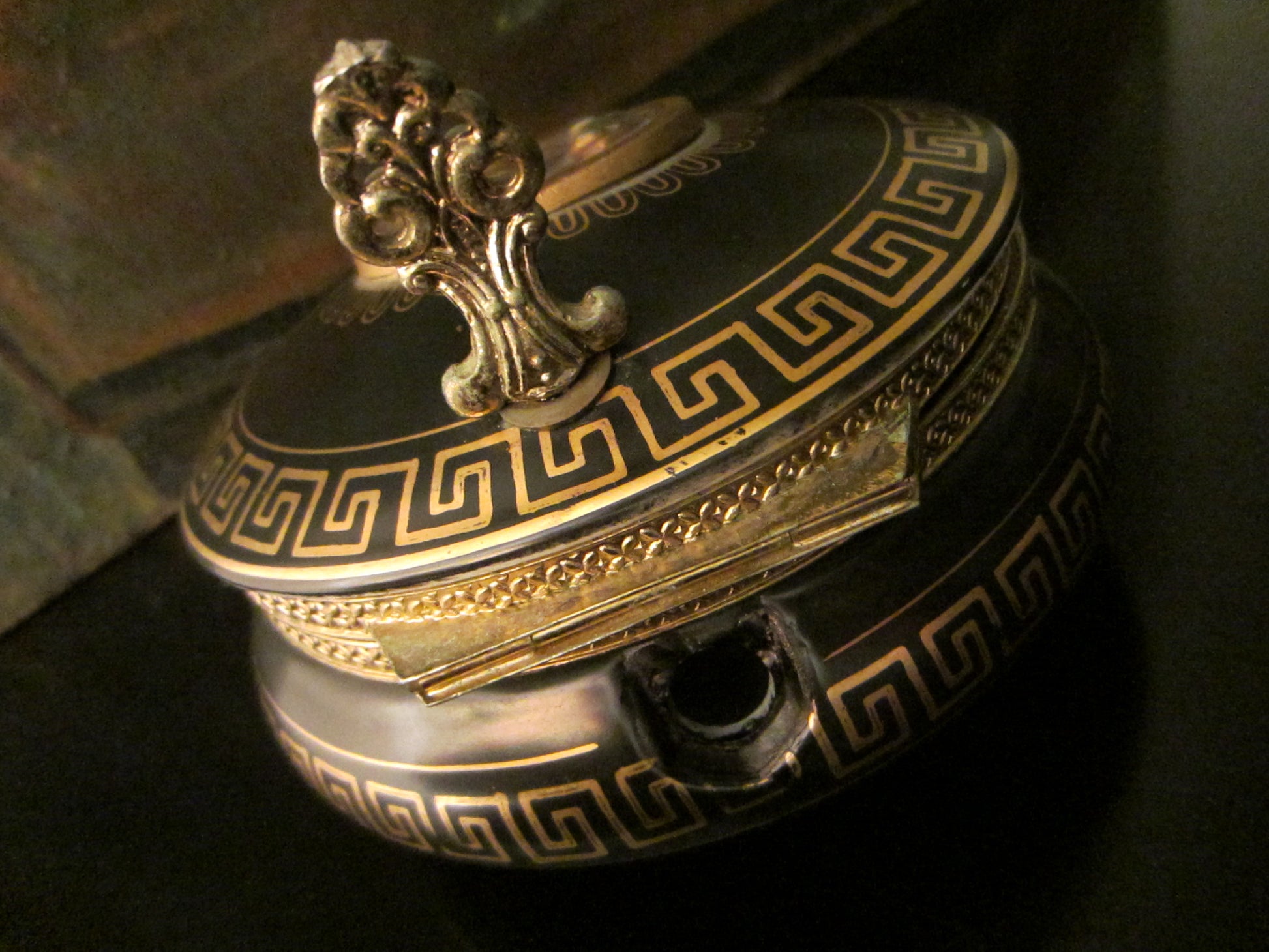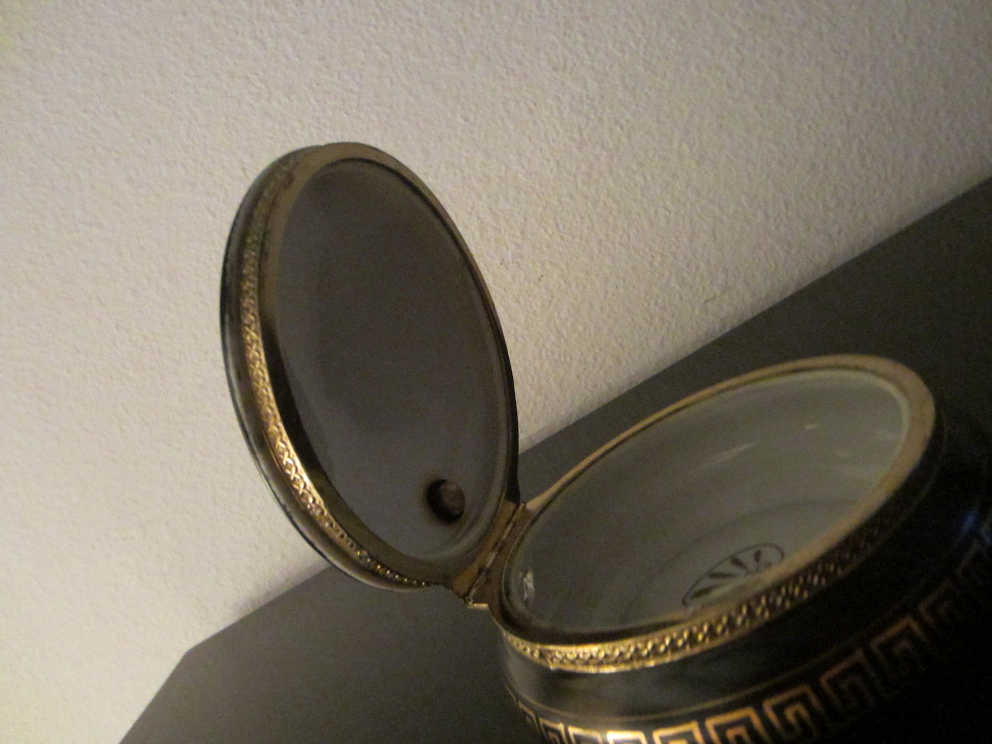 beautiful gilding, ornamentation, bronze, brass framed and handle. Beehive stamp mark S 8672, on white porcelain painted in black, likely art of Japan by Arnart. A demitasse covered flip top ashtray. inspires Royal Vienna. Fine gilt bronze, painted figures, Roman Greek gilt border. Arnart closed door in 2001. aged, with few condition, possibly missing handle, appears on the images. Sweet presentation, in very good, normal wear. 4" x 5" x 2.5". Interior decorated with a gilt painted heart & flower on white. Presumably being called silent butler.