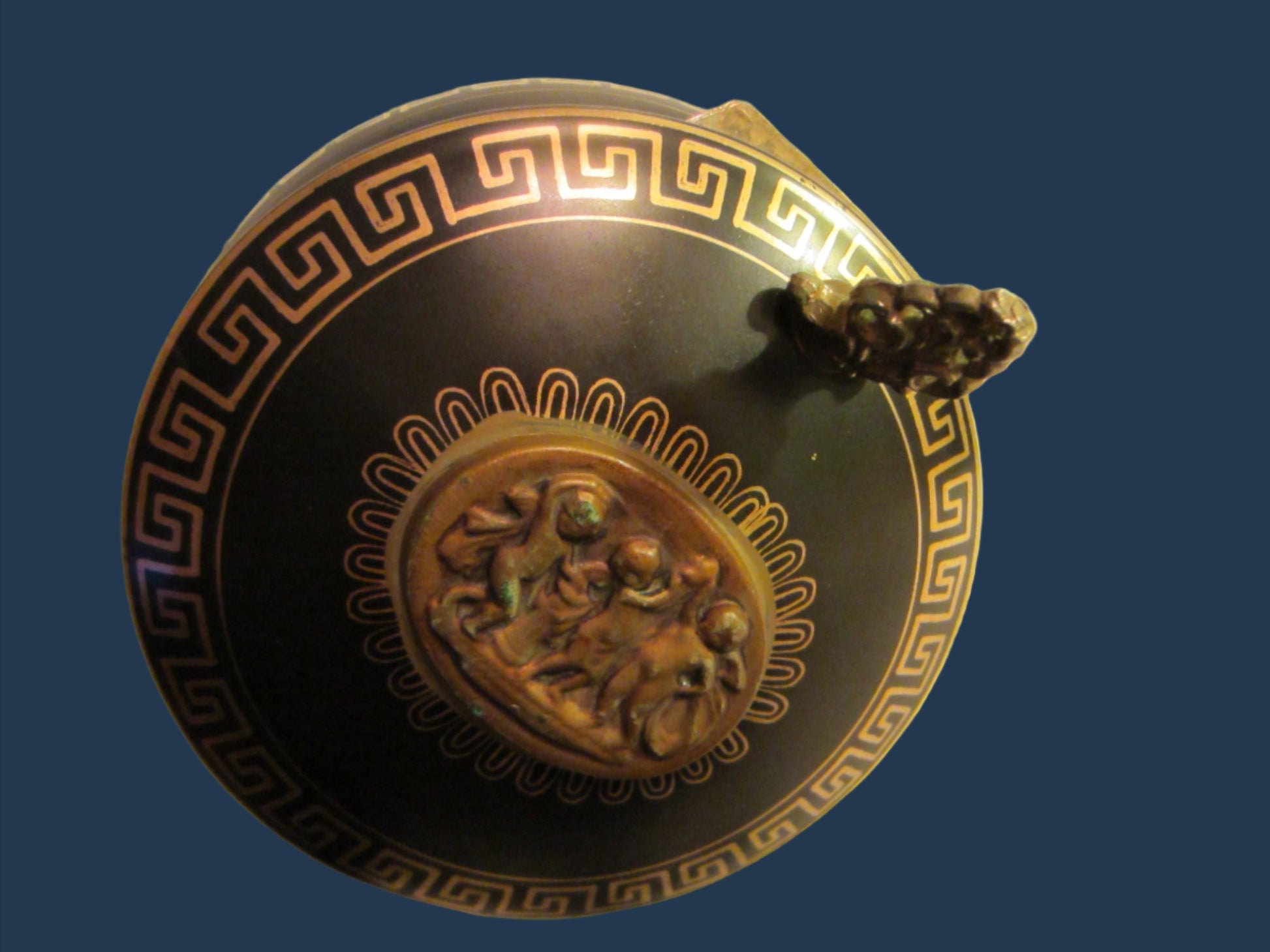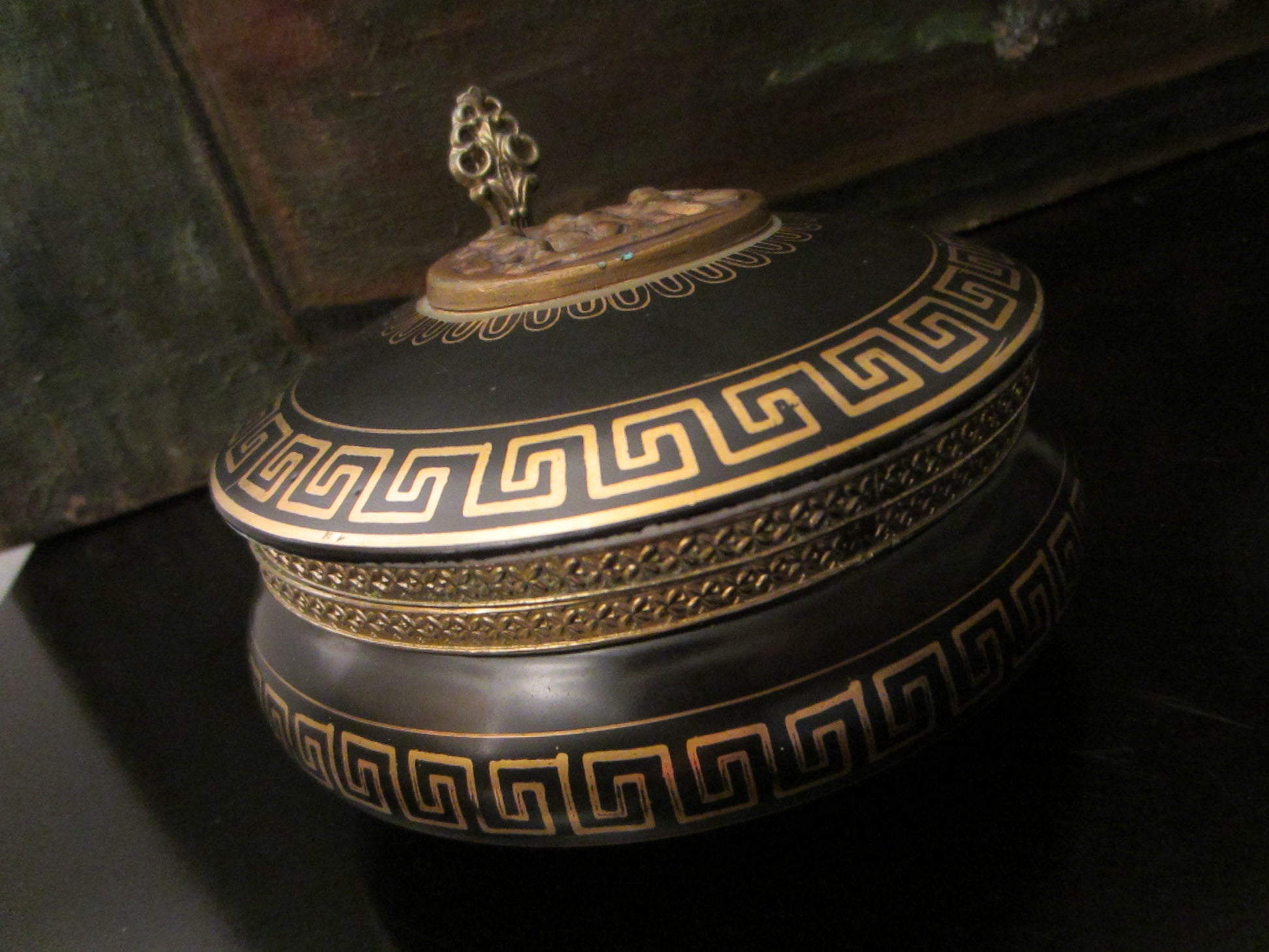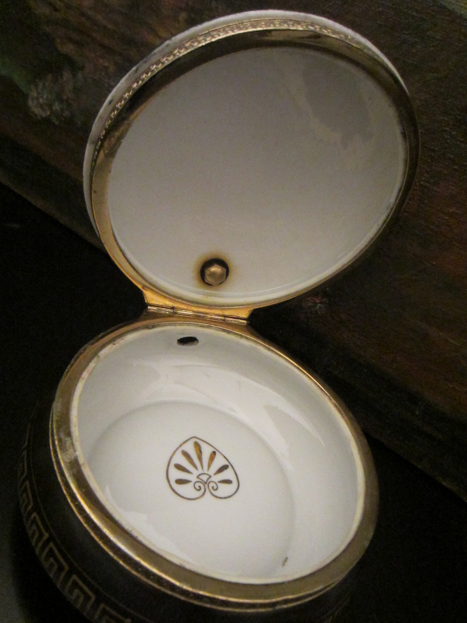 beautiful gilding, ornamentation, bronze, brass framed and handle. Beehive stamp mark S 8672, on white porcelain painted in black, likely art of Japan by Arnart. A demitasse covered flip top ashtray. inspires Royal Vienna. Fine gilt bronze, painted figures, Roman Greek gilt border. Arnart closed door in 2001. aged, with few condition, possibly missing handle, appears on the images. Sweet presentation, in very good, normal wear. 4" x 5" x 2.5". Interior decorated with a gilt painted heart & flower on white. Presumably being called silent butler.