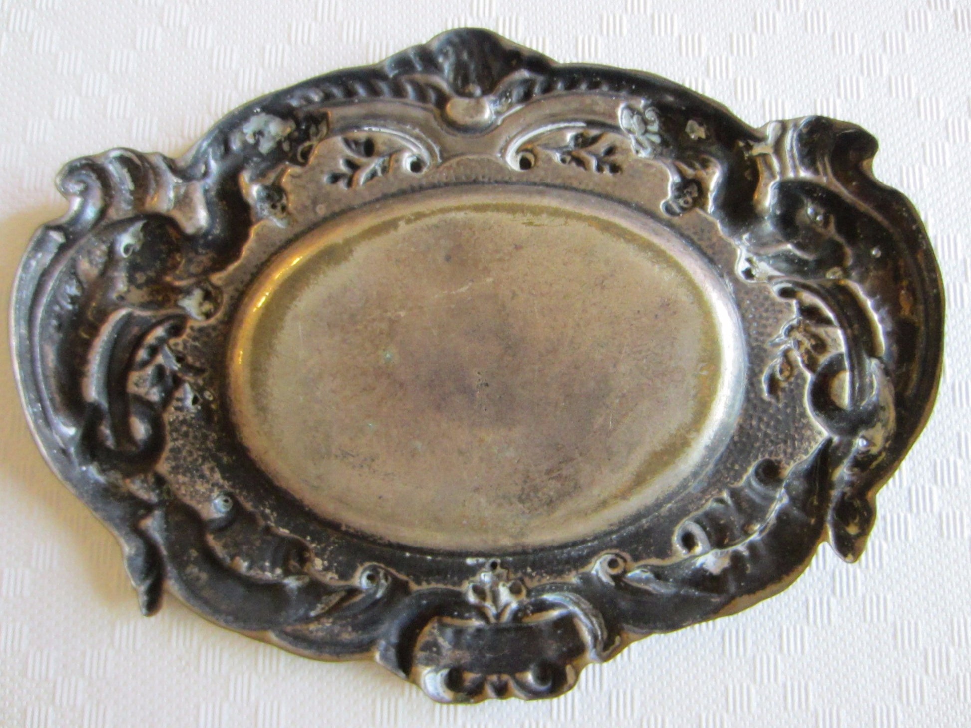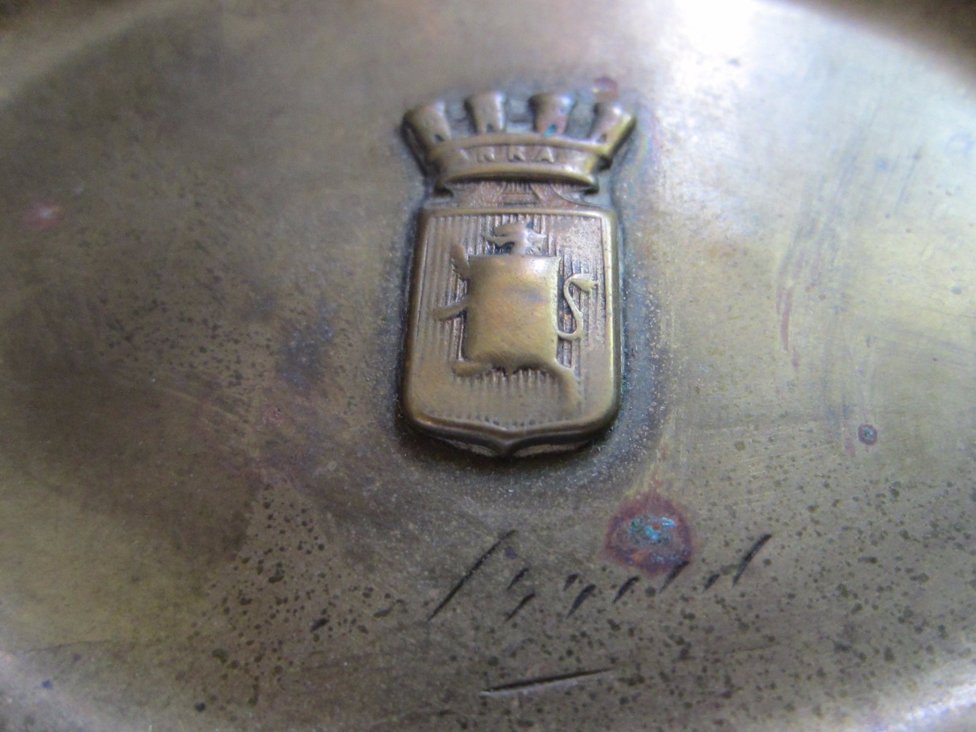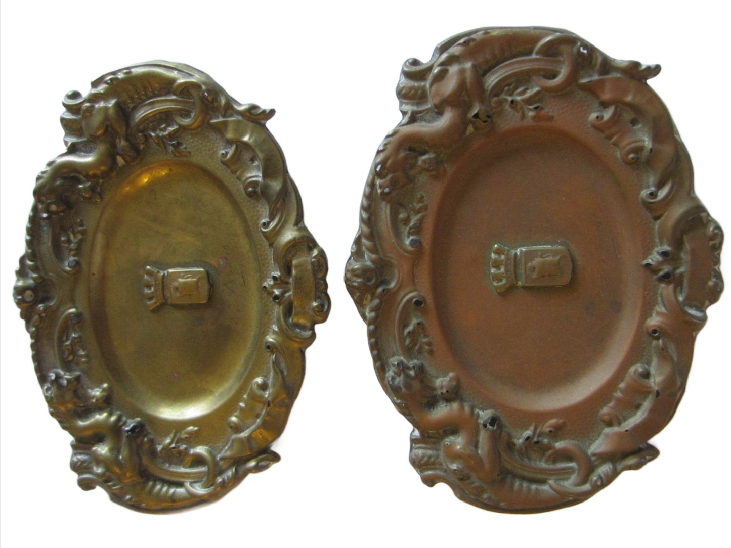 Pair of historic, vintage , art nouveau, presumes to be from turn of Century/ World War. Symbolizing Arras in France with shields, coat of arm and incredible decoration with initials. Made of Brass, white reverse, with etched mark on both. lightweight, heavily ornate, collectible. They are aged, with stunning patina, holes on reverse noted on the images. One has reddish patina, and other gold. 4.5" x 3.5"