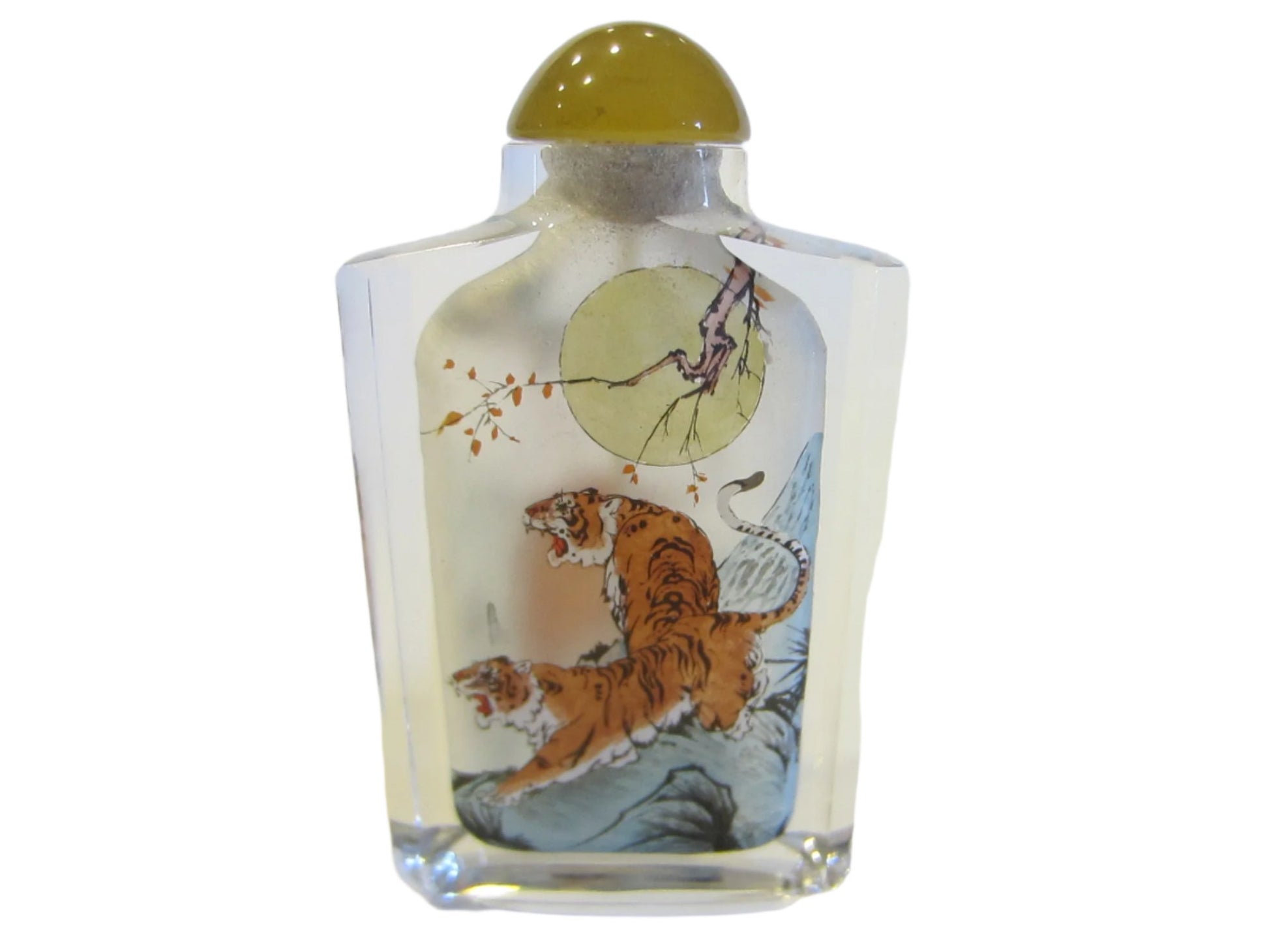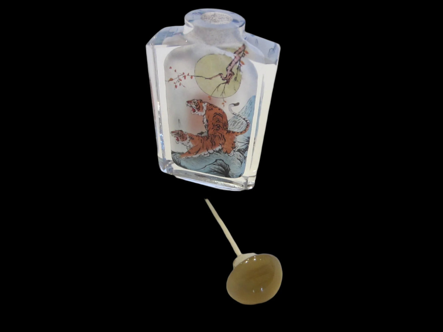 Interior Painted Asian Snuff Bottle Amber Stopper Moon Over Tiger