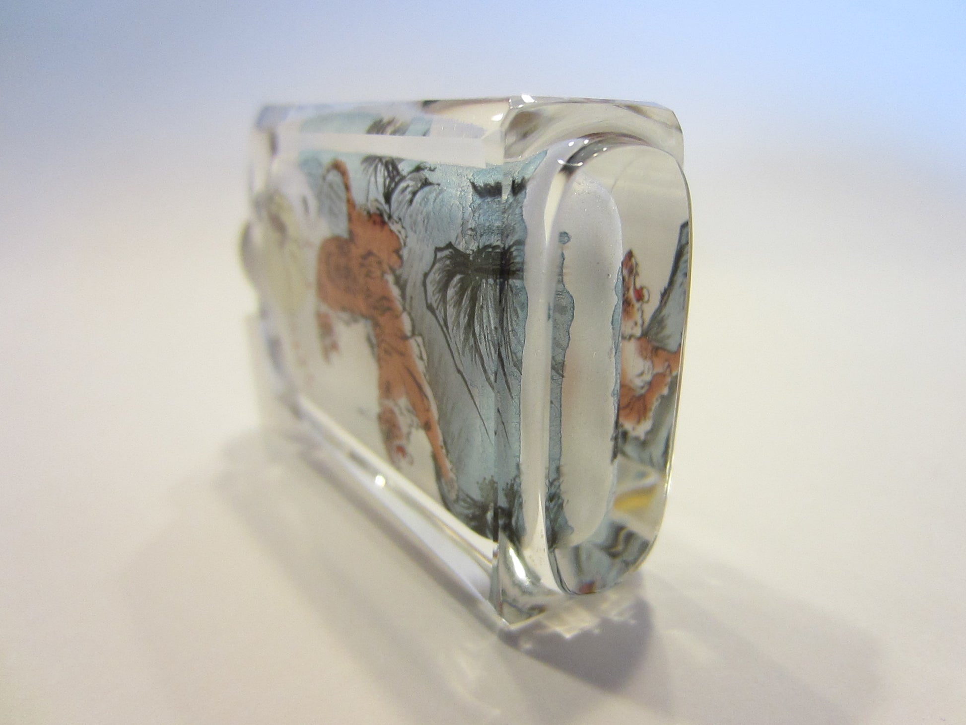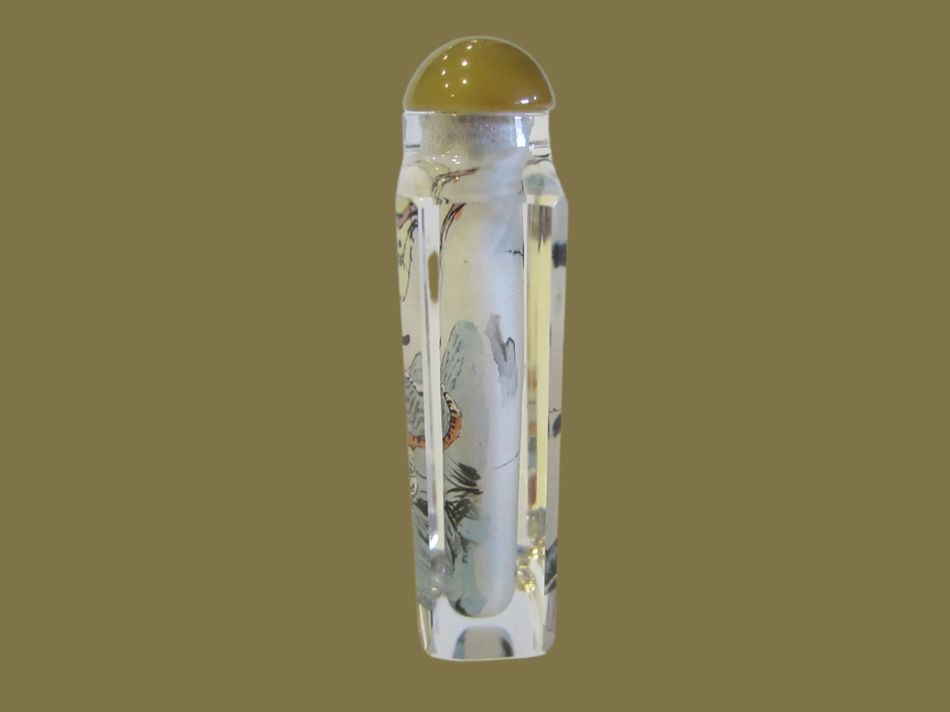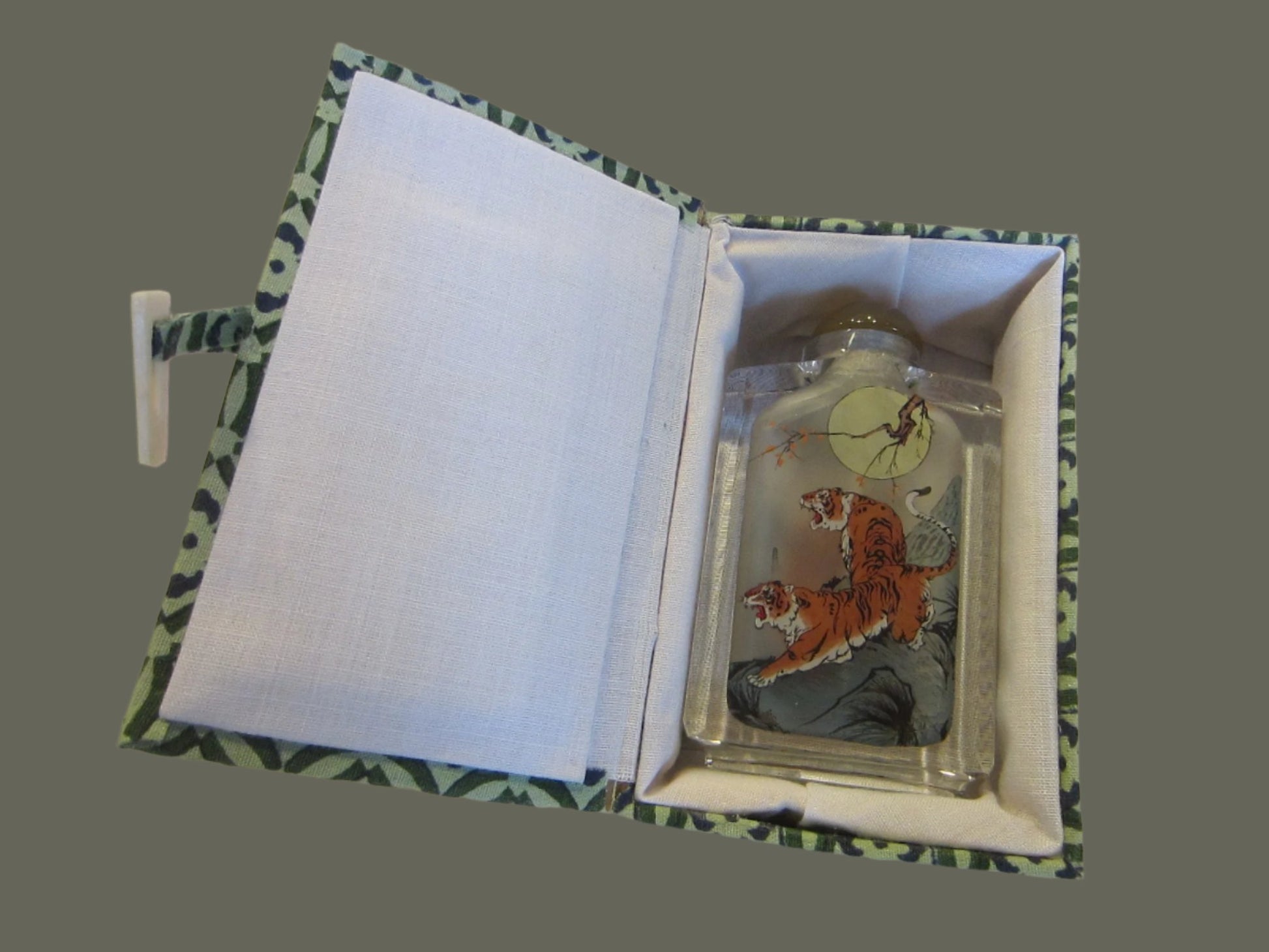 came in fascinating green textile satin hard box, an Asian snuff bottle of crystal with charming colors painted tigers. Excellent condition, white needle amber stopper. The box is 4" x 2" and the bottle is 3" x 1.5" .