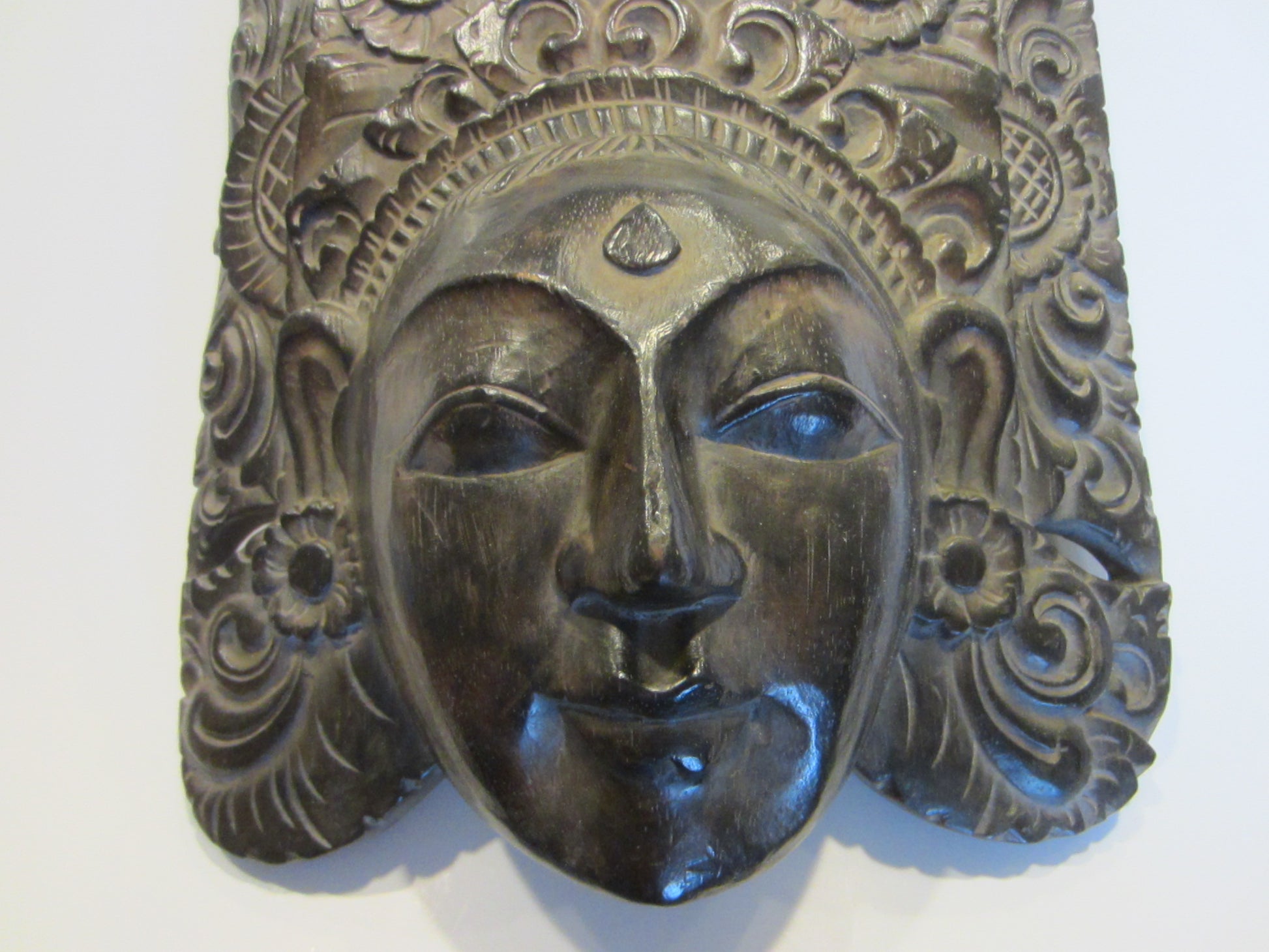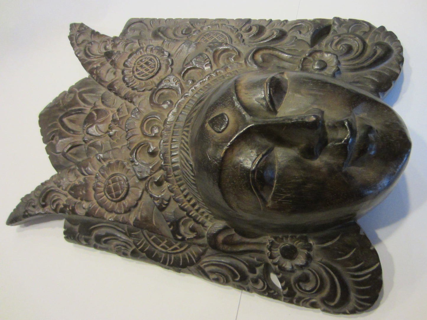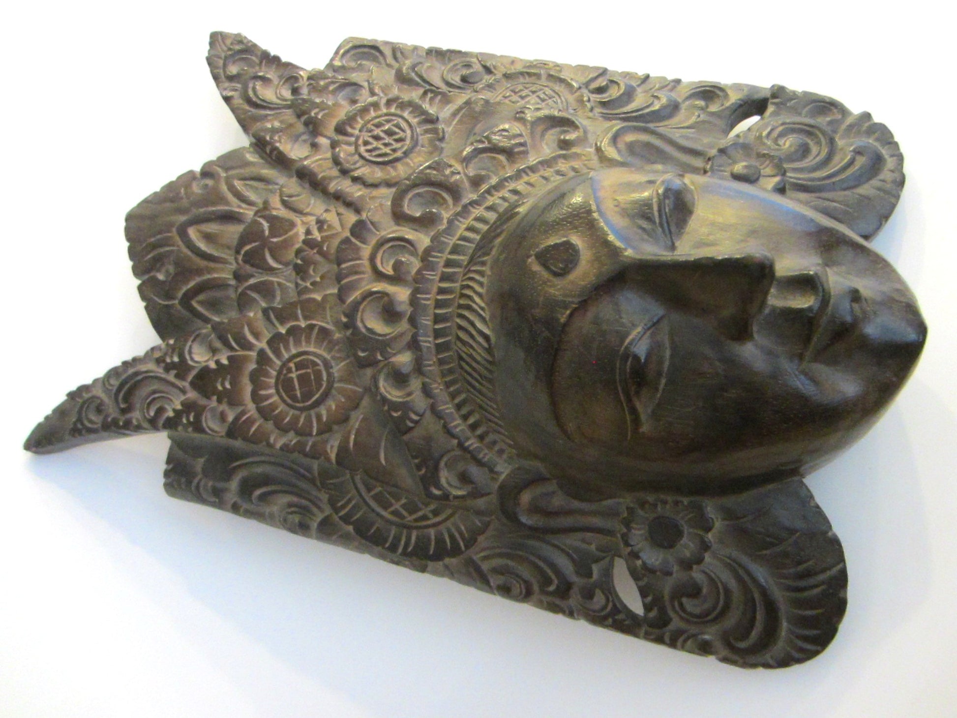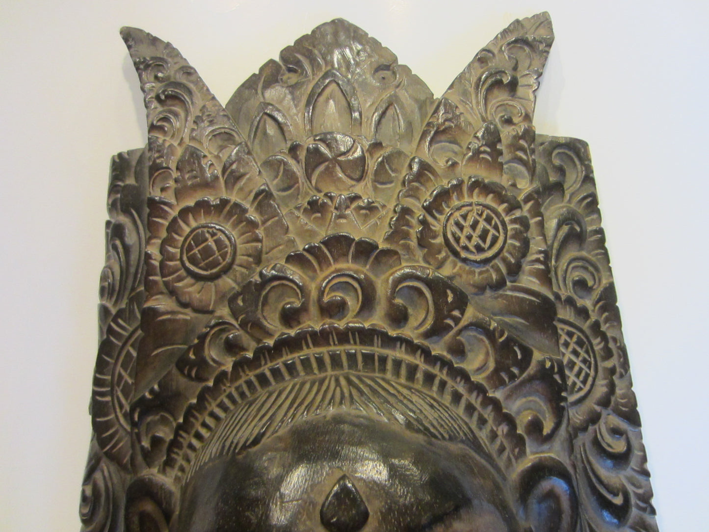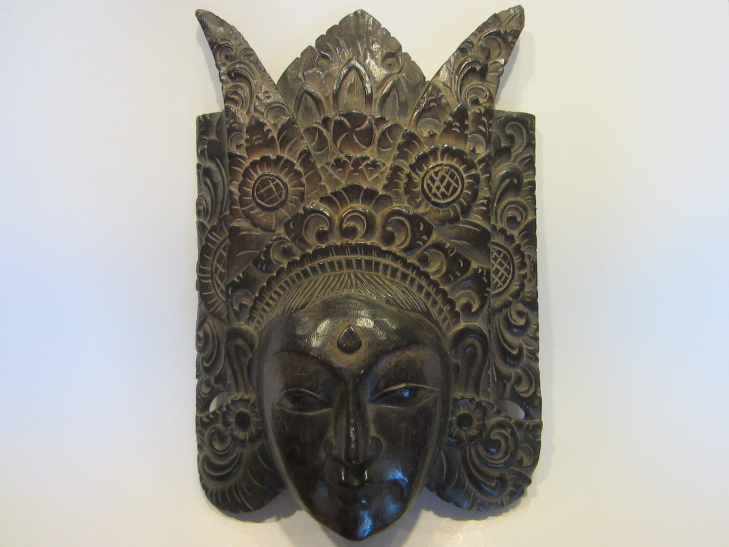 Unusual & fabulous characteristic dark brown mask depicts ceremony in vintage Indonesia, of carved wood, by hand of an artist. Likely a Barong style, ceremonial facial mask. The carving inspires art deco, with circular, floral, triangular, character motions throughout. A masterful wall décor, inspires facial expression, floral ,detailing. Very good condition, with sign of aging, and a cut which appears on the images.