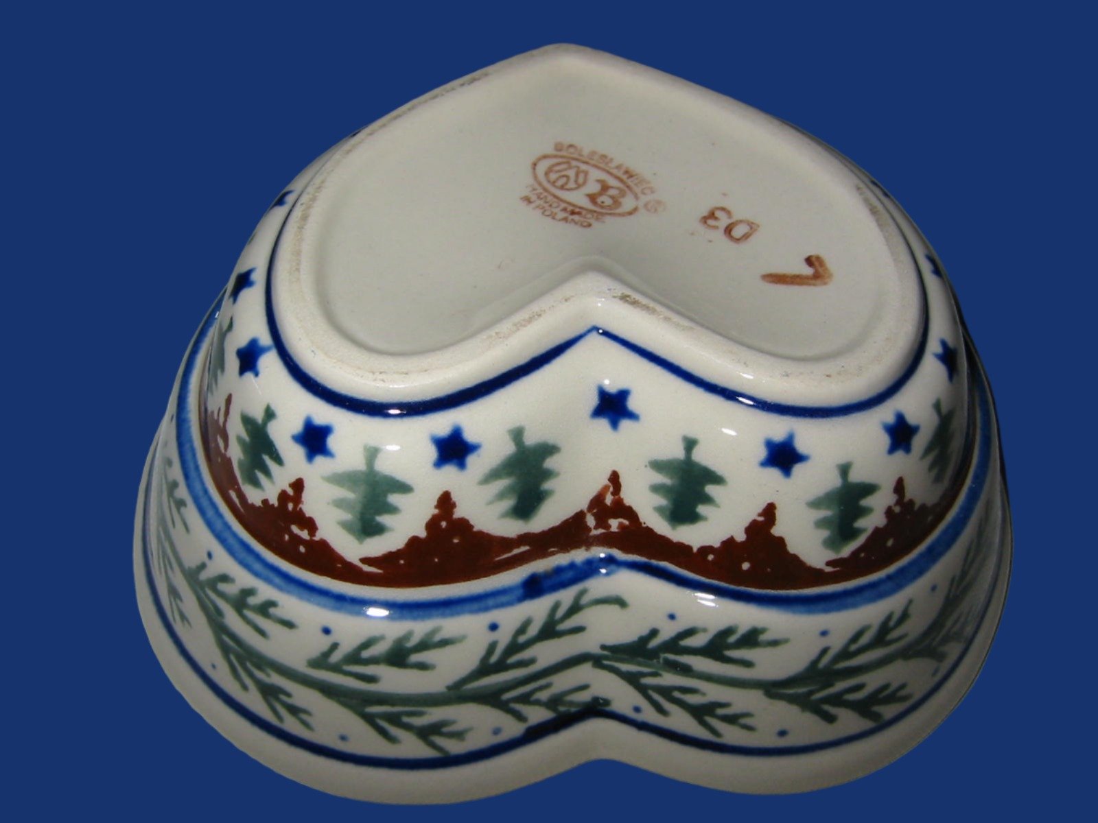 A heart shape white Boleslawiec D3 7, stoneware bowl, is stamped. marked with symbol & numbers. hand crafted in Poland. beautiful bold, red, blue, green ornamentation, trees, stars. excellent, 2.5" h. x 6" d. Reminder of Christmas in Europe. All season good looking !