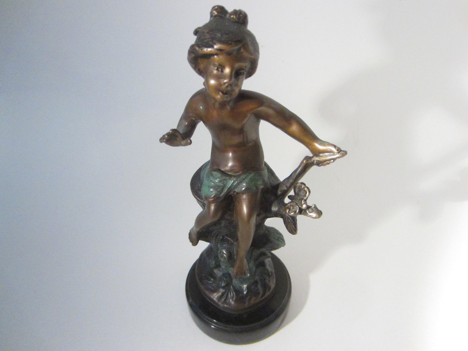Probably mid century modern reproduction of Bronze Figure on black circular marble base with artist signature. Wearing green shawl sitting on a tree branch, floral ornate, up do hair, and in excellent condition. one hand holding a branch, and there is a butterfly sits next to the blossoming branch. The other hand is waving. Quite heavy.