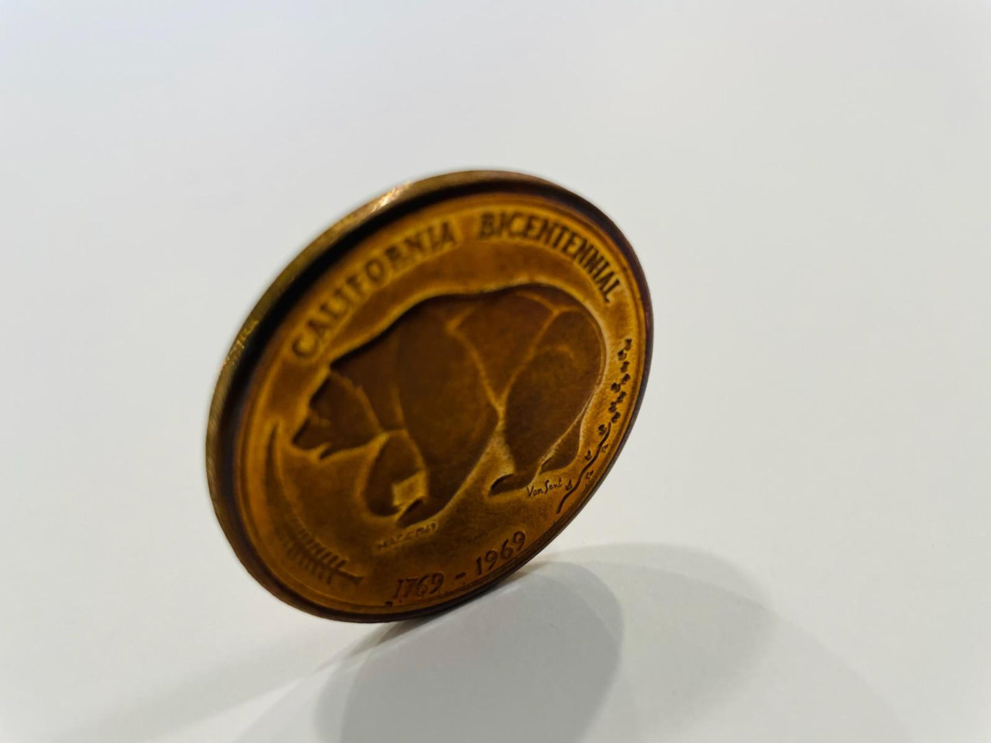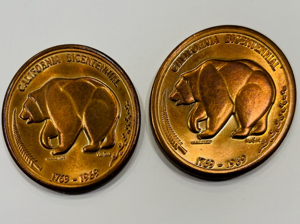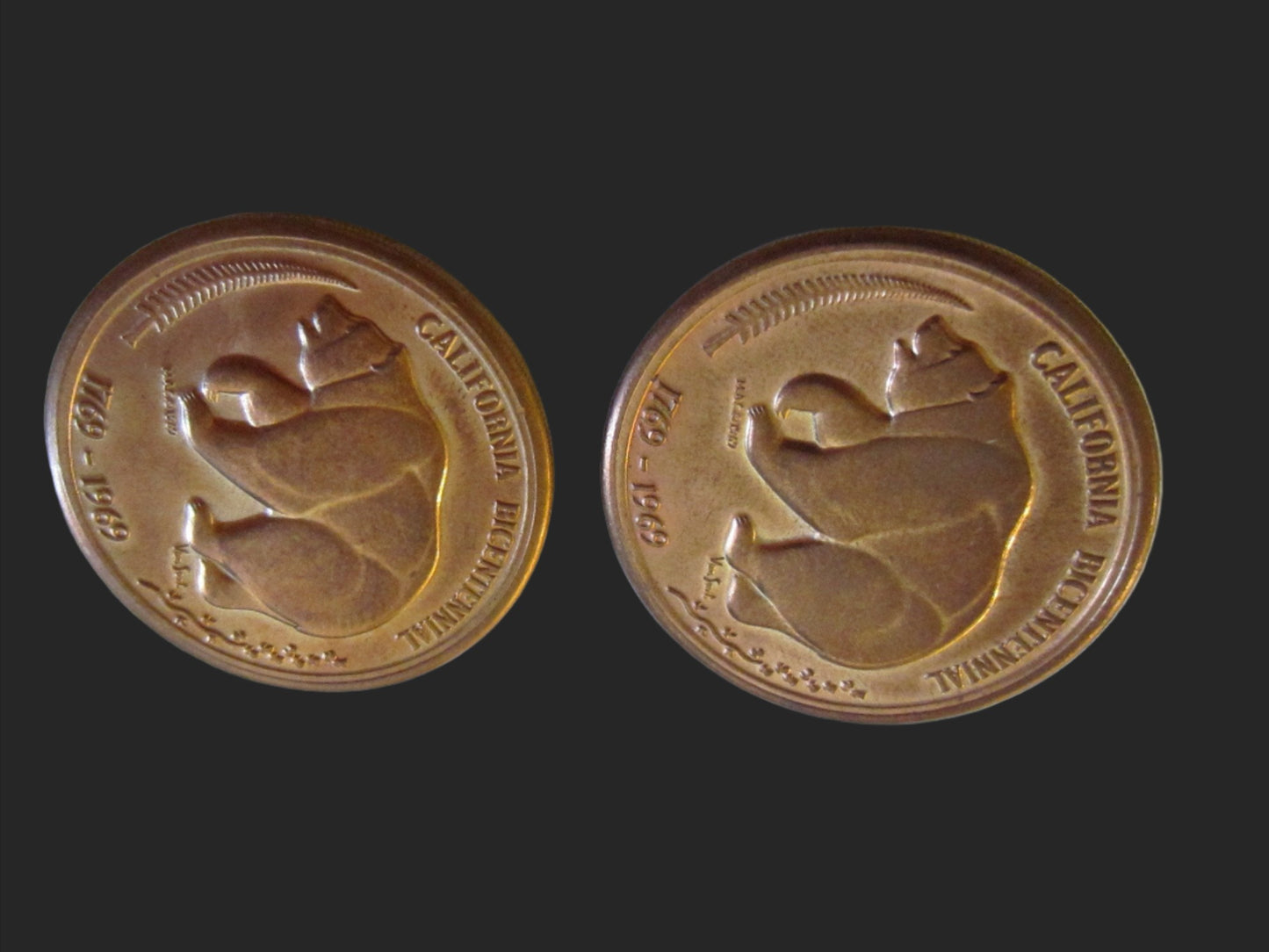 two beautiful fine quality medals represents California Bicentennial 1769-1969, The Golden Land. From Mid Century copper or brass medals, identical. about 2" d. Featuring Bear & People in stunning impressed & engraving. Golden Reddish metal, light weight. Collectible Memorabilia. Excellent, aged, normal wear.