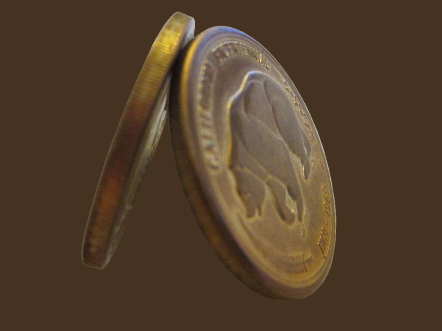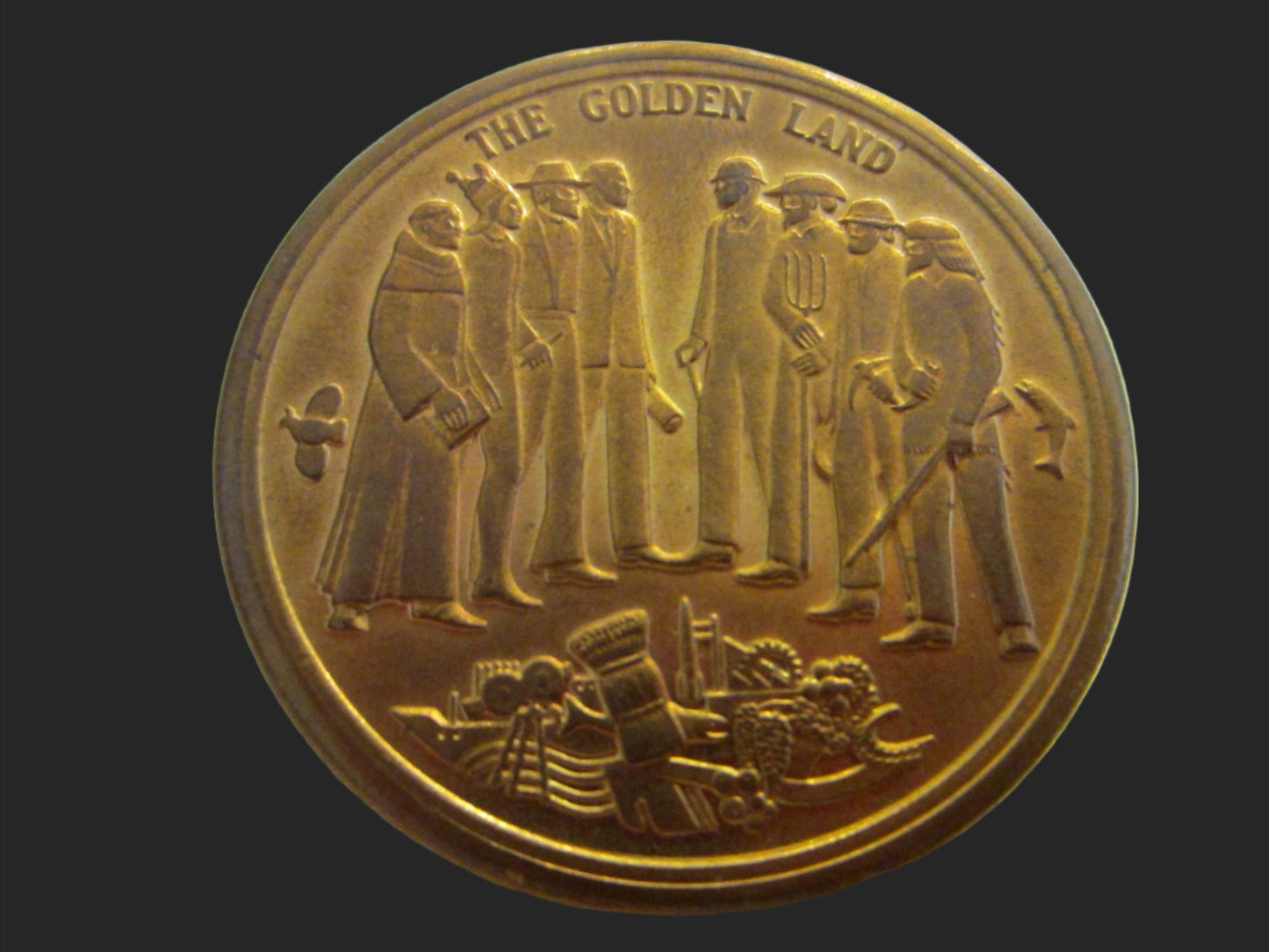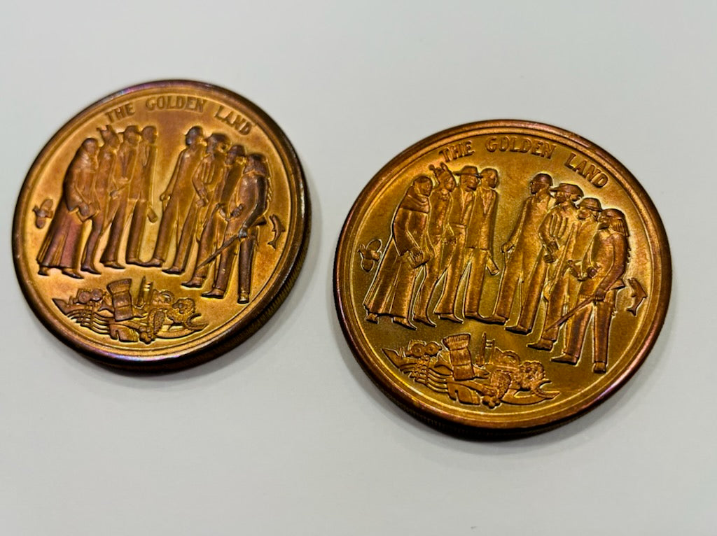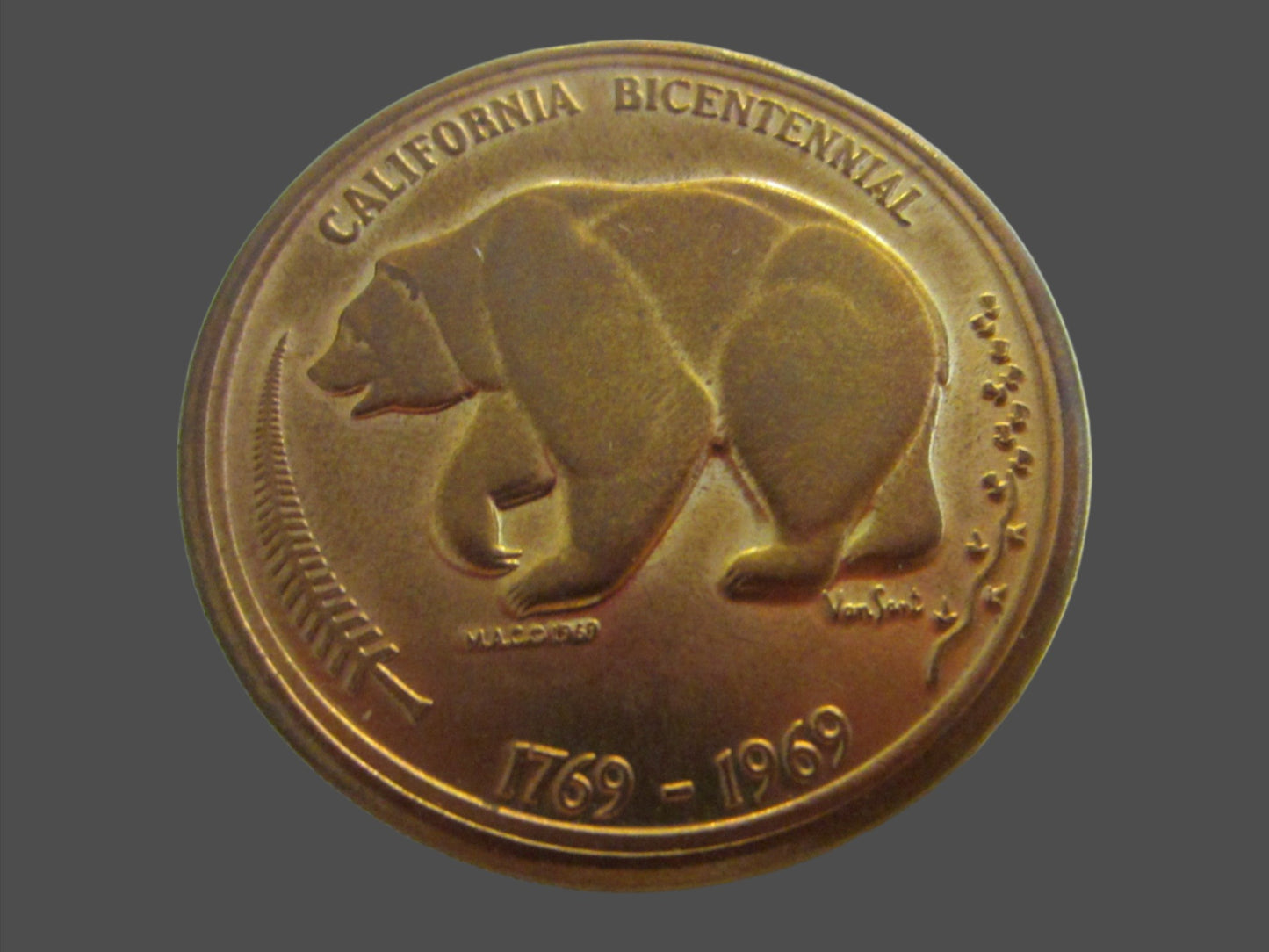 two beautiful fine quality medals represents California Bicentennial 1769-1969, The Golden Land. From Mid Century copper or brass medals, identical. about 2" d. Featuring Bear & People in stunning impressed & engraving. Golden Reddish metal, light weight. Collectible Memorabilia. Excellent, aged, normal wear.