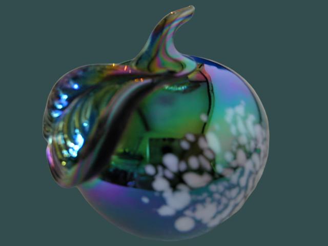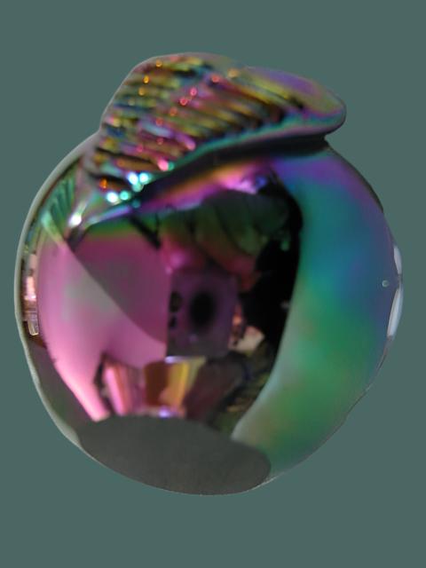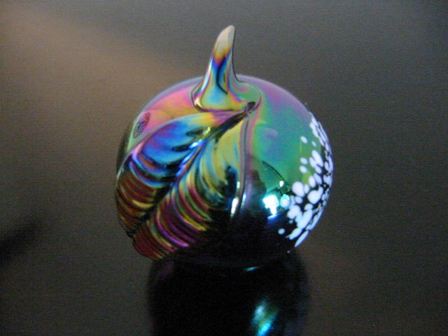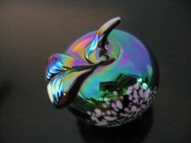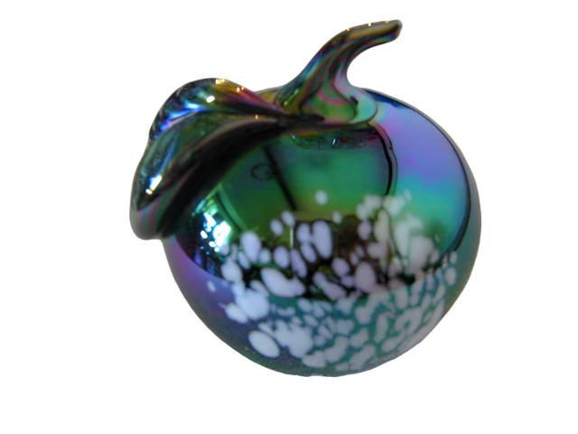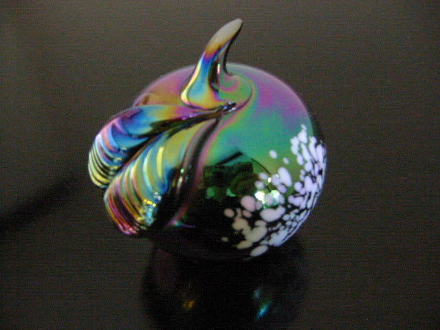 This gorgeous glass apple is blown, and is perfect. Luster green blue rainbow colors Iridescent, carnival look. A paperweight, with impressive shades, decoration, shimmer. hand painted white accent, excellent condition, beautiful stem, relief. It might be Gibson Carnival style, with 3" h. x 2.5" w. x 1" base diam. it's fairly heavy for the size, and is a Work of art.
