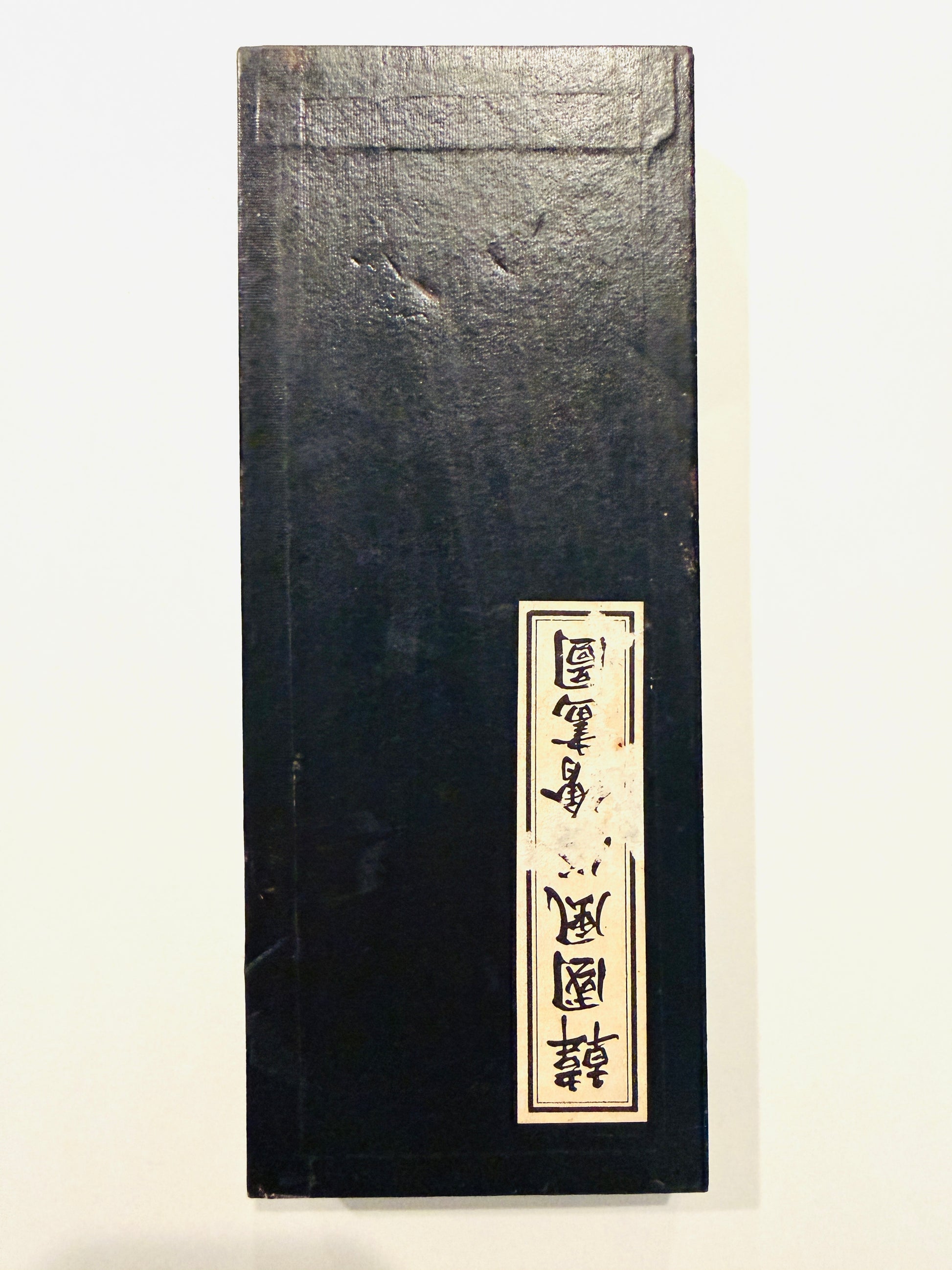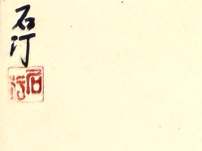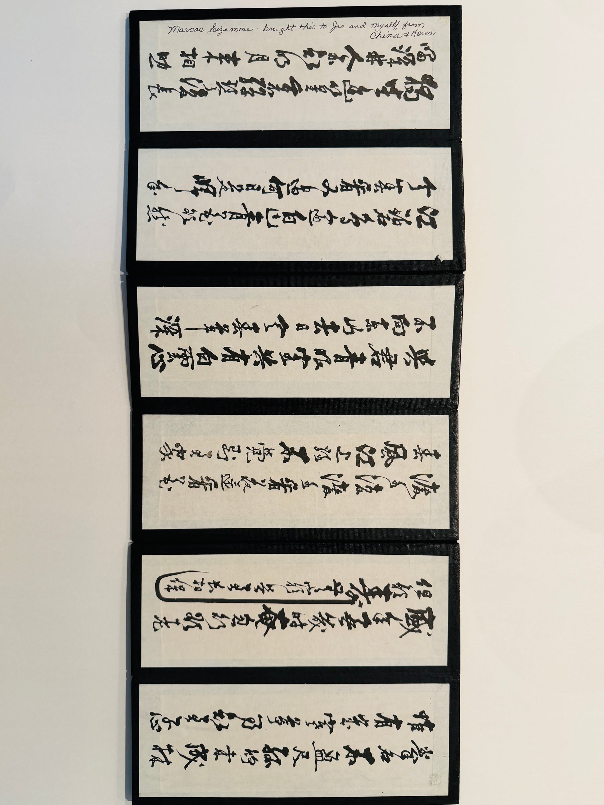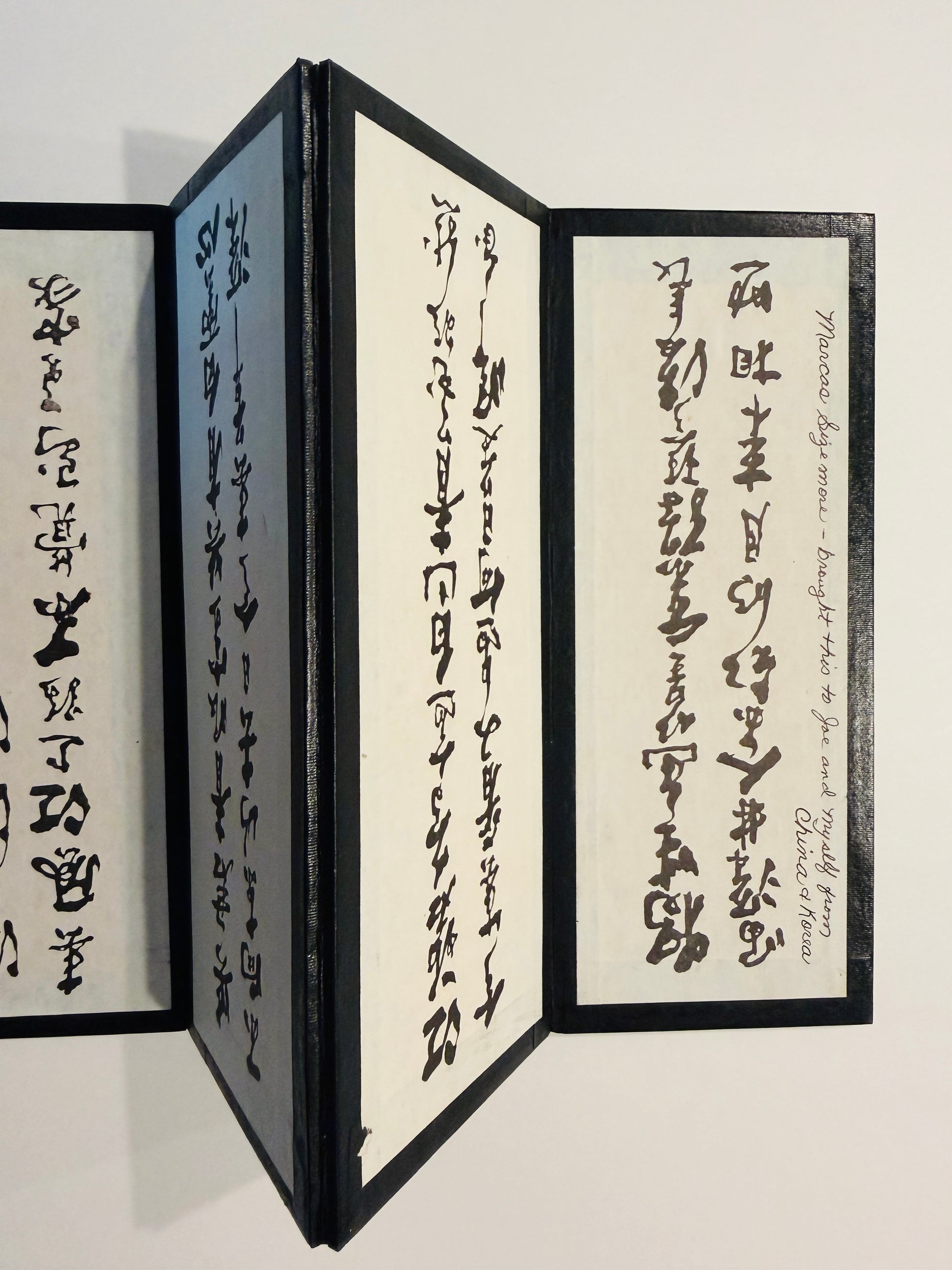 9" H. Each panel 3.5" W. and Folded to an inch d. Sticker Calligraphy translating to Stone Bank or Rocky Shore.