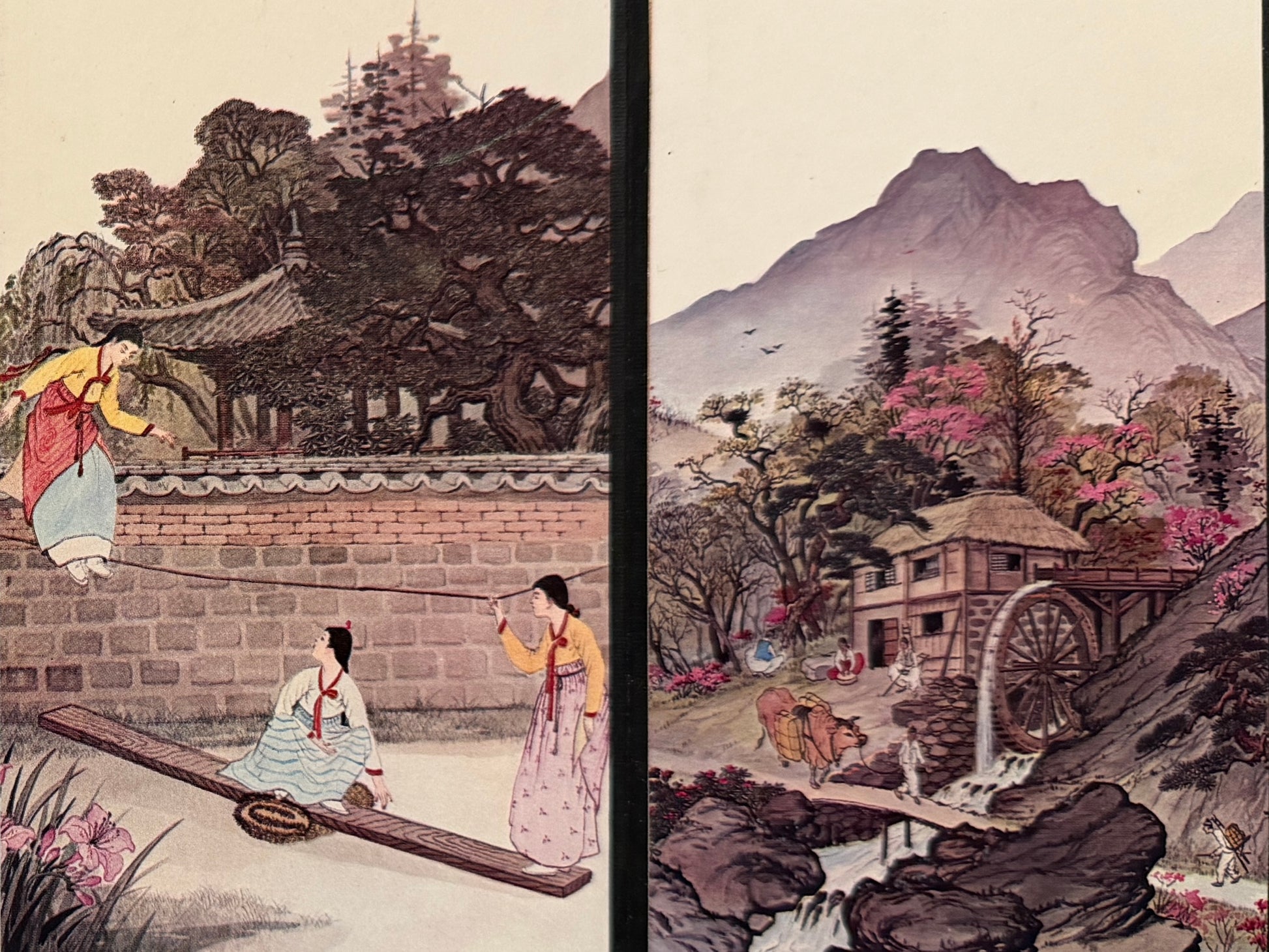 Illustrated aspect of daily life of a Chinese Korean. A signed, in calligraphy, colorful vintage eight panel two solid black sided with label calligraphy table top byobu in paper over wood, or textile of kind. The panel is Double sided, Looks like genuine hand Calligraphy and texts with signature and red seal of artist. Very likely reproduction of known artist. Original collector's text on the very top of the art with handwritten message. The art is in excellent condition, and translated to The scenes are characteristic of the pungsokhwa (genre painting) style popular in 18th-century Korea. Kim Hong-do is celebrated for his realistic and humorous depictions of everyday life.