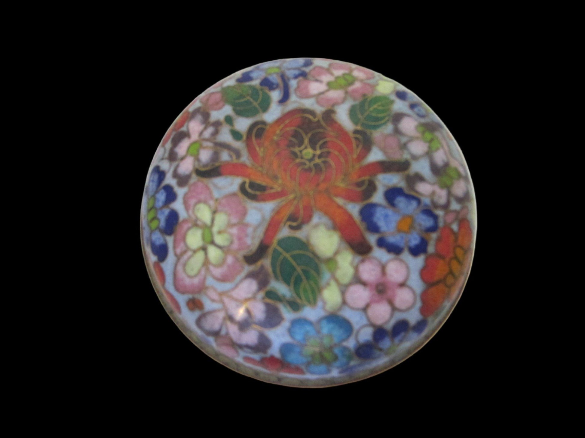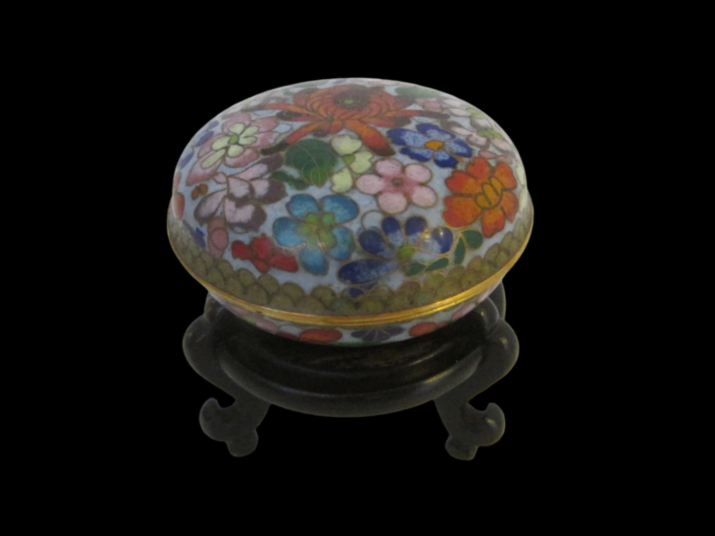 Asian beauty cloisonne jewelry box to keep the rings and small object on the dresser. decorated with flowers in colors, such as baby blue, pink, orange, green terracotta, and more, with a center red lotus. The enameling and execution is spectacular. Overall in excellent condition, a little bit of dent on the corner of frame base. It's apparent is from vintage era. Brass wiring, gold work. lapis blue on base, and interiors, with touch on flowers. 1.5" H. from the surface, about less than 4" diam. On the stand or alone would embellish the tables or vanity. Stones for décor only NSF , stand sold separately. Heavy for the size.