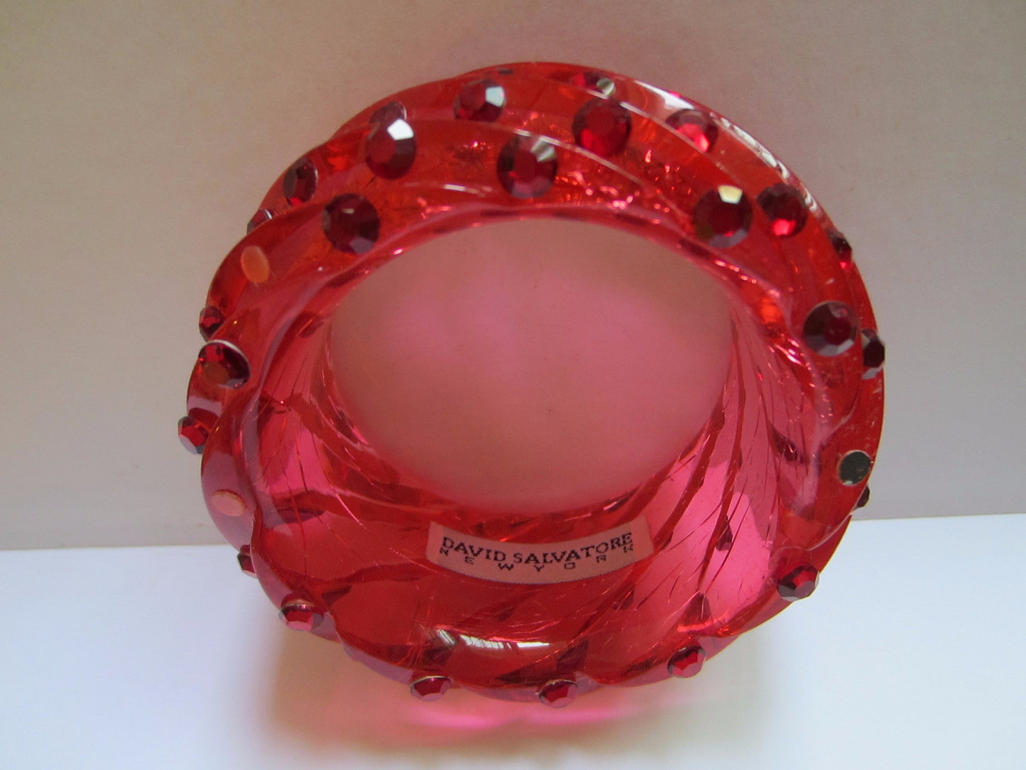 the design is spiral, this fiery red bangle presumably Lucite or bakelite bracelet represents a magnificent creation of David Salvatore, New York designer. It is from vintage era, and perhaps from prior to year 1980. beautifully decorated with shiny stunning red crystals. artist usually utilizing Swarovski crystals according to the research occurred.. about 1.75"h. (thick) and fits 7" wrists.