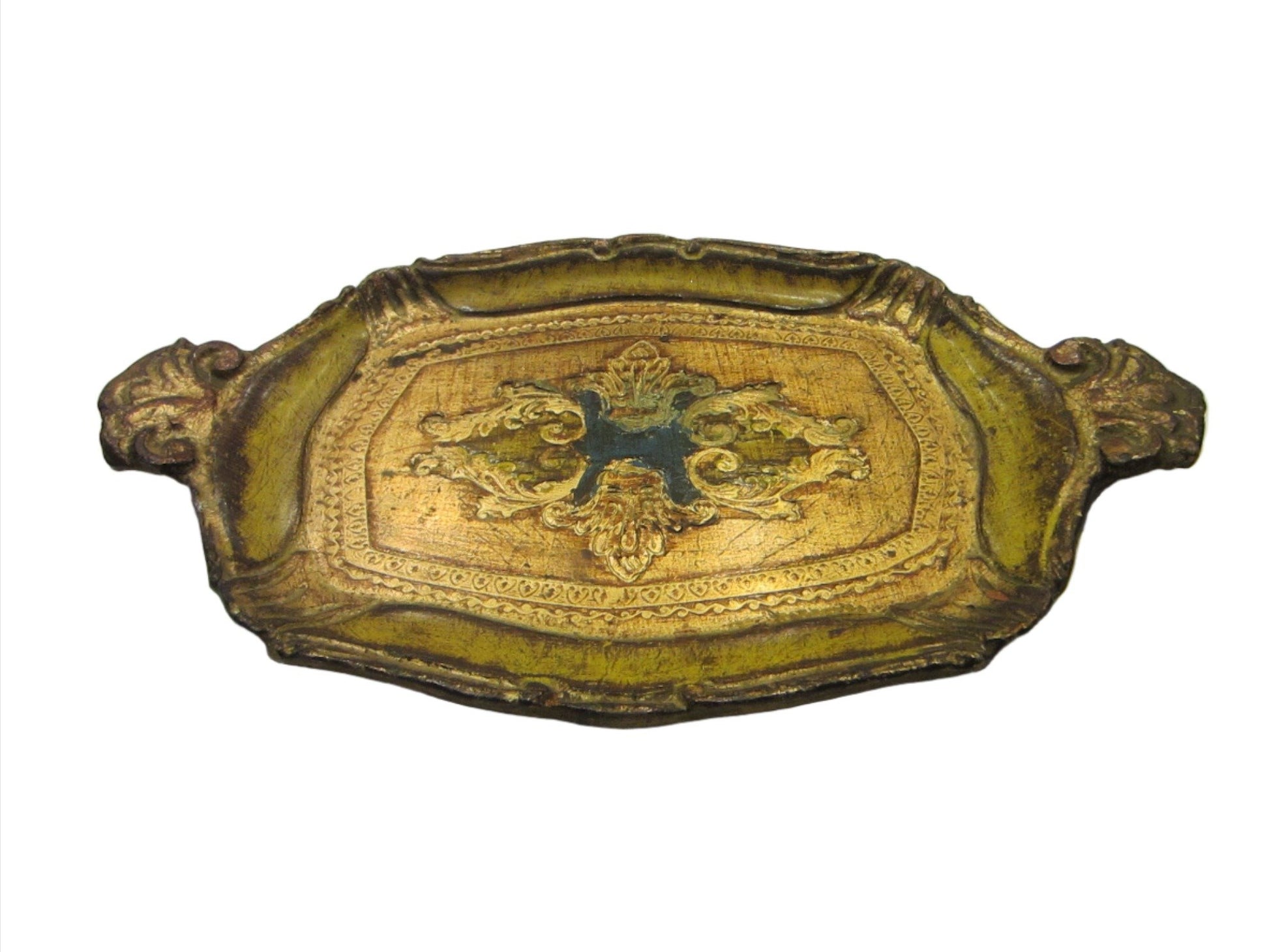 Center Medallion beautiful gilt wood tray with two handles, is made in Italy with label mark, number. Size, small , incredible carving, touch of blue. The tray is vintage and hand crafted in Italy, and possibly Florentine. Aged, and in very good condition, with multiple signs of age mark, and wear on gilt. Decorative, on the stand or table.
