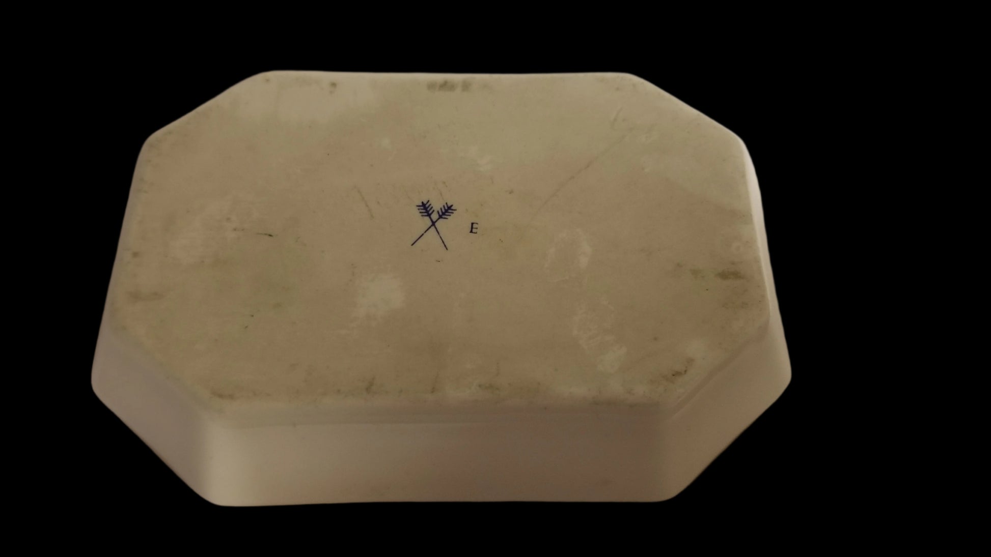 Made in France likely limoges with blue mark on the base of large rectangle tray of 9.5" x 3.5" also the chest of 3" x 4" x 2" with gold acanthus flowers on the sides with flower interiors. The small tray of 4" x 3" x 1" approx. has Meissen or Severes design mark.