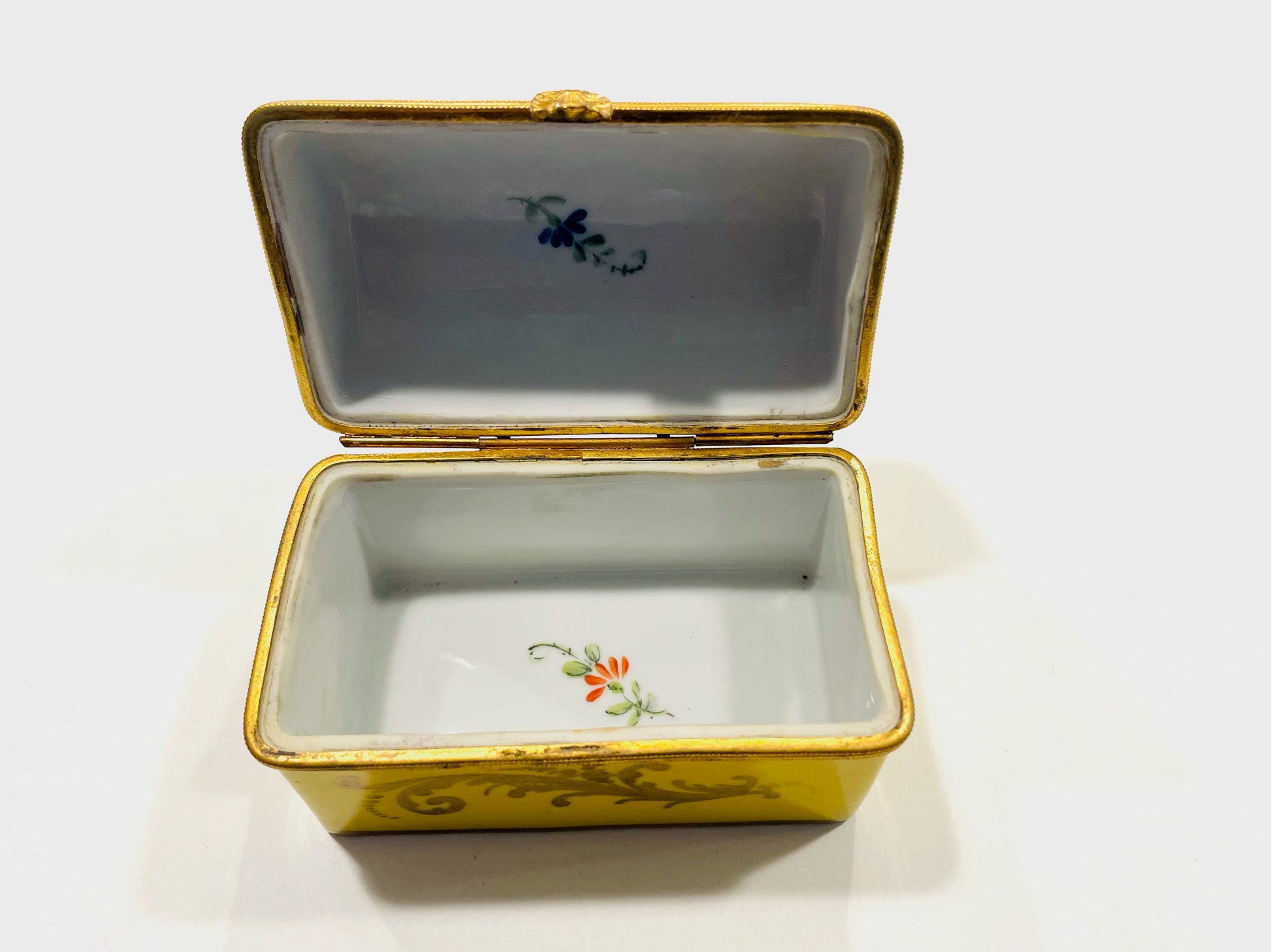 Early 20th Century Super gorgeous table decor. Yellow porcelain, three pieces , chest, small and large trays set. Hand painted floral medallions with gold borders and bronze hardware shell closure. The set is in excellent condition. The colors of gold, on yellow with pink, red, green, and white, scrolls of golds medallions.