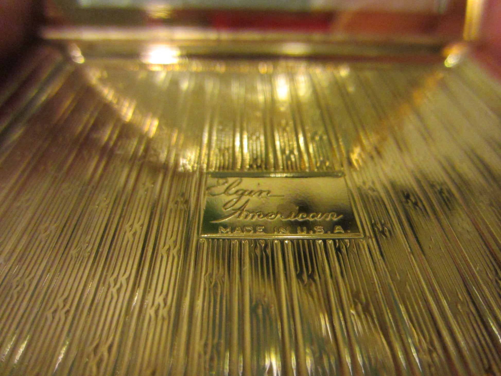 Gorgeous, glitzy, vintage, powder compact, made by Elgin American in U.S.A. in vintage era. 3" square, decorated multi color, crystals, rhinestones cabochons. lavender, pink, red, blue, yellow, green, orange stones are shiny and, statement proof. Excellent condition with sign of aging, all in tact, Mirror is imperfect. Marked in etch, Elgin American Made in U.S.A. Made of brushed brass. Good looking on any surface, parlor, vanity or in your purse.