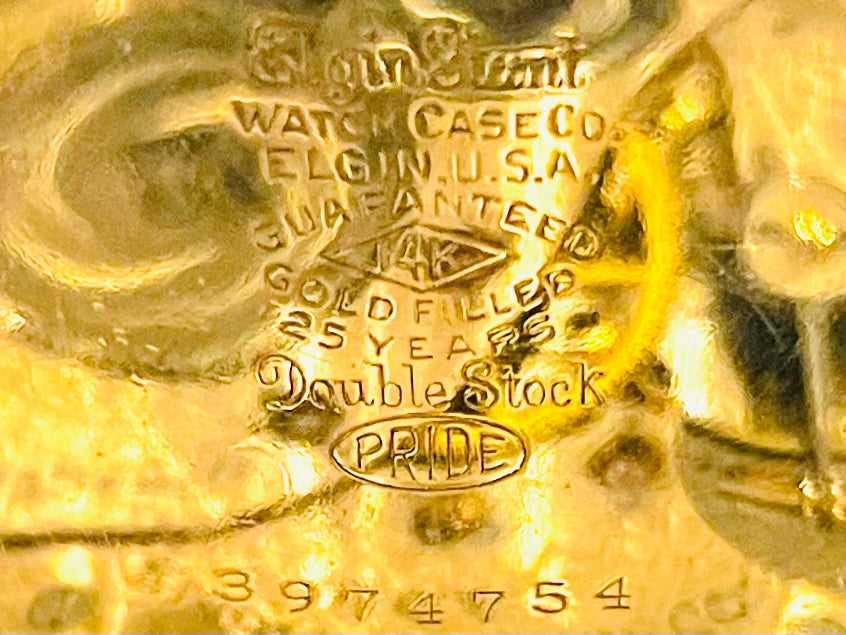 Super exciting Elgin American pocket watch for men or women as a pendant or collectible. Features Elgin Natl Watch Co U.S.A. 17 Jewels 26401942. Elgin Watch Case Co. Elgin U.S.A. Guaranteed 14 K. Gold Filled 25 Years Double Stock Pride. The above numbers and inscriptions, itendifies the The serial number movement . It is to help identify art deco pocket watch with sub-dial for seconds. A golden dial, ornate, black Arabic numerals on the dial. The case is gold filled, with monogram MNM could identiry of the previous ownership. The dial is about less 2" x overall 2.25" diam, from the centertop hold and 2mm thickness. Overall in excellent body, and case condition with signs of aging for being over decades old. Most likely reuquires a trip to professional watch shop to be evaluated. The watch is sold as is. All described to the best of our knowledge, highlighted on the images.