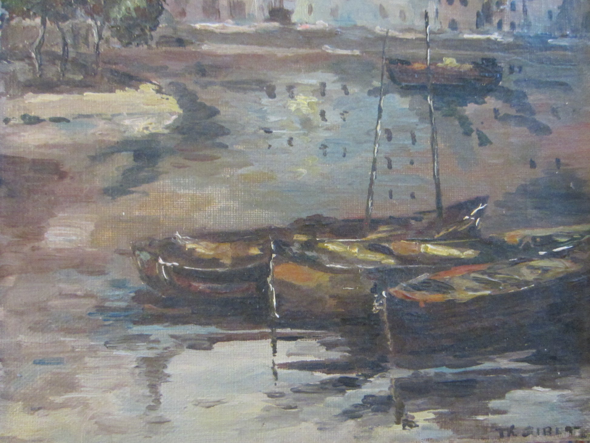 Nautical Harbor Boats Shore Marine Oil on Canvas Signed TK GIBET