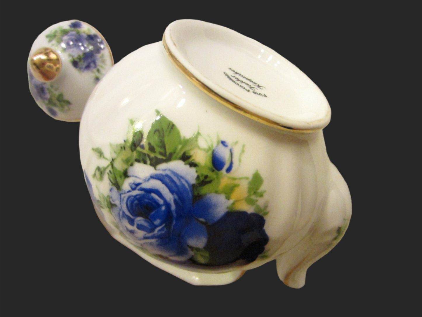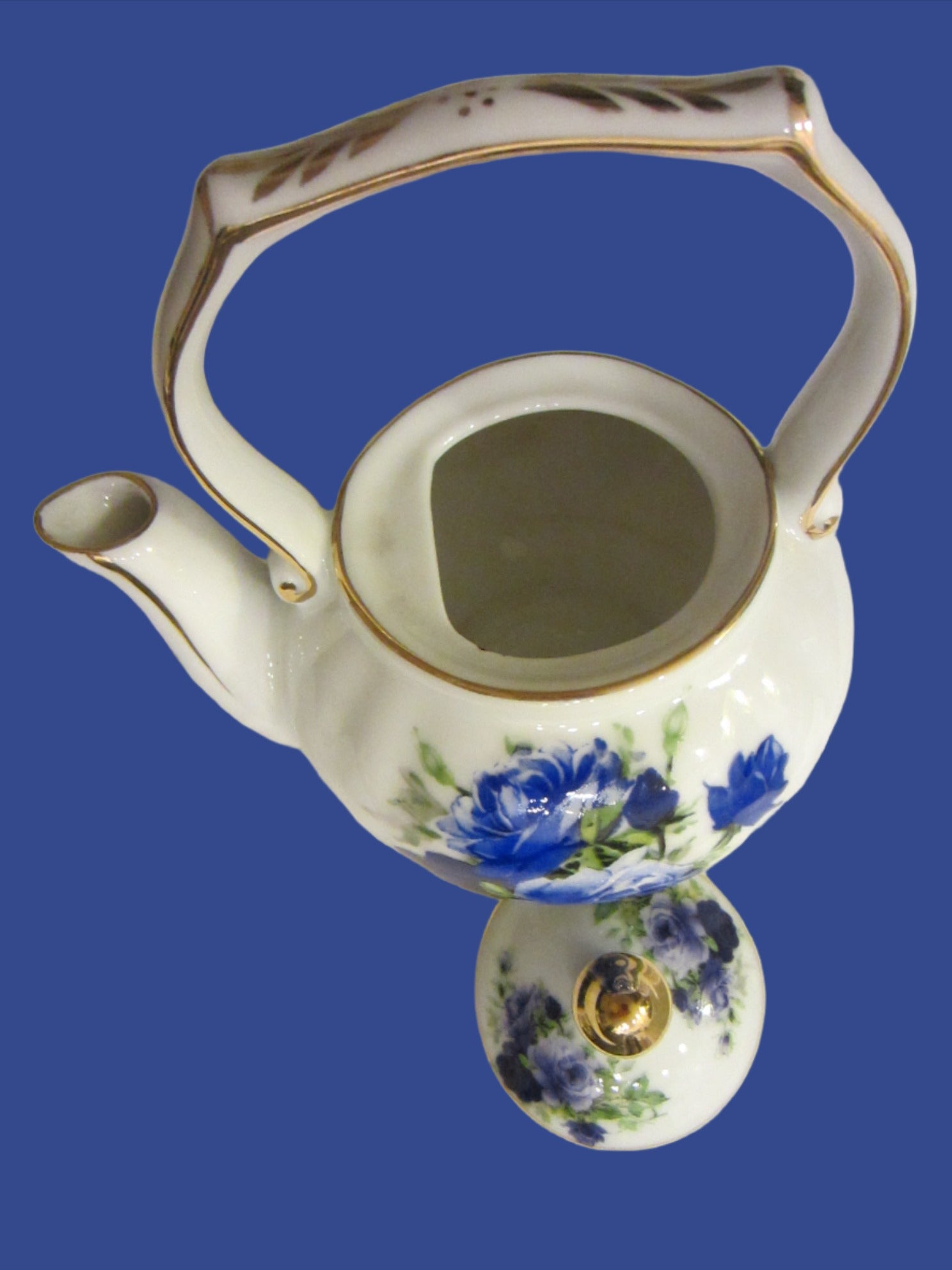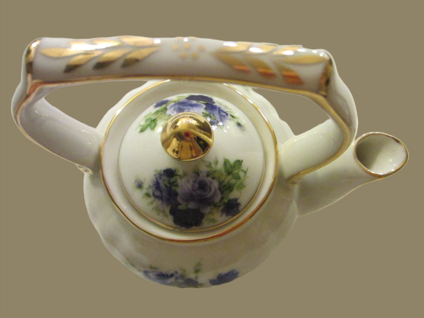 Blue Roses Fine Porcelain Fielder Keepsakes White Teapot Gold Leaf Handle