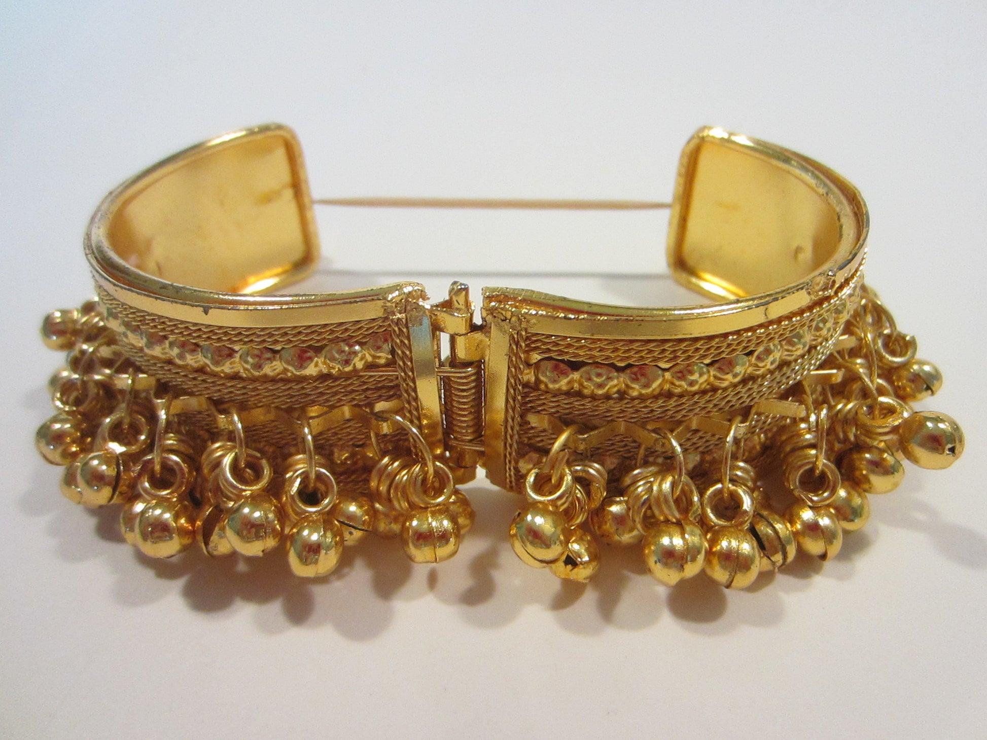 unaware of the origin, looks like brass. a folk art, modern India style dancer's cuff or ankle bracelet designed with drops and beads to make noise. shines like gold. Hinged, opens, closes clam style, vintage from post or prior to the 80's. excellent presentation, with spectated aging variation. fits small wrists. measures 1" x 2.5" diam.