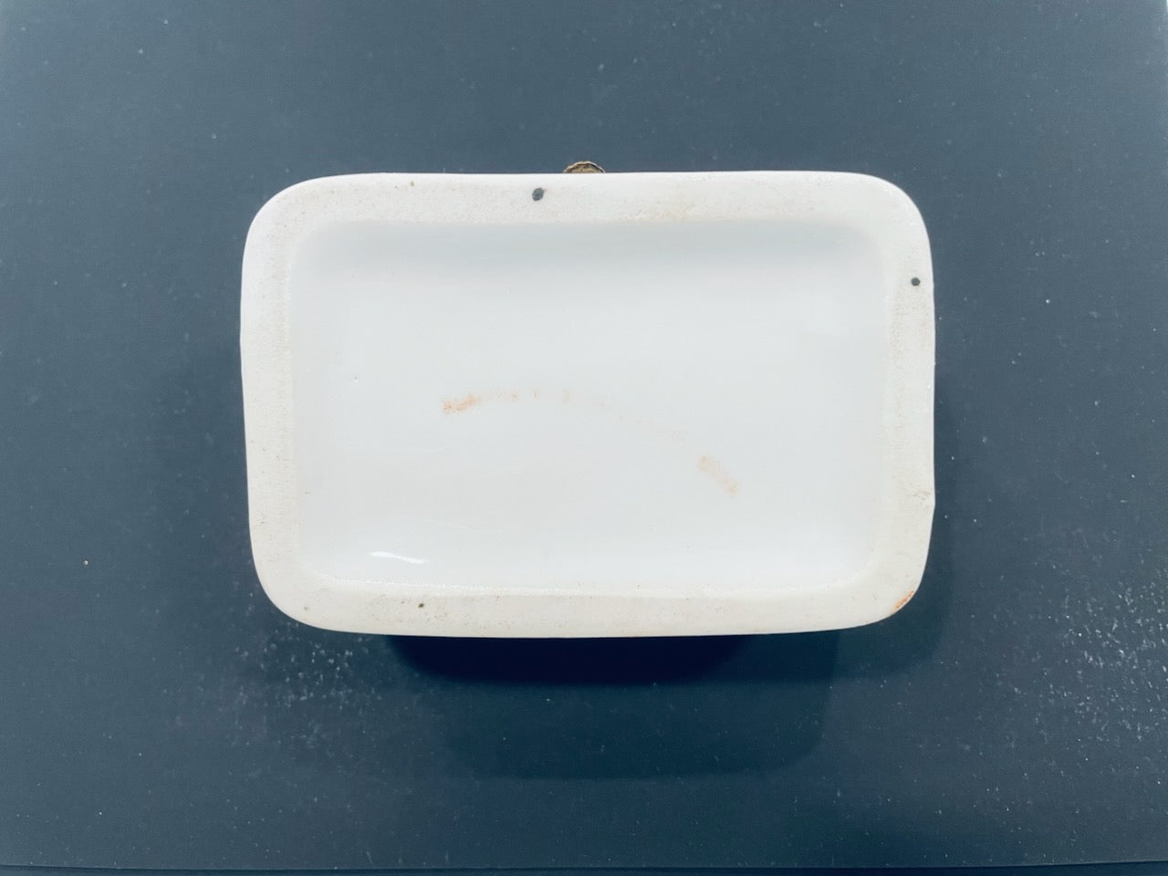 Super chic, decorative, gorgeous Antique France white, rectangular porcelain box. Hand painted, enameled, feather like, in relief, with beautiful flowers, medallions on the center top, Sides, and a line in red on the border, floral interiors. It has faded mark in on the base, bronze hardware framing, top with closure, and in excellent condition.