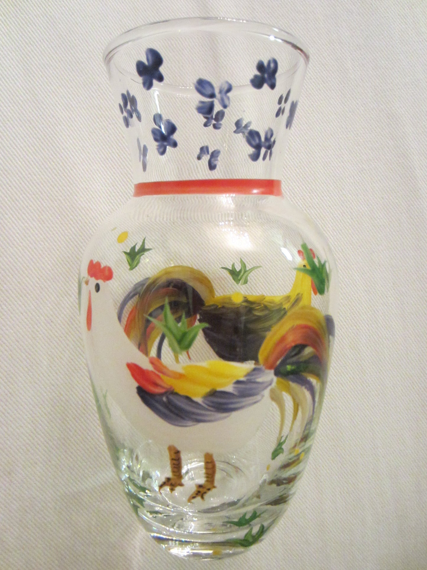 meticulously hand painted roosters, in beautiful colors, over clear glass carafe, decanter, with floral design. excellent condition, with 6" H. x 3" W. x 2" opening and end diameter. A good looking kitchen accessory.