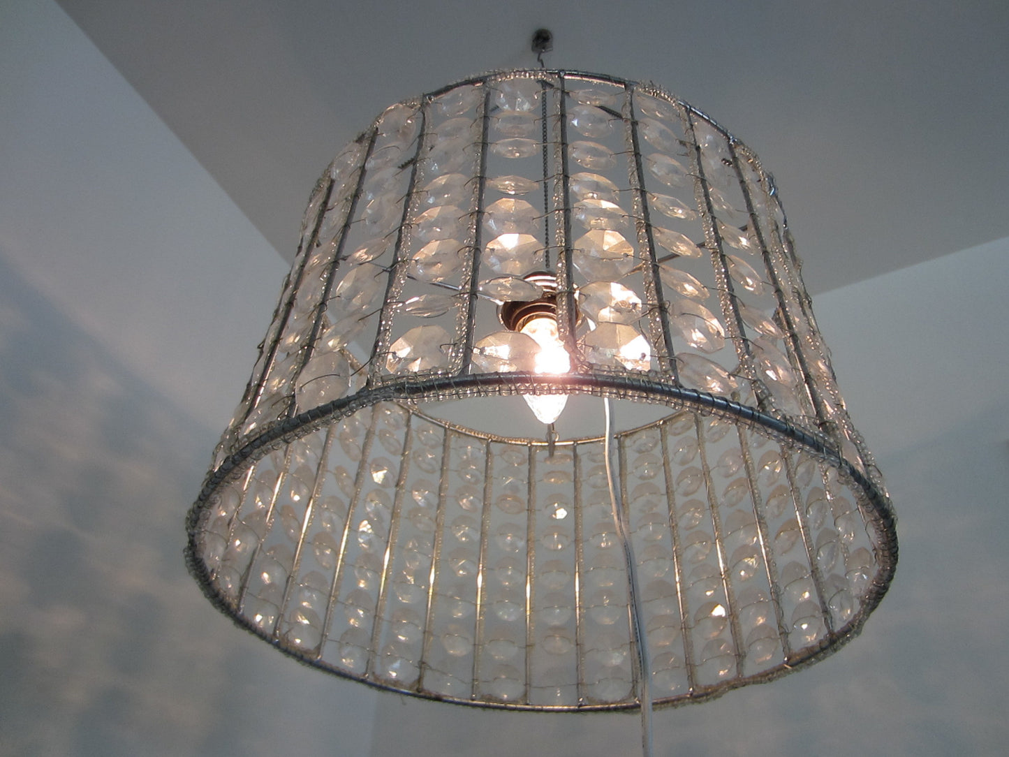 attractive chandelier, lantern, Drum pendant lamp designed with crystal like plastic or glass retro style beads. beautifully hand crafted weaved and sewn over white metal, shining the room on diagonal cross chains in white metal. it has a boho feel with sweet flair. Excellent Condition, good looking fresh light noted on the pictures measuring: