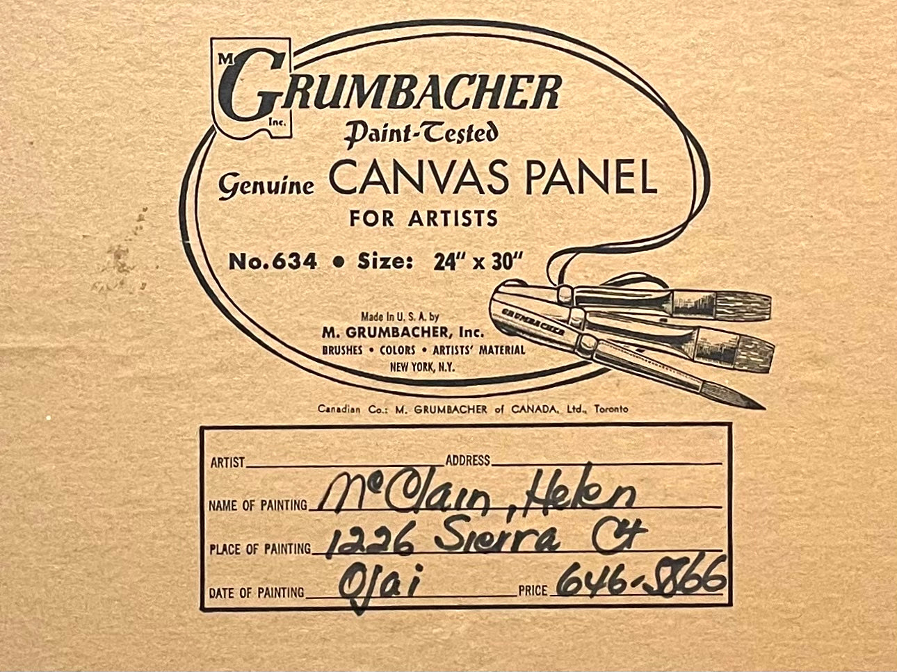 Helen McClain was born in 1916 in Yakima, Washington. Attended high school in Los Angeles, California, and graduated from UCLA in 1939. Helen McClain married on 1941, and moved to Ojai with her husband. For 25 years in Ojai artist was active in local community and her involvement with Garden Club in Ojai was part of local art league. Artist died in July 30, 2012. Part of her life was her move to Laguna Woods to be with her family upon death of her husband.