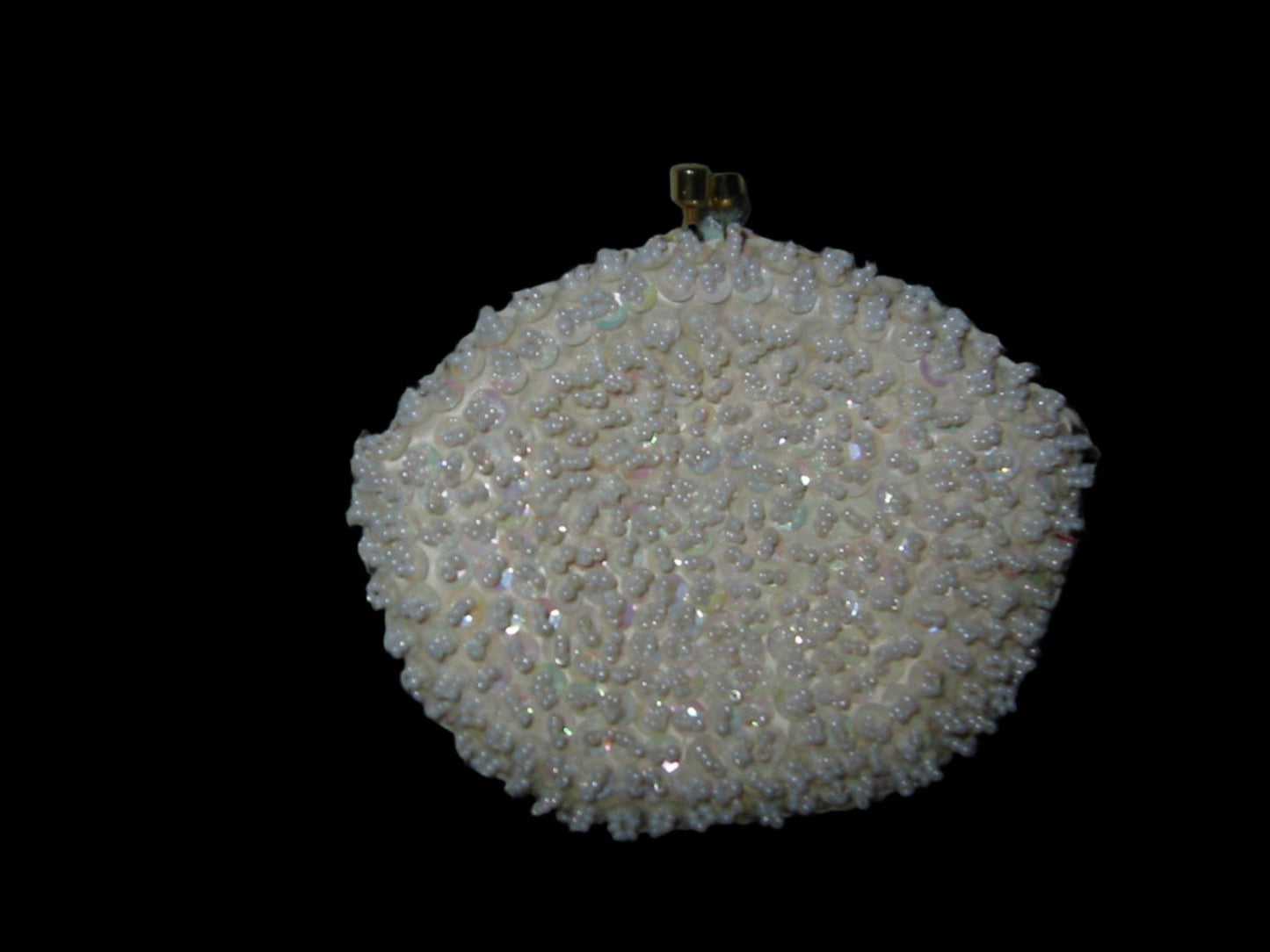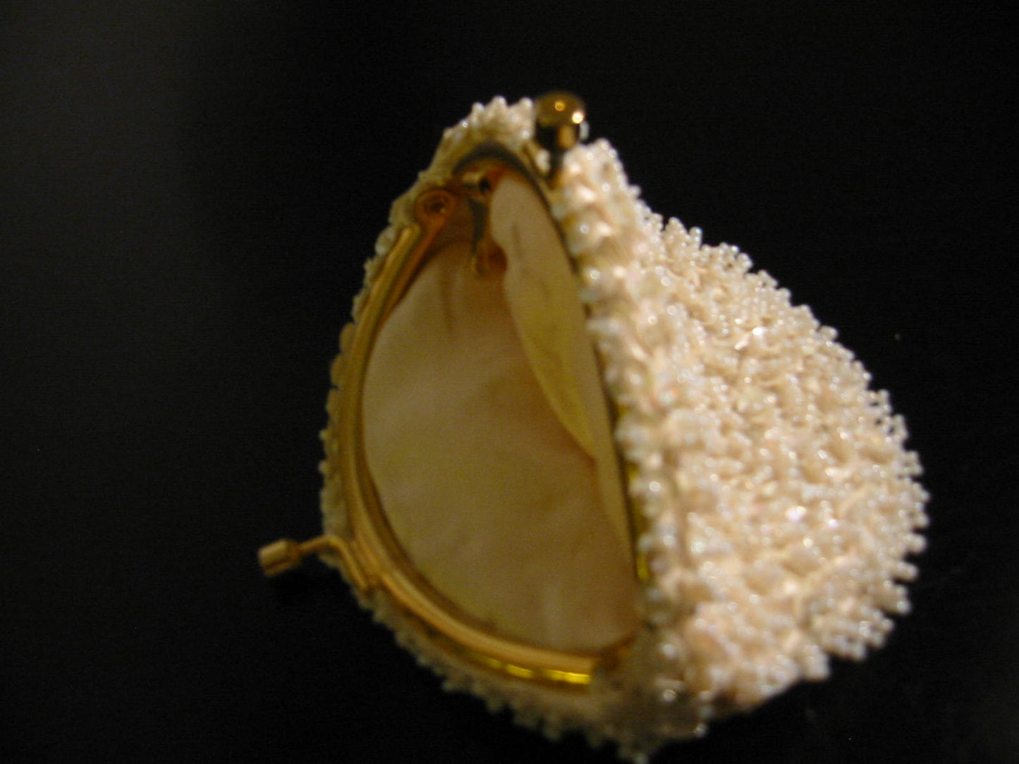 A cute clutch/coin purse designed white shiny sequence, micro beads, with brass frames, closure. Excellent condition, with label noted Hollywood Shagee of California. 4" x 5" and quite stunning & stylish. Silk lined with sewn label, made in Hong Kong.