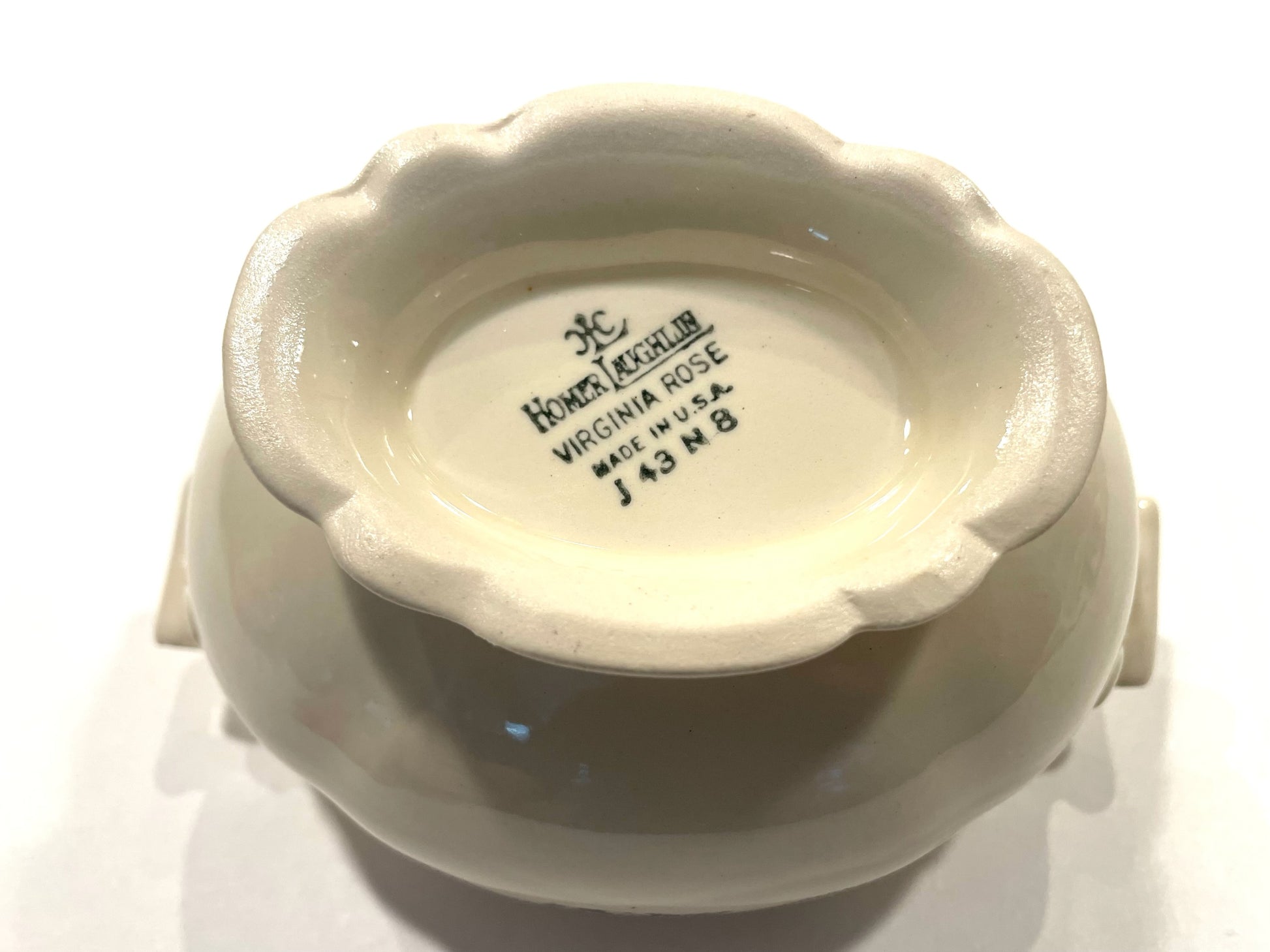 The Virginia Rose Design of Homer Laughlin china set was made around 1929 - 1970's. Silver, hand made, with floral finial, and handles. Made in USA with production numbers J 42 N 8 and J 43 N 8 . good looking addition to your breakfast tables. The Shapes are oval and the bowls are for creamer , covered sugar. Each is 6.5" x 5.5" x 4" x 3" x 2.5" Overall, with handles. Attractive chains and flowers Virginia Rose Pattern. Excellent condition. Will brighten holiday tables.
