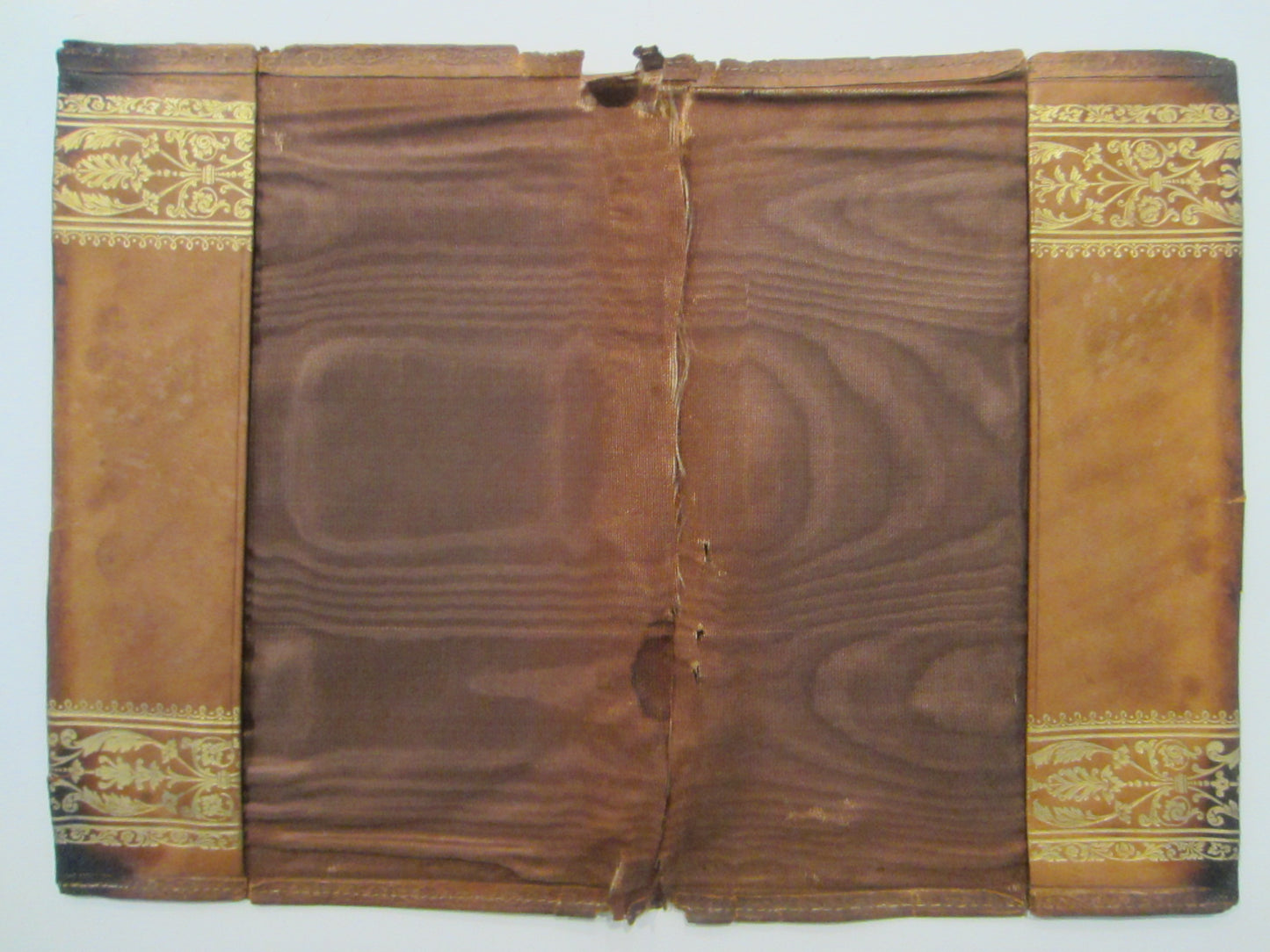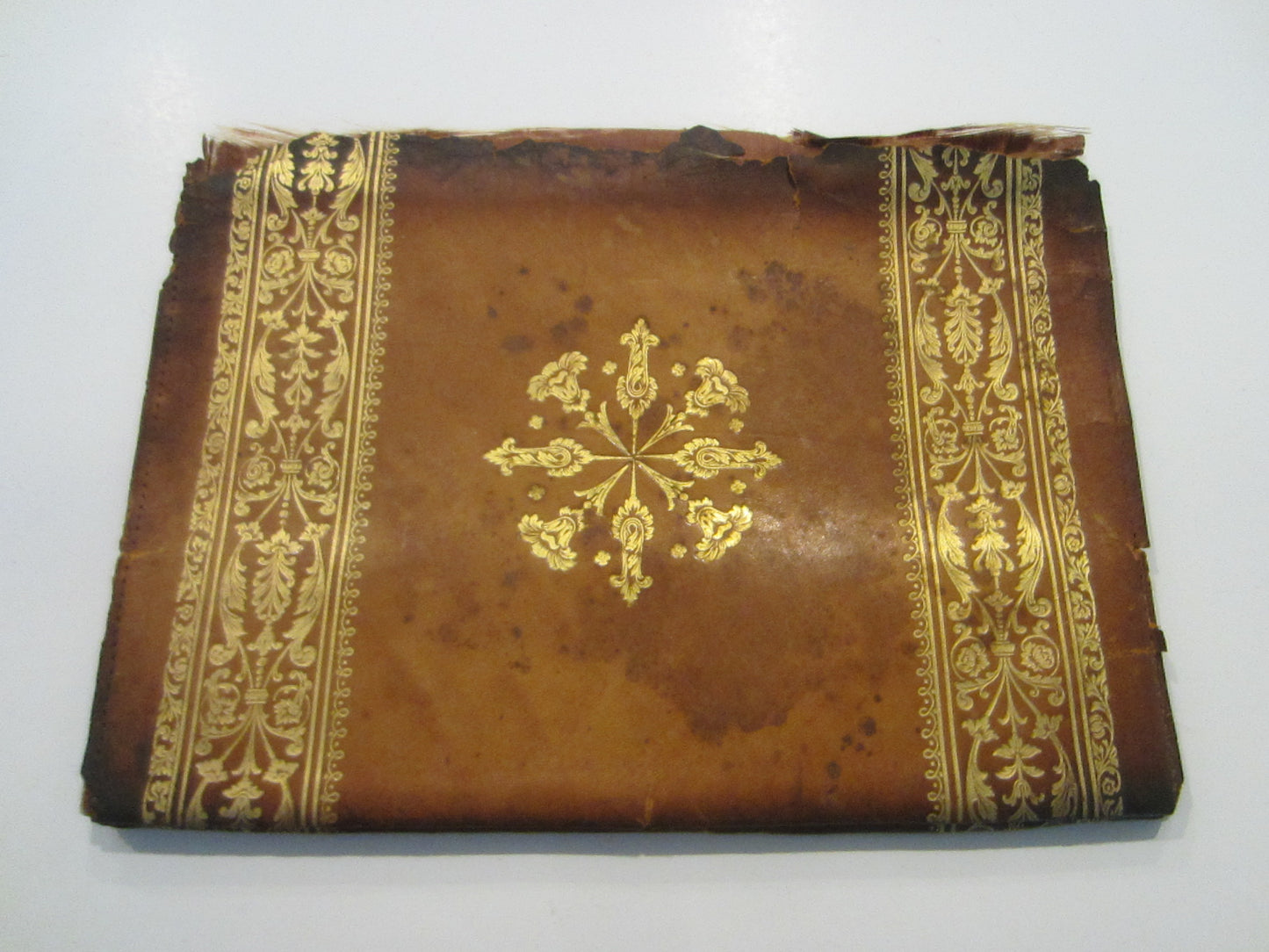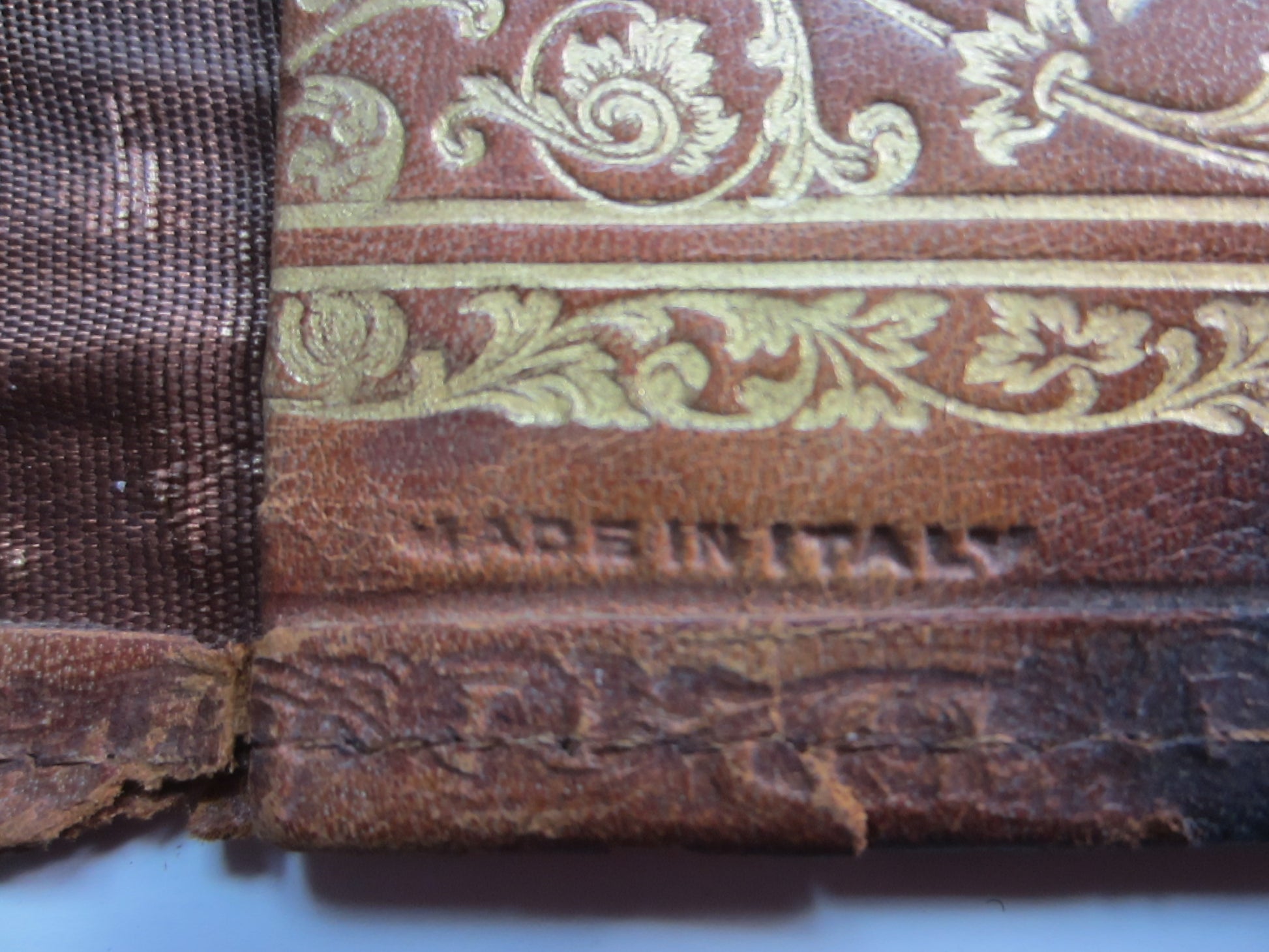 The color and ornamentation is magnificent. Distressed separated pieces of gorgeous tan leather book cover. Made in Italy, and is marked on the interior very low end. Very vintage if not antique. The gold embossed is exciting and is a show case of arts and crafts movement. Obviously as noted on the images is distressed with imperfections. Interior is of wavy patterned fabric silk or else. Uniquely Decorative