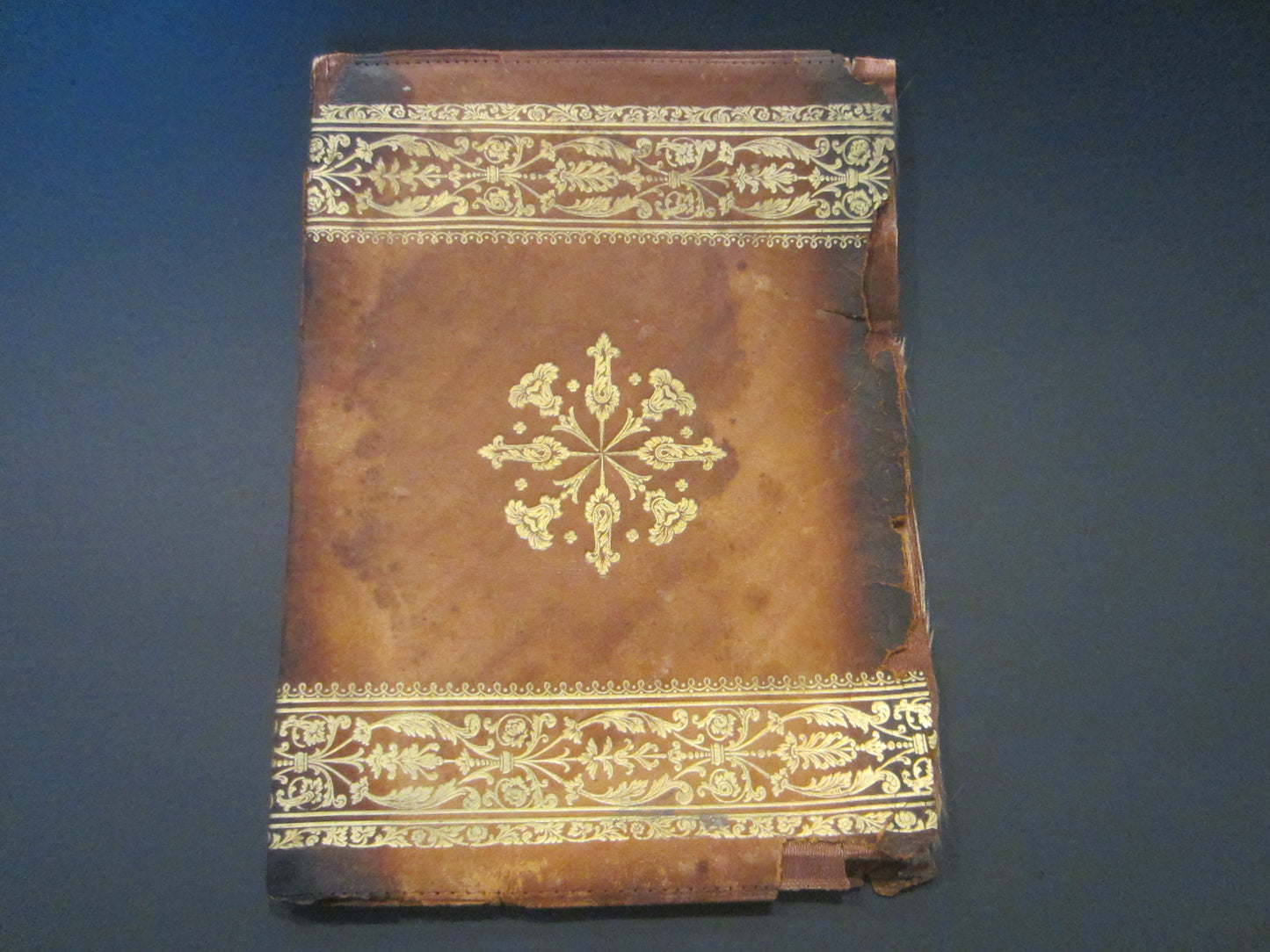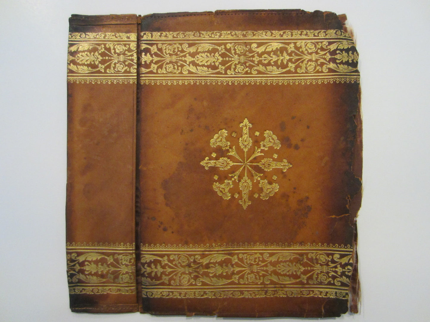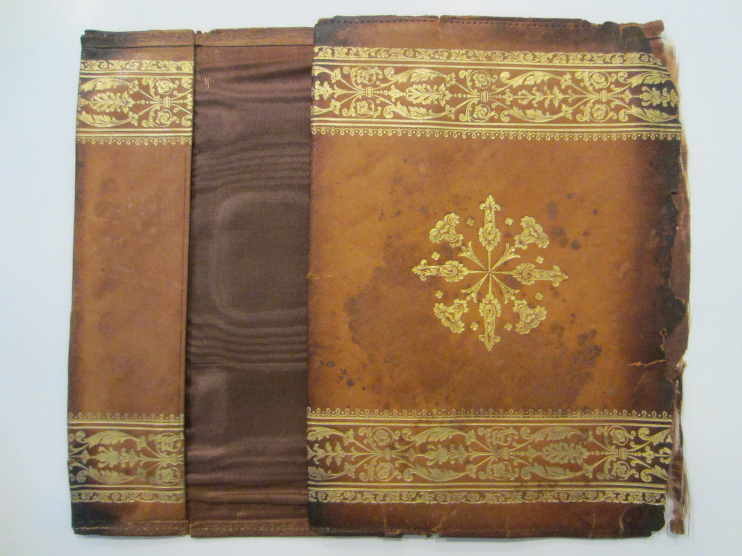 The color and ornamentation is magnificent. Distressed separated pieces of gorgeous tan leather book cover. Made in Italy, and is marked on the interior very low end. Very vintage if not antique. The gold embossed is exciting and is a show case of arts and crafts movement. Obviously as noted on the images is distressed with imperfections. Interior is of wavy patterned fabric silk or else. Uniquely Decorative