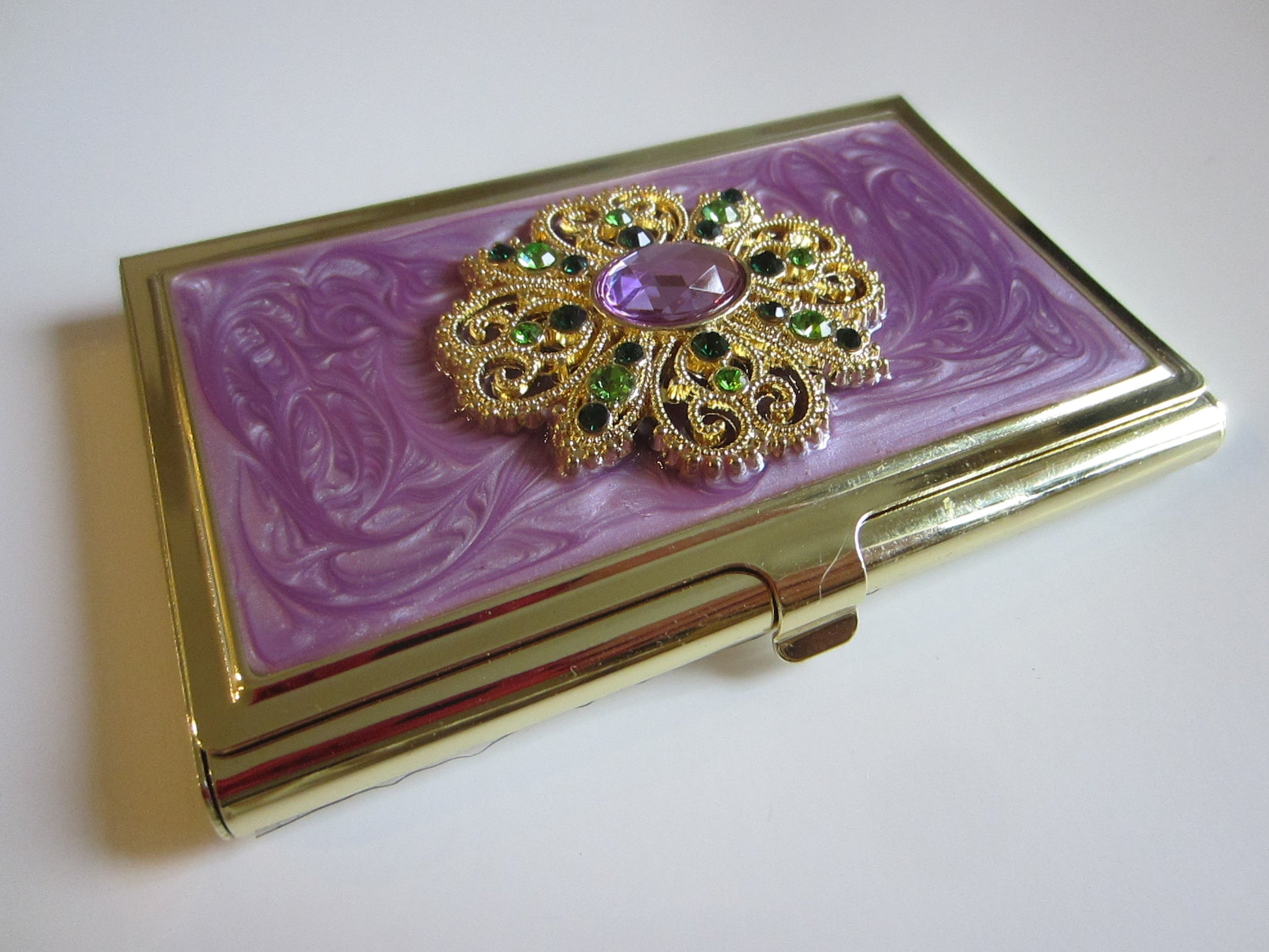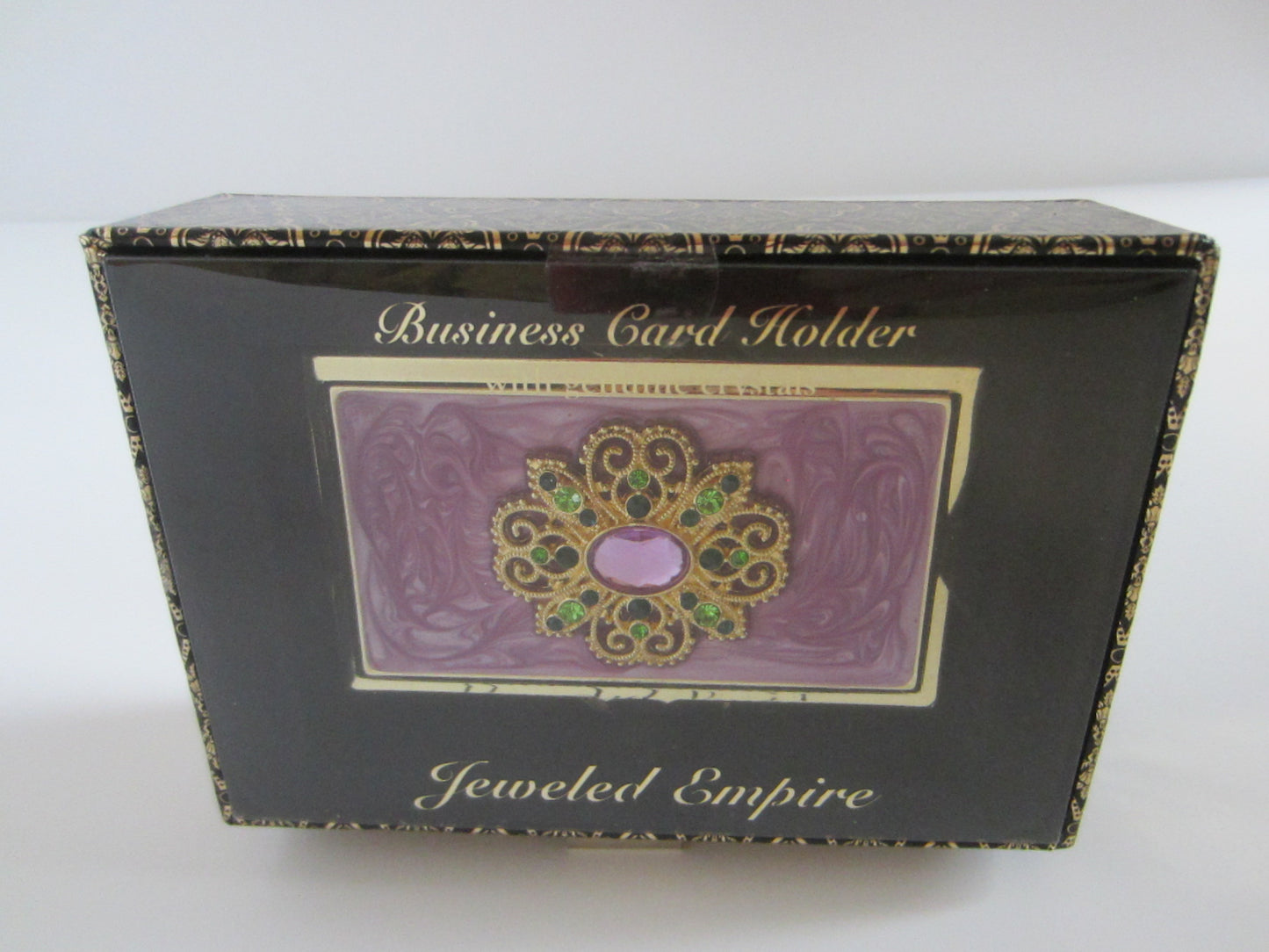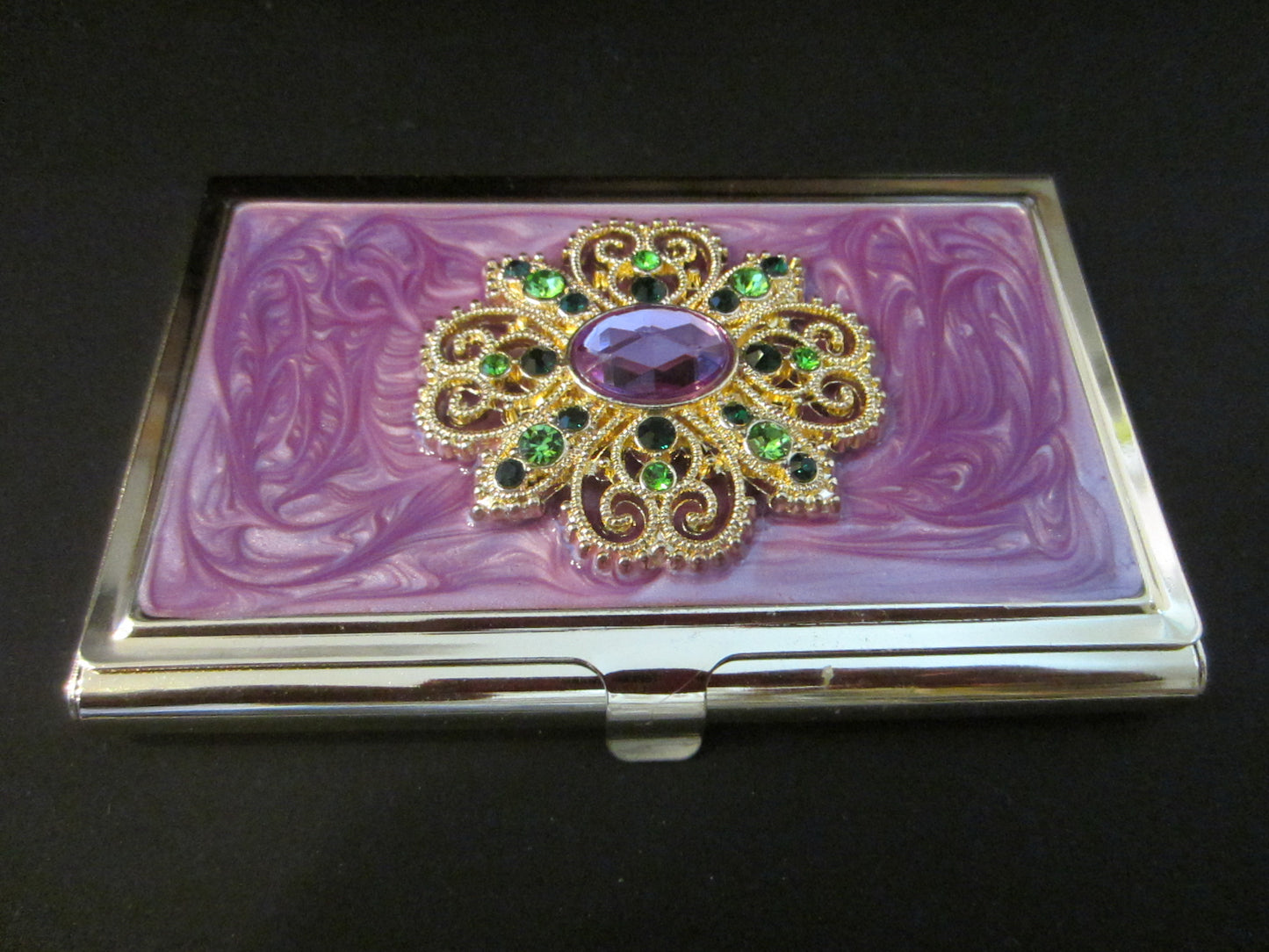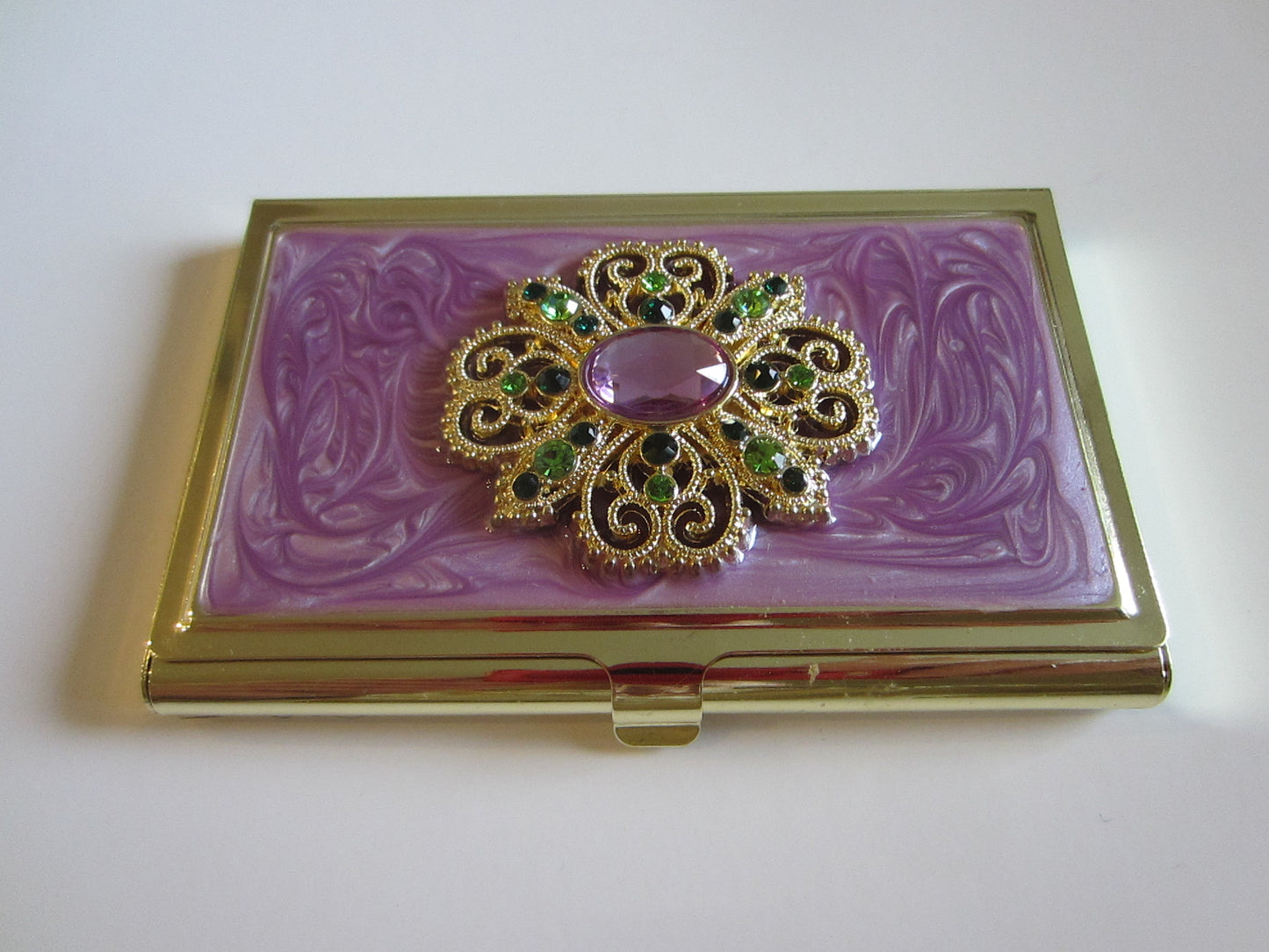 it's modern, glitzy, and good looking. a business card holder of swirl, large lavender cabochon, and small green, purple accented crystal center medallion, over golden metal case. nested in a gold and black pattern box. fabulous condition, one scratch on verso. box is 1.5" h. x 5.5" w. x 3.5" sides. card holder is about 3" x 2" x .25". it would make a great surprise gift for someone we love. on the box over a clear top states " Business Card Holder with genuine crystals, Jeweled Empire.