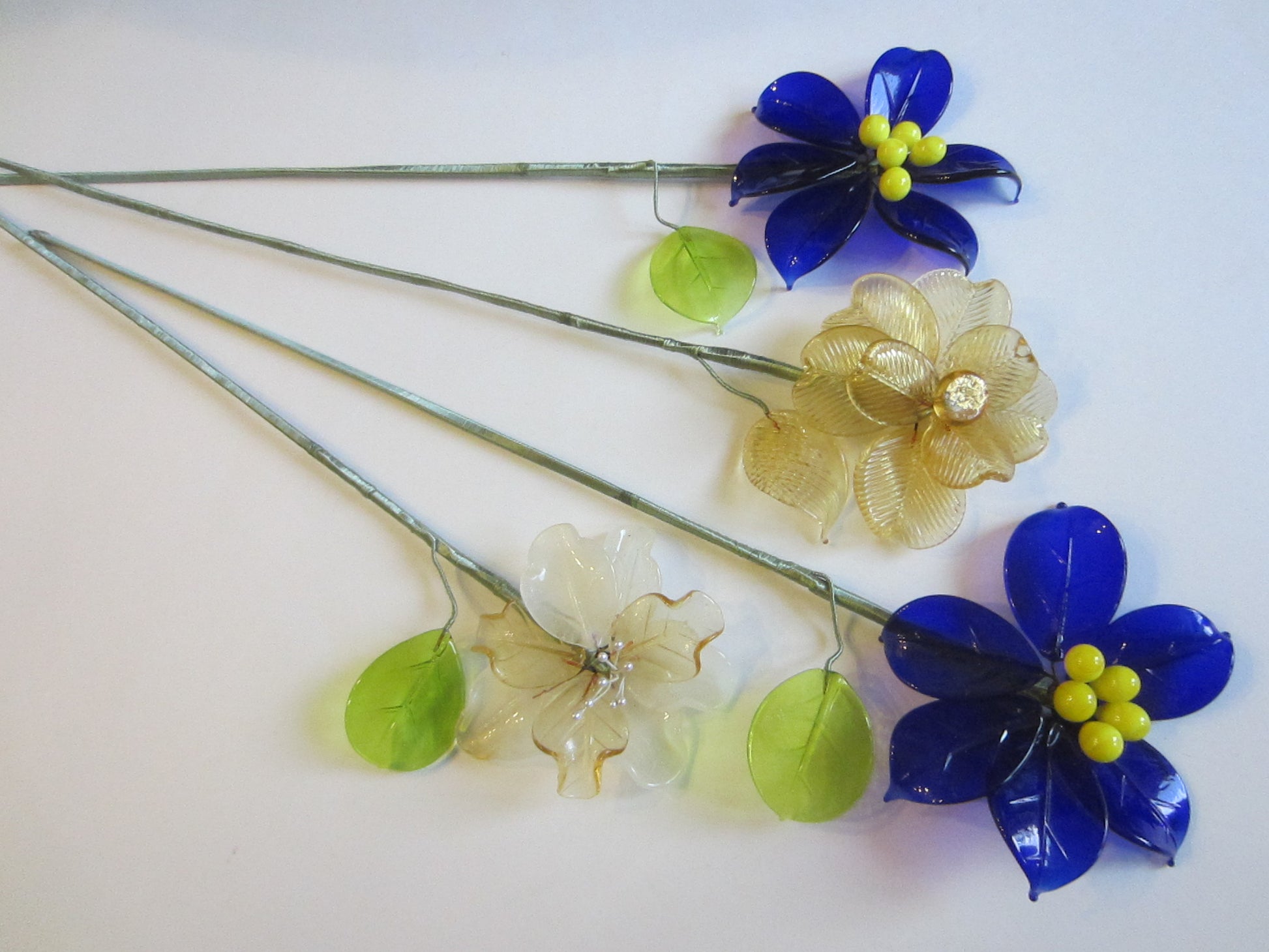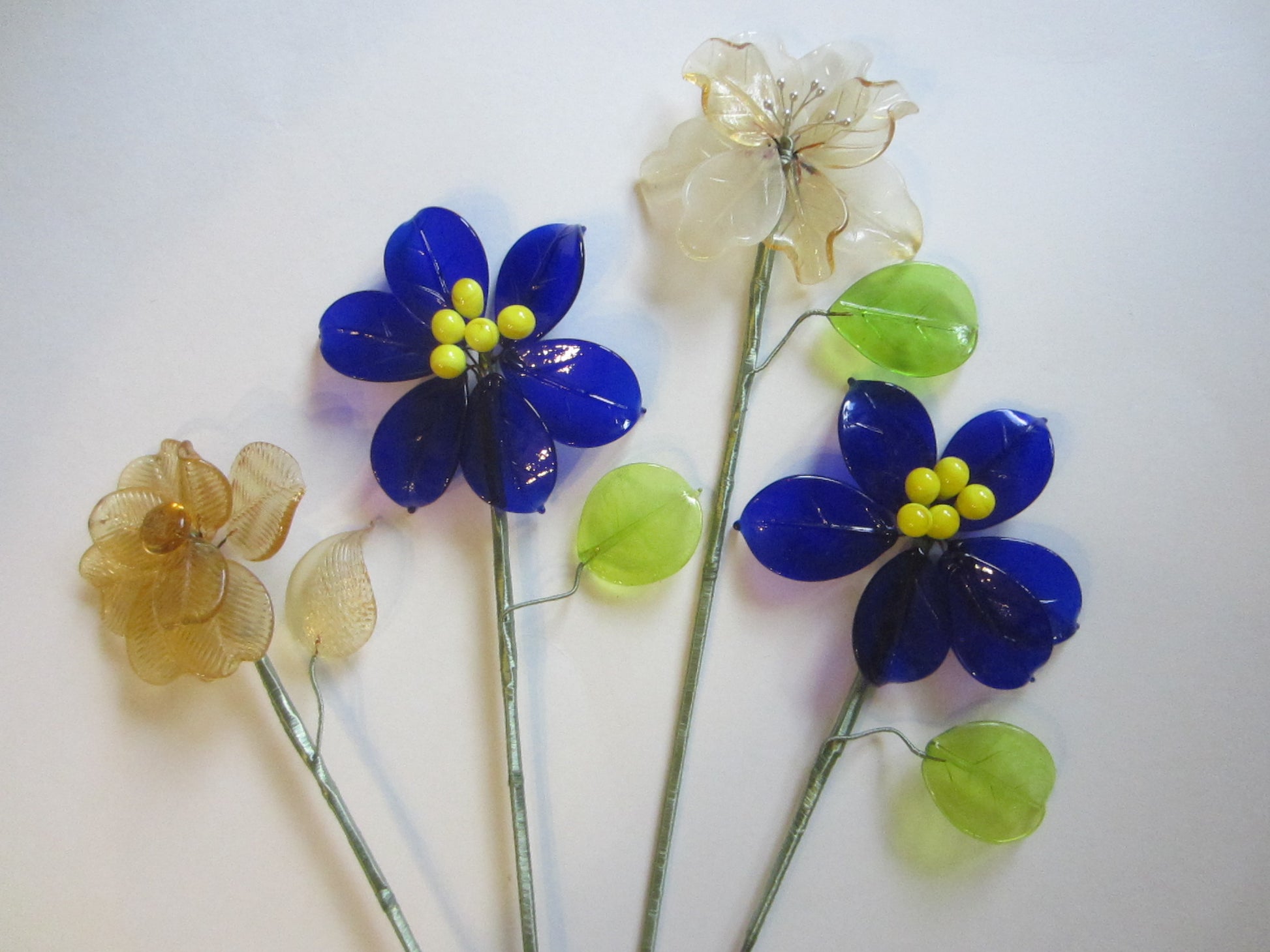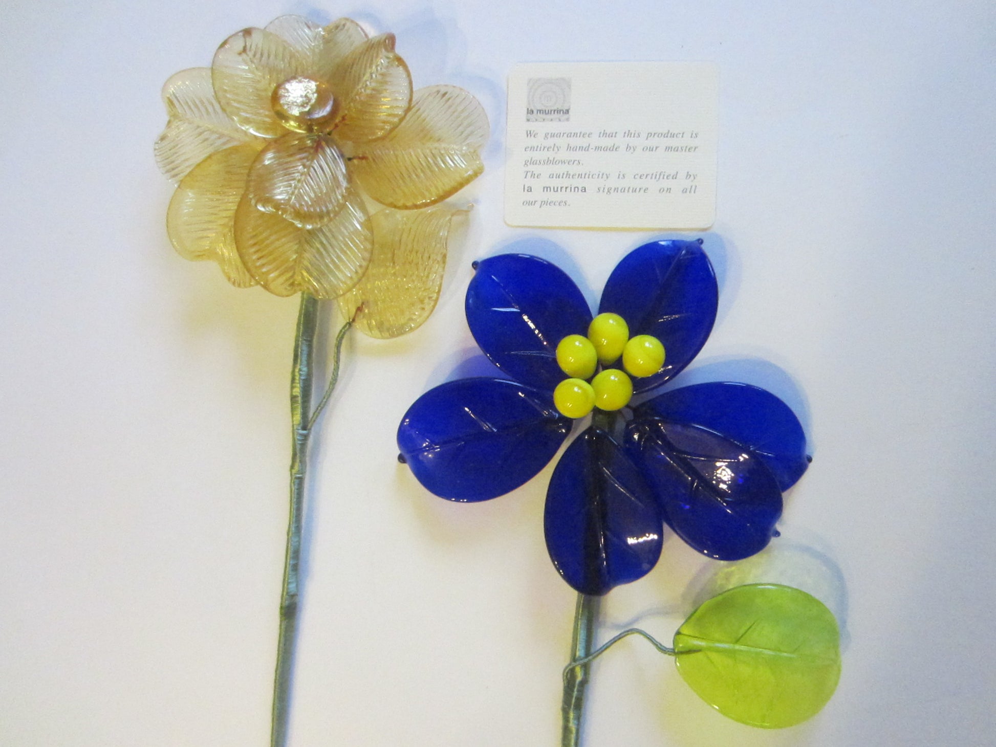 Four striking blue, gold, stemmed flowers, green leaves, delicate glass petals. Hand made, blown by La Murrina Murano master blower artist in Italy. Beautifully, delicately signed in script. Came with certificate of authenticity card, noted on the images. Two stunning vibrant deep blue petals, accentuated yellow glass beads. , Two gorgeous gold decorated pearls, and gold button beads. They look magnificent, to display. Suggested tall clear crystal vase, in your foyer table, entry, coffee, or dinning table etc... Stems are wrapped meticulously in green silk thread, are secured in golden metal filigree closures. All in superb condition. Two are 5" wide, and 21" tall, the other two are 19" tall, and 4" wide. They are gorgeous modern, contemporary and decorative, from the Island of Murano in Italy, in the 90's. Uniquely Found.