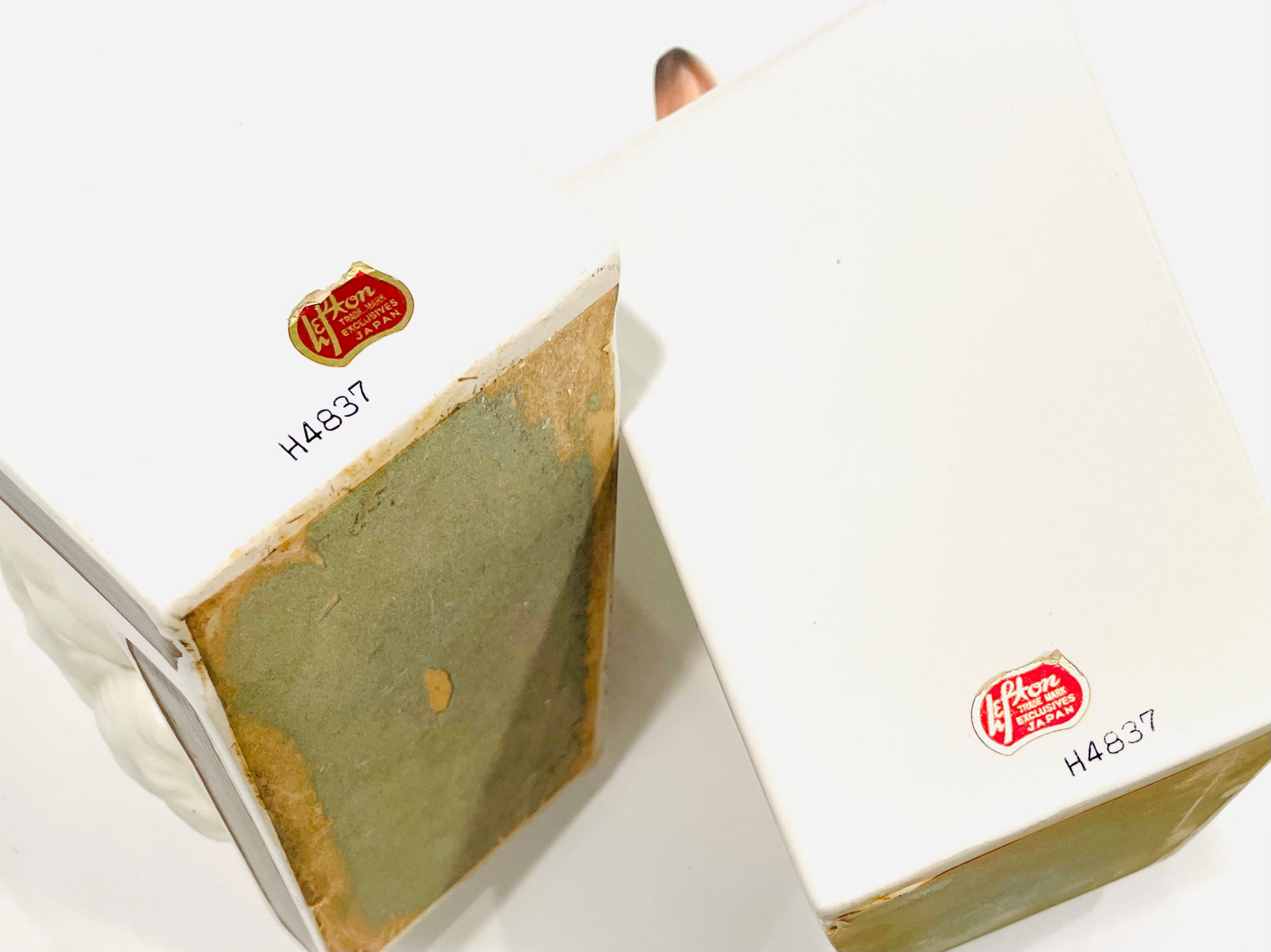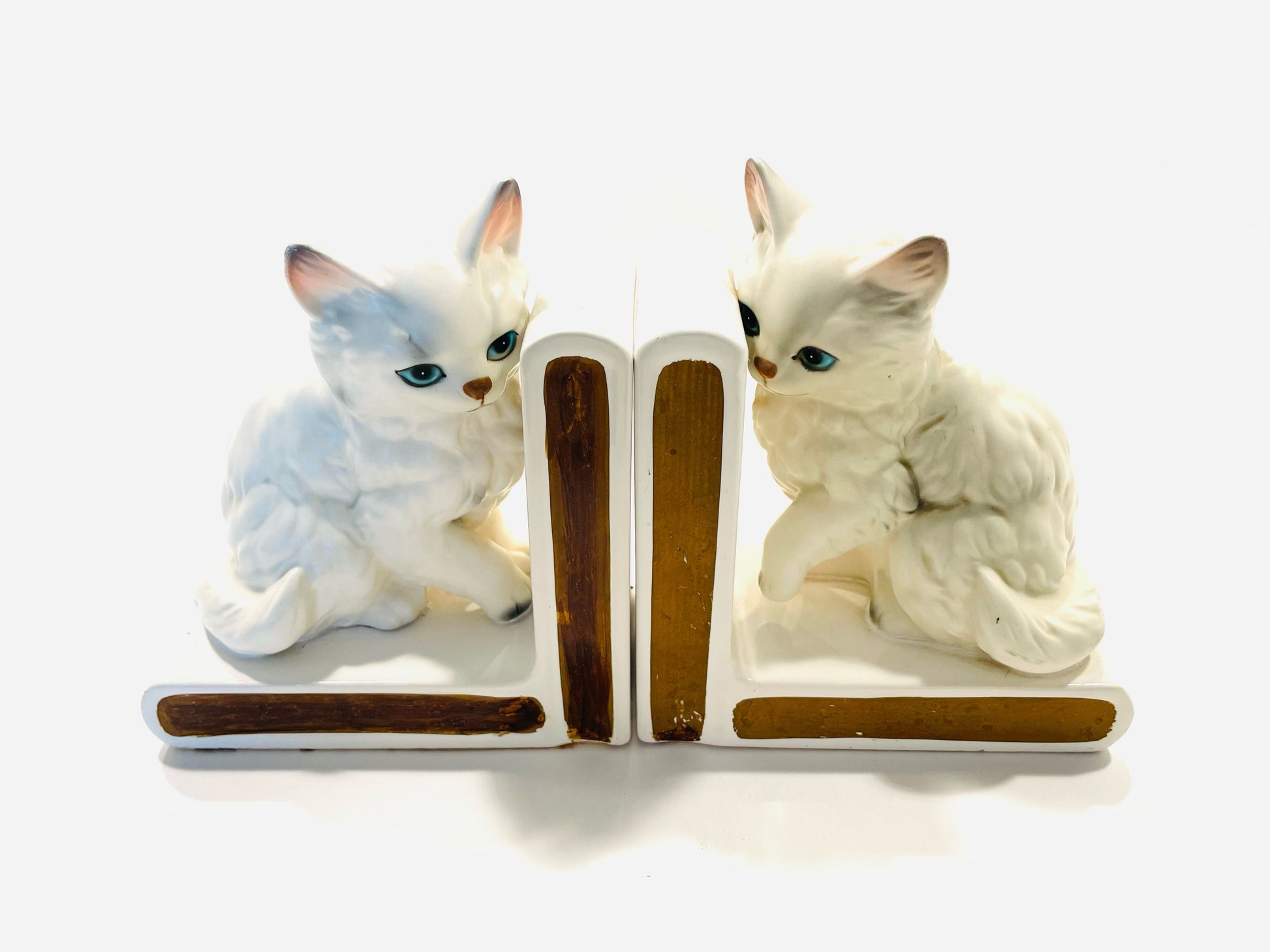 Super cute blue eyed shy porcelain Cat bookends in white, hand painted, labeled, numbered. Exclusively Made in Japan by Lefton in gold and red embossesd stickers. They are sitting on a book, and in excellent condition. Lefton Exclusive Japan H4837. A tiny imperfect behind one ear (image)