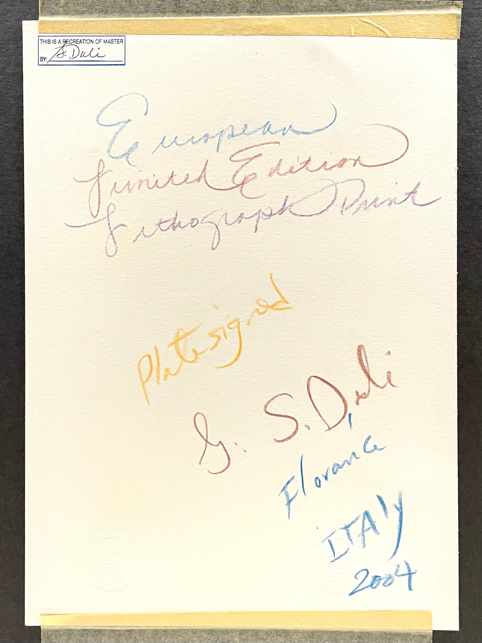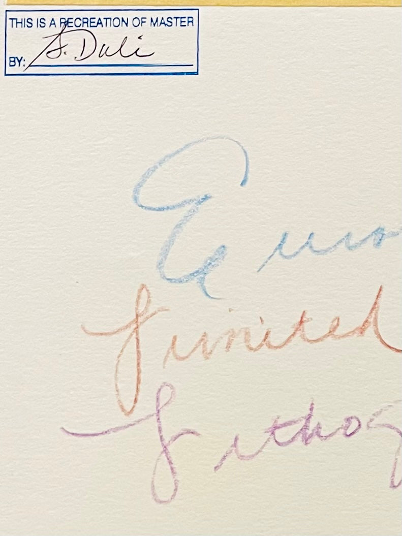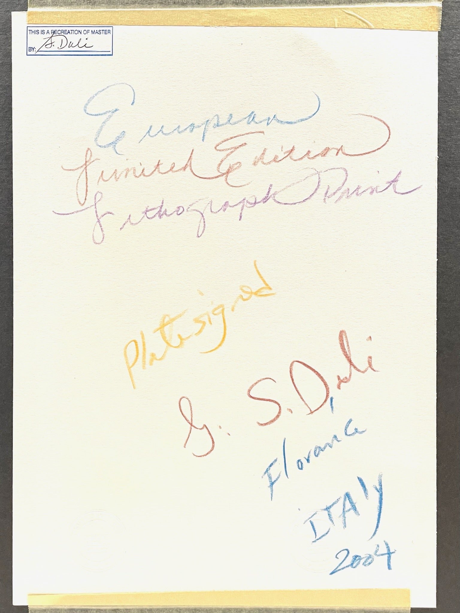 Melting clock also known as Tearful Softwatch. Likely an offset lithograph Attribute to Salvador Dali , the surrealist most famous scene from art deco era 1930's. The art is on paper gouache to be noted. It has multiple marks, and produced in Florence Italy 79 as indicated on the verso. , and appears to be a limited edition with plate signed S. Dali, with embossed seal indicating on the text Recreation of Master. Limited Edition 66/500