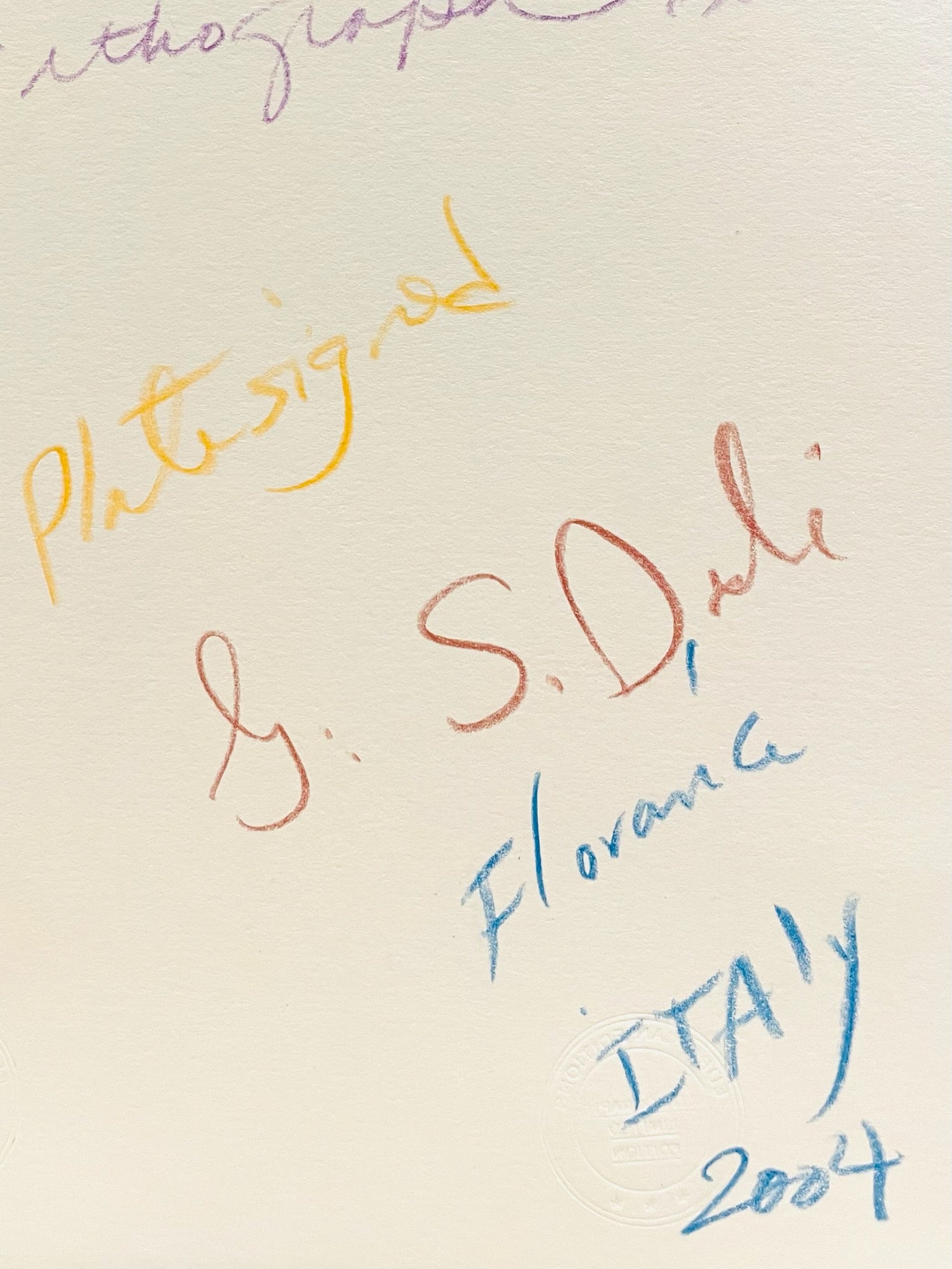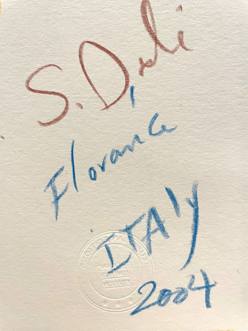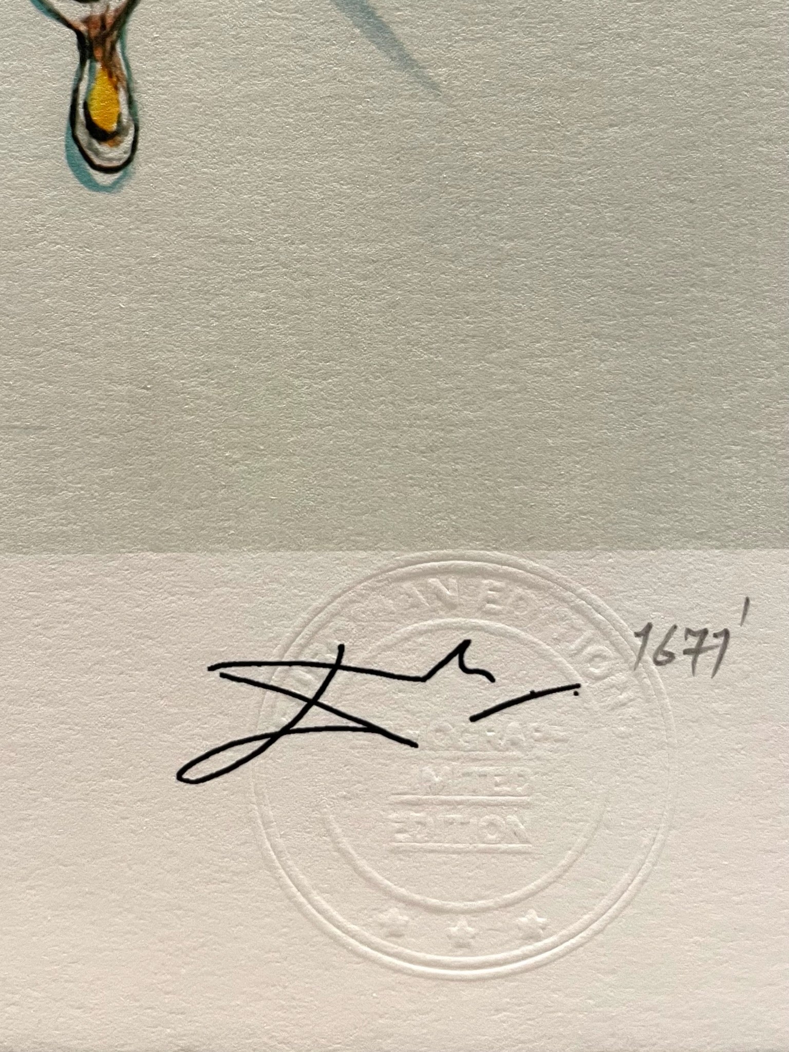 Melting clock also known as Tearful Softwatch. Likely an offset lithograph Attribute to Salvador Dali , the surrealist most famous scene from art deco era 1930's. The art is on paper gouache to be noted. It has multiple marks, and produced in Florence Italy 79 as indicated on the verso. , and appears to be a limited edition with plate signed S. Dali, with embossed seal indicating on the text Recreation of Master. Limited Edition 66/500