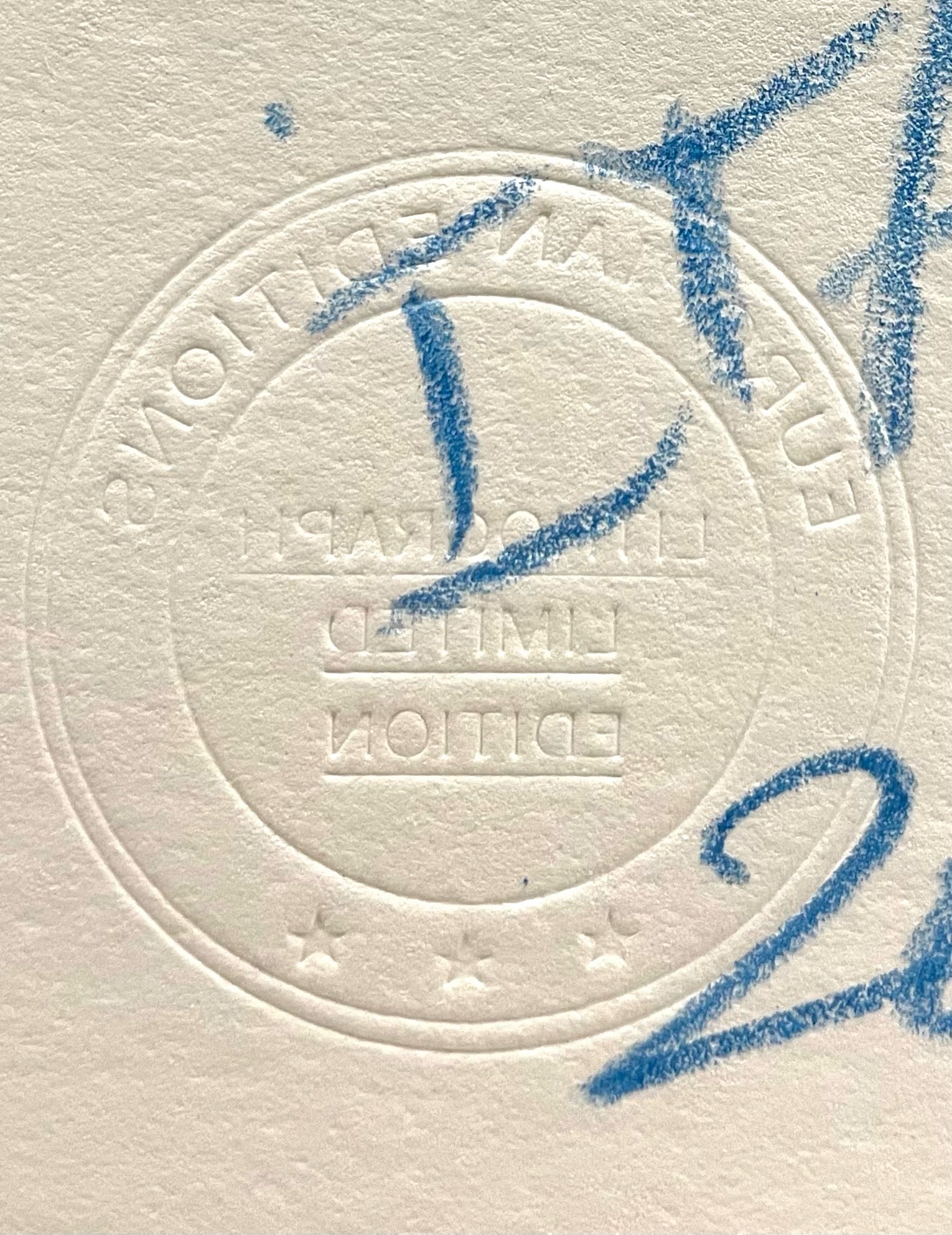 The art is in excellent condition, not being examined for authentication. Matted with multiple texts and numbers. PP means print proof, and double embossed seals on both sides. texts appears to be in pencil. The colors of blue and orange against off white creates drama.