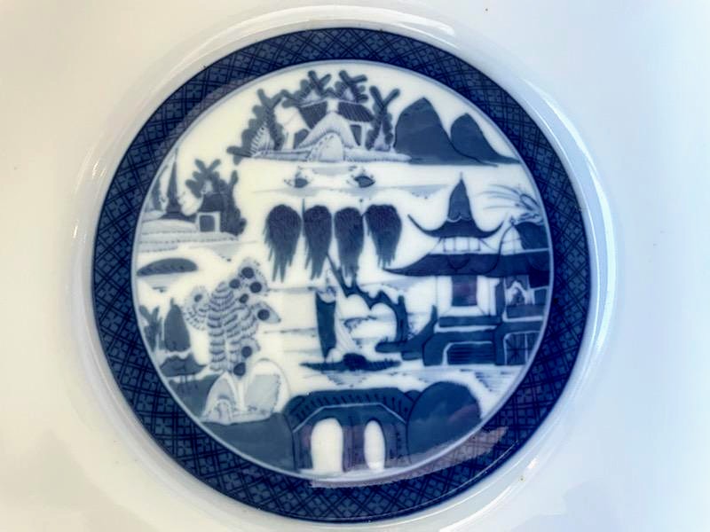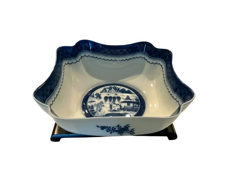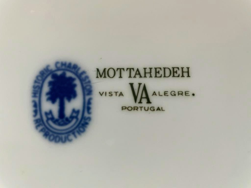Mottahedeh , a known name in fine decorative porcelain & pottery quality field. Four corners bowl design bowl in white and blue medallion, floral design interior & exterior also blue lines and boarders , with 9" w., 3.5" h. transferred Japanese scene. Excellent condition. blue stamp mark, symbol, noted , Vista Alegre Portugal.Historic Charleston Reproduction.